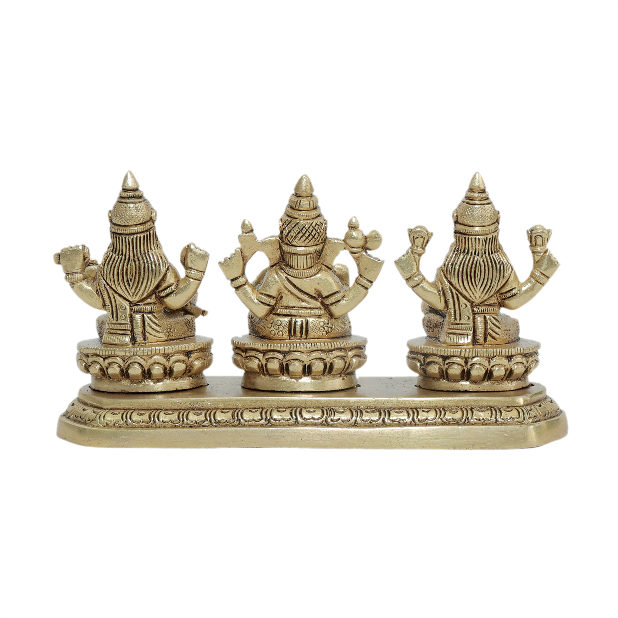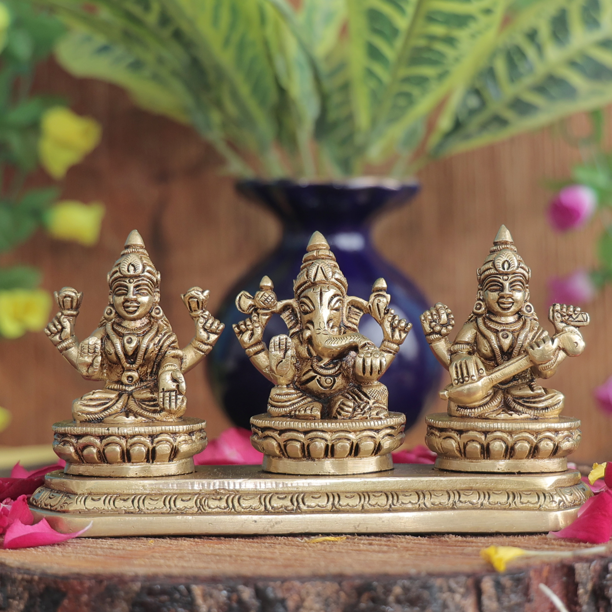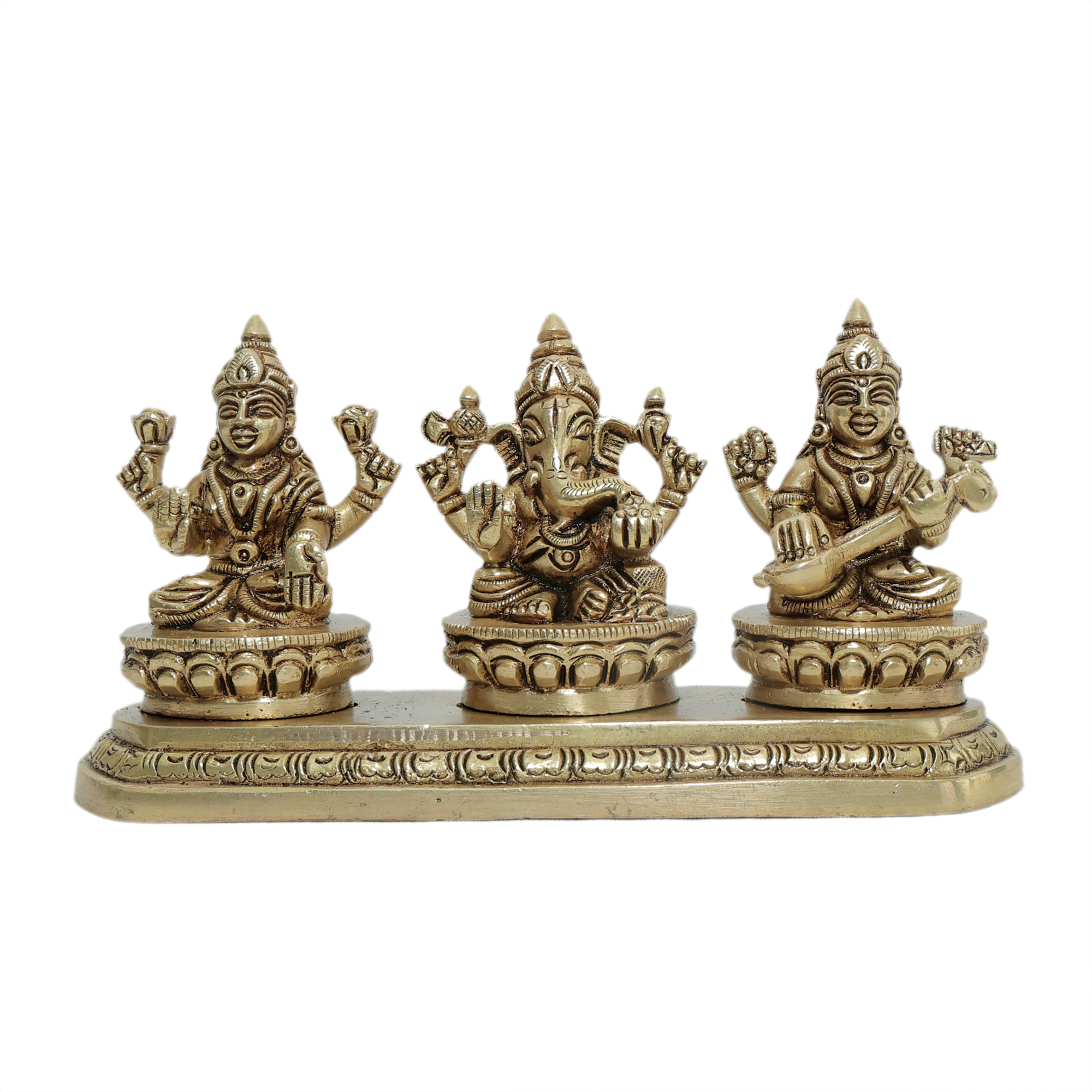 Brass Ganesha-Lakshmi-Saraswati Tridevi Murti - Divine Trinity Idol for Home Temple