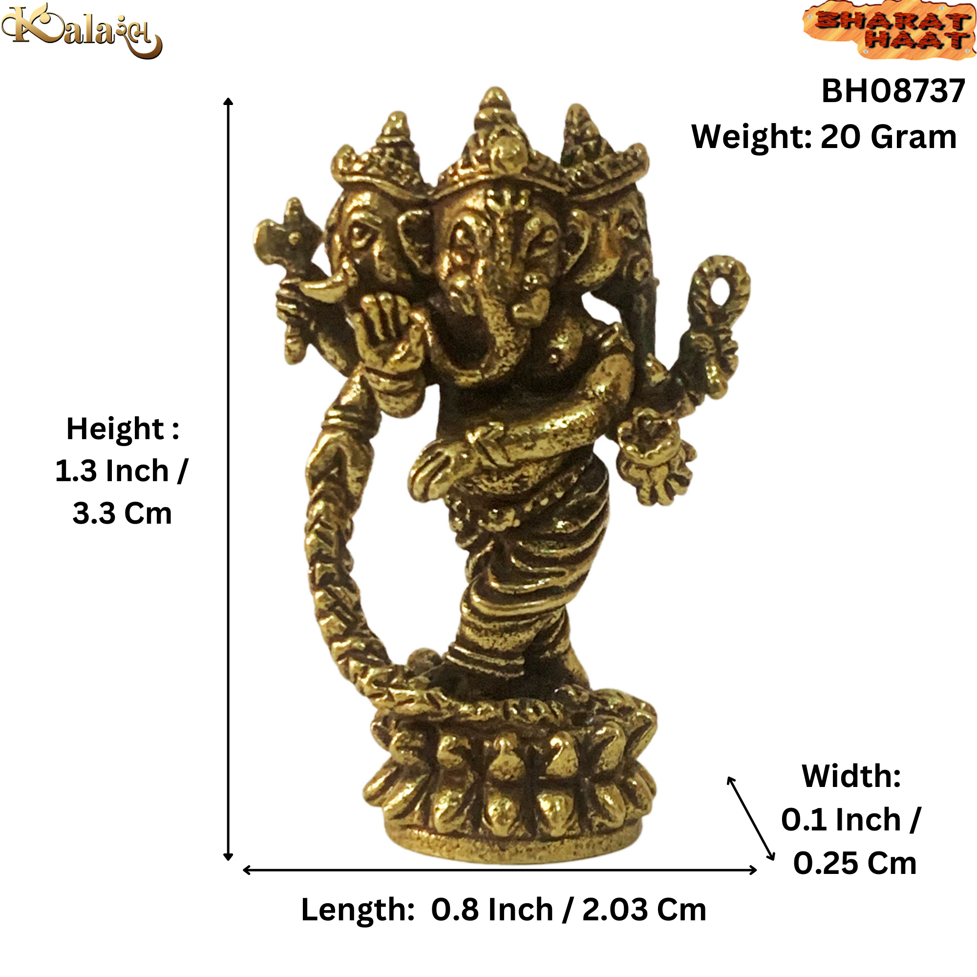 Expertly made from premium solid brass, this idol displays intricate detailing even in its compact size — 0.8 x 0.1 x 1.3 inch (2.03 x 0.25 x 3.3 cm) and weighs just 20 grams. Its golden sheen and fine craftsmanship reflect traditional Indian artistry, making it a symbol of purity and devotion.