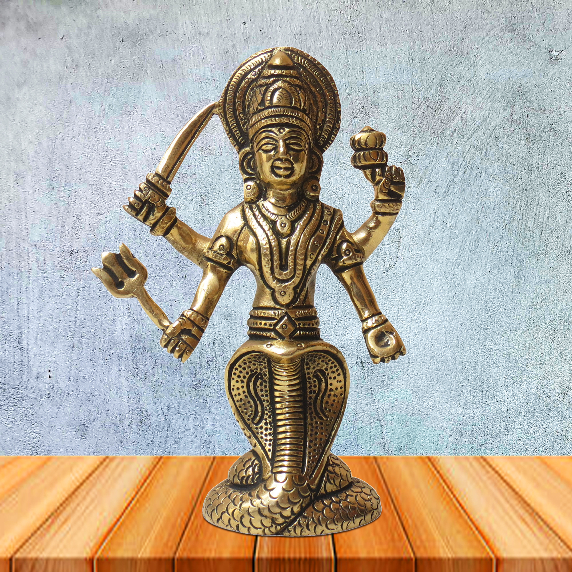 This idol is meticulously crafted from high-quality solid brass, featuring fine detailing that brings out the goddess’s serene expression, intricate ornaments, and divine posture. The antique finish enhances its traditional charm and makes it a beautiful piece for display in your home temple, living room, or office space.
