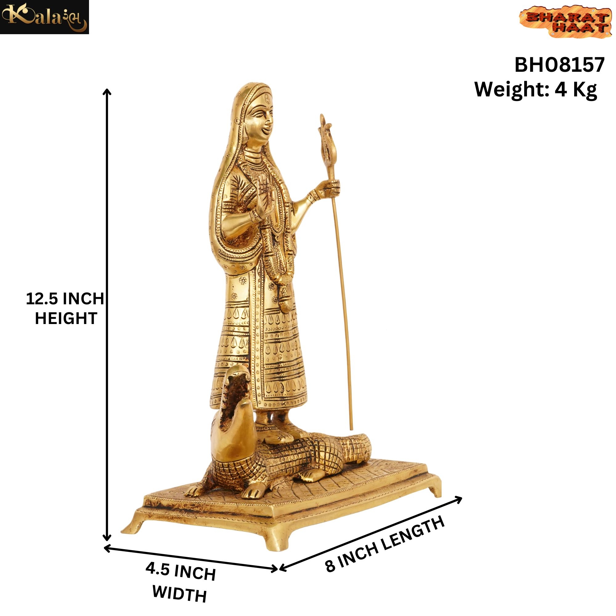 Made from premium-quality pure brass, this statue features intricate detailing and a polished golden finish, enhancing its elegance and devotional appeal. Measuring 8 x 4.5 x 12.5 inches and weighing 4 kg, it is a durable and prominent piece for any temple or home décor setup.