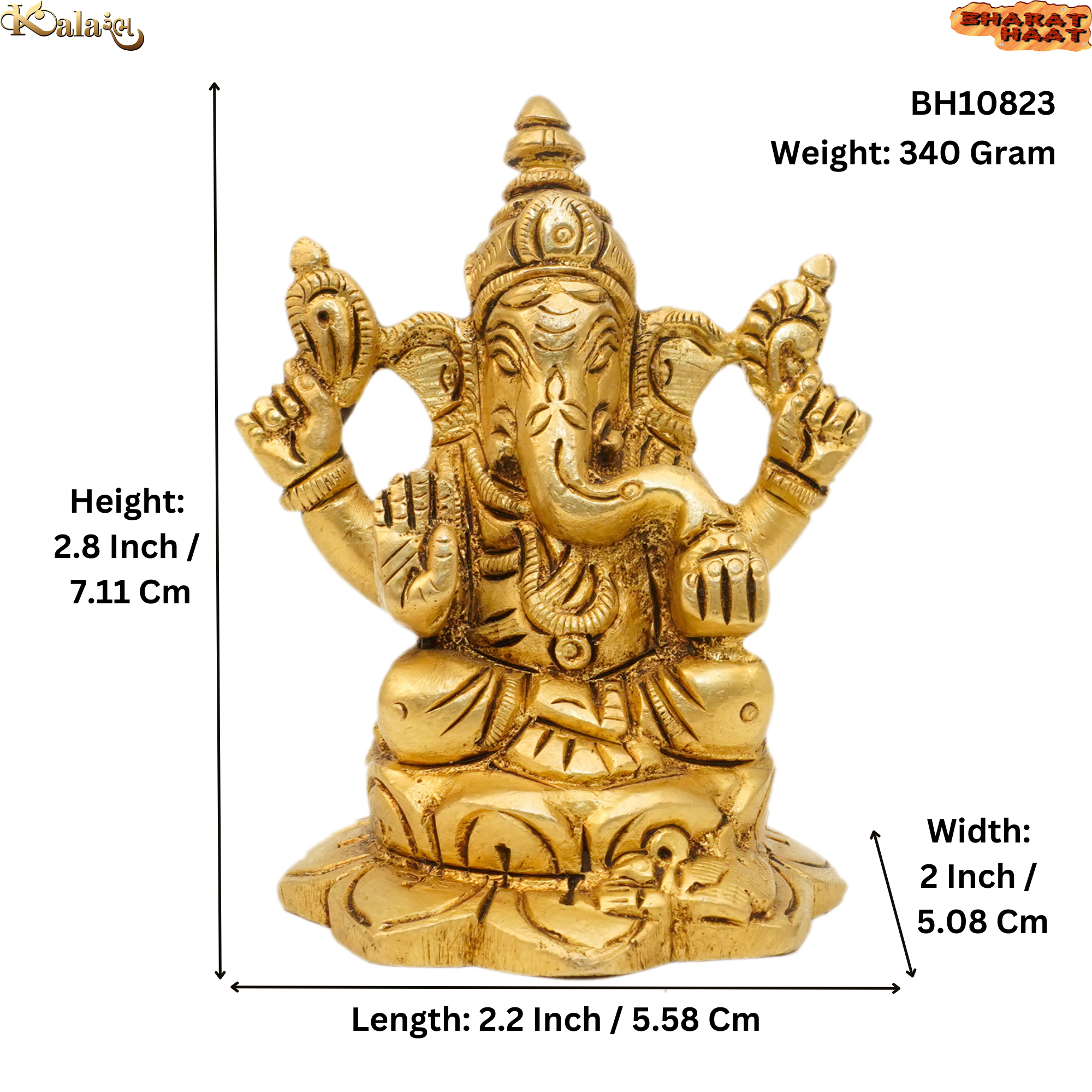 Crafted from high-quality solid brass, this Ganesha idol features intricate detailing and an elegant antique finish, reflecting the fine artistry of Indian craftsmen. With dimensions of 2.2 x 2 x 2.8 Inch (5.58 x 5.08 x 7.11 Cm) and a weight of 340 grams, it is ideal for home mandirs, office tables, study rooms, or living room décor.