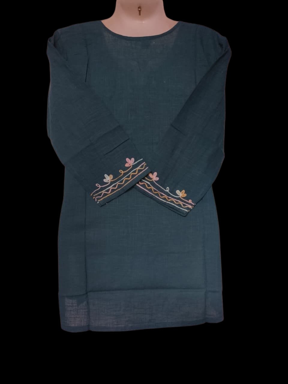 Color: Dark teal or blue-green.Fabric: Appears to be cotton or a similar natural fiber, based on the texture.Design: It has a round neck and three-quarter length sleeves. The neckline, front panel, sleeves, and side slits are adorned with detailed, multi-colored floral and leaf embroidery in shades of pink, orange, yellow, and white.Embroidery Style: The embroidery has a Kashmiri Aari or similar thread work style, with a distinct wavy or scalloped pattern along the cuffs and hem.