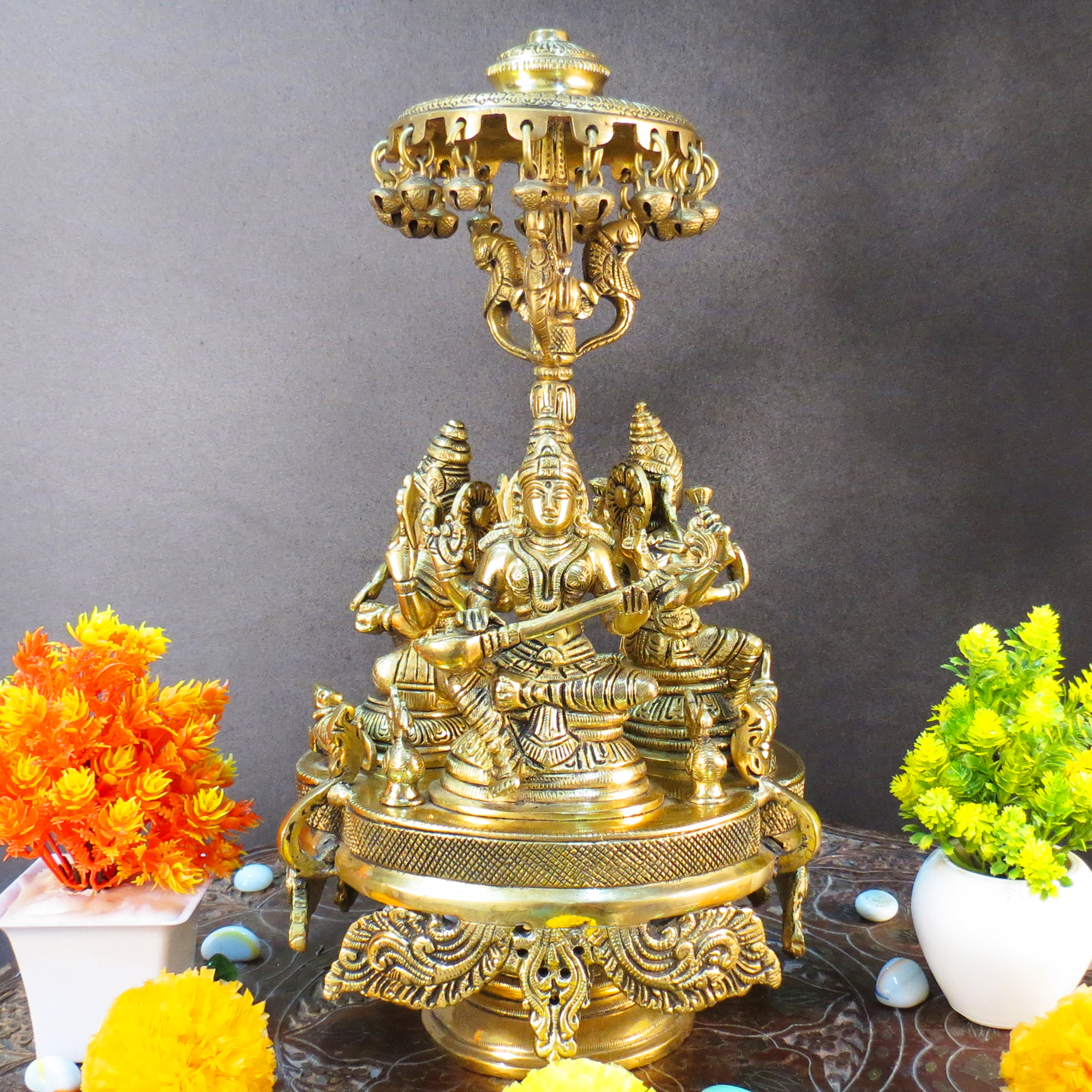 Brass Ganesh Laxmi Saraswati Trio on Majestic Singhasan – Invite Prosperity, Wisdom & Divine Blessings to Your Home!