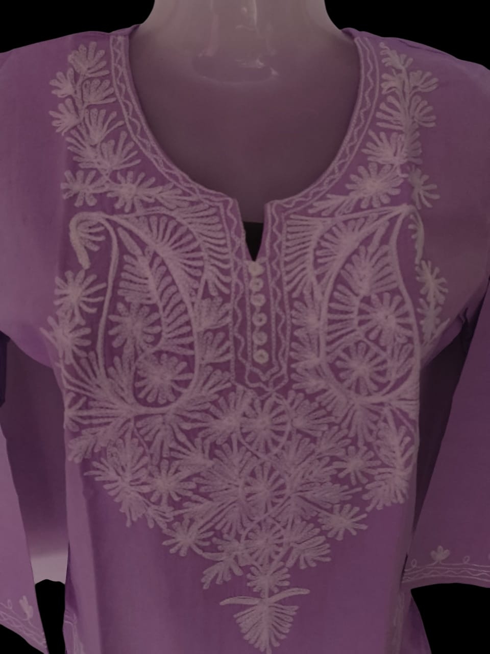 The kurti in the image is a short, pista green kurti with intricate white hand-embroidered Chikankari work.Based on the visual details and information from similar products, the key features of this kurti are:Style: A short-length, straight-cut kurti with a round neck and three-quarter sleeves. Color: Pista green. Fabric: The material is likely a soft, breathable fabric such as rayon or cotton, which is common for this style of garment. Embroidery: The primary feature is the detailed hand embroidery, identified as Chikankari, which is a traditional style from Lucknow. The white thread work features intricate floral patterns on the front yoke, sleeves, and hem.