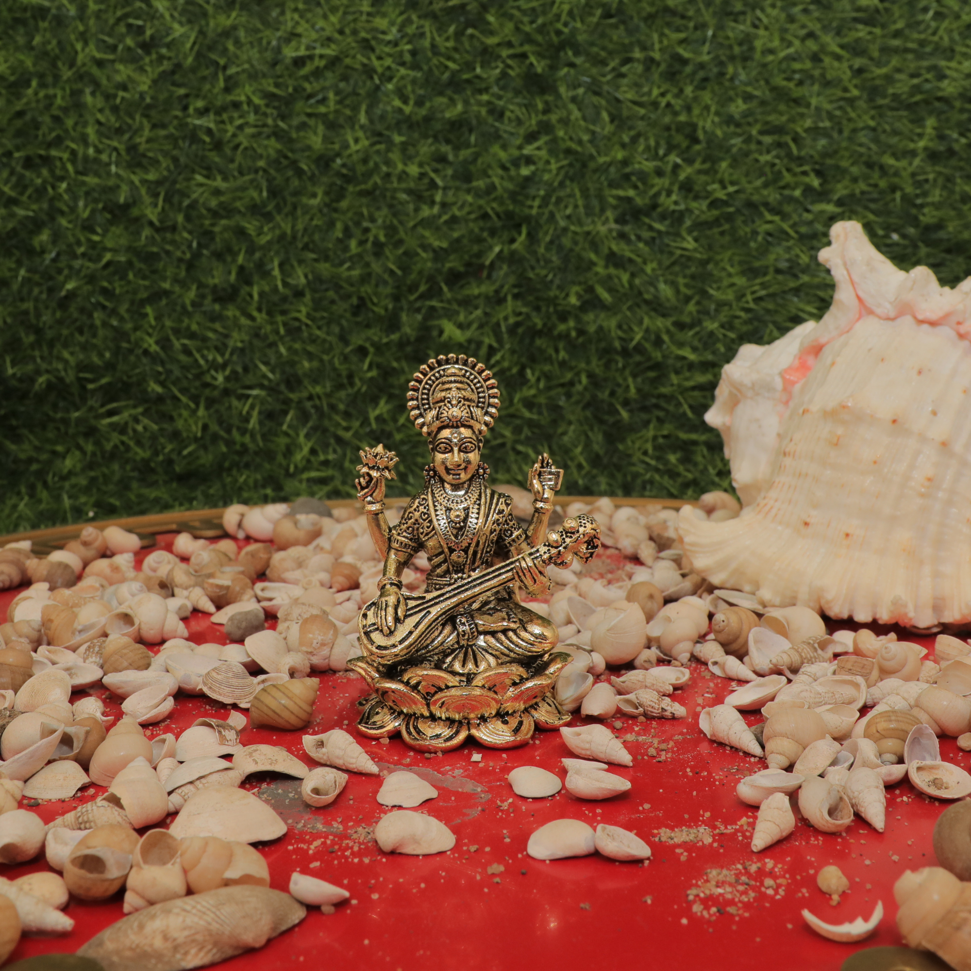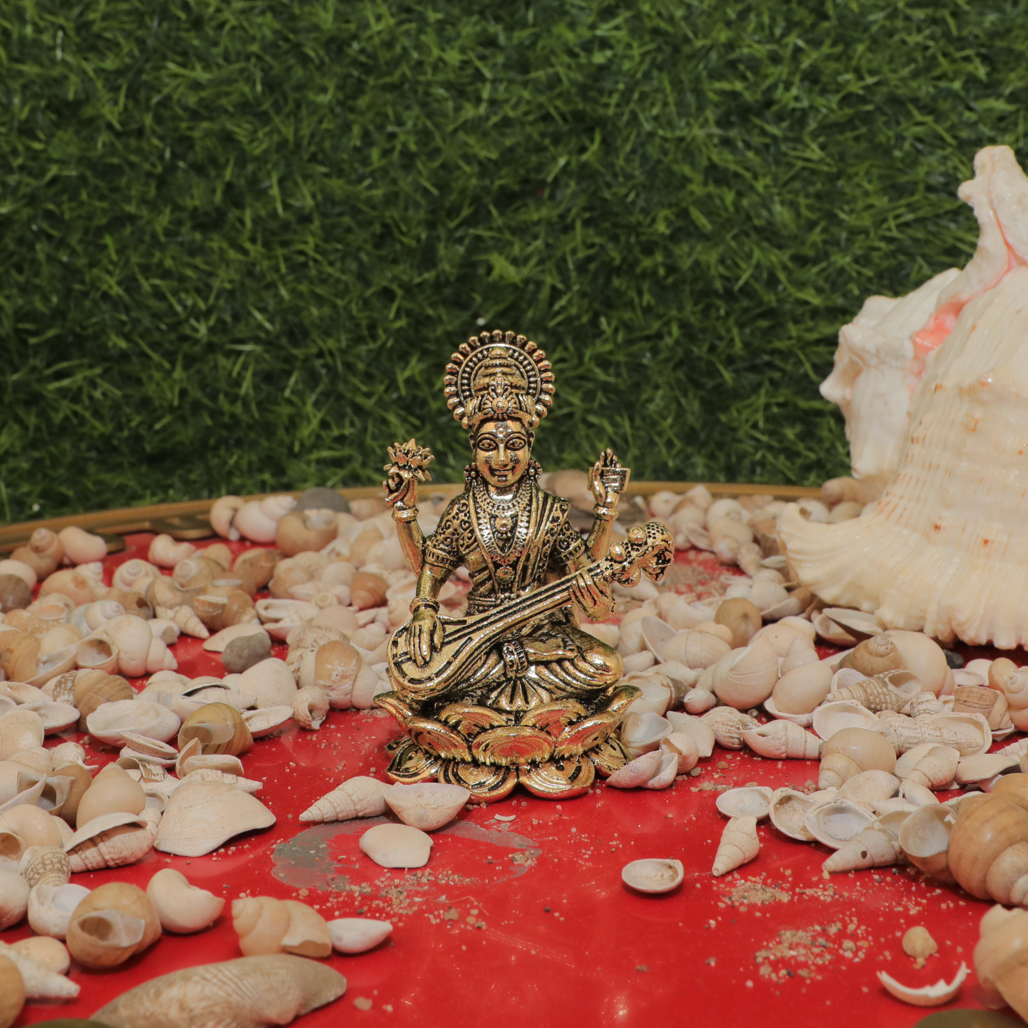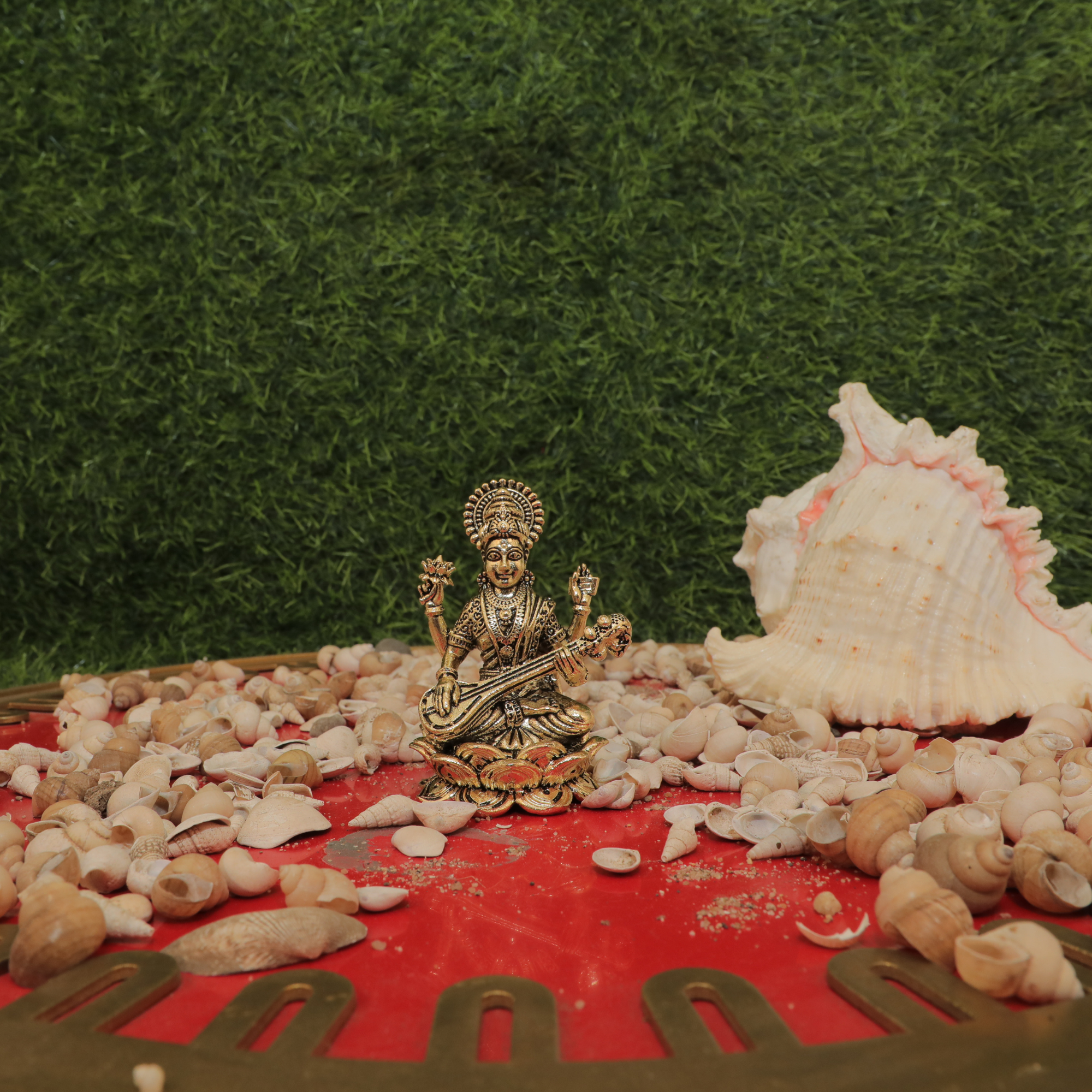 Exquisite Craftsmanship – Finely handcrafted brass idol representing Goddess Saraswati with intricate details.