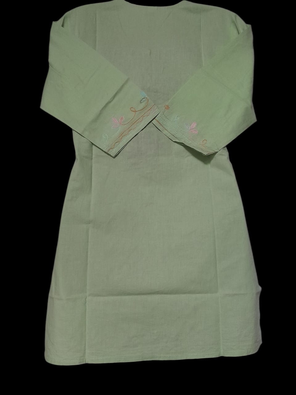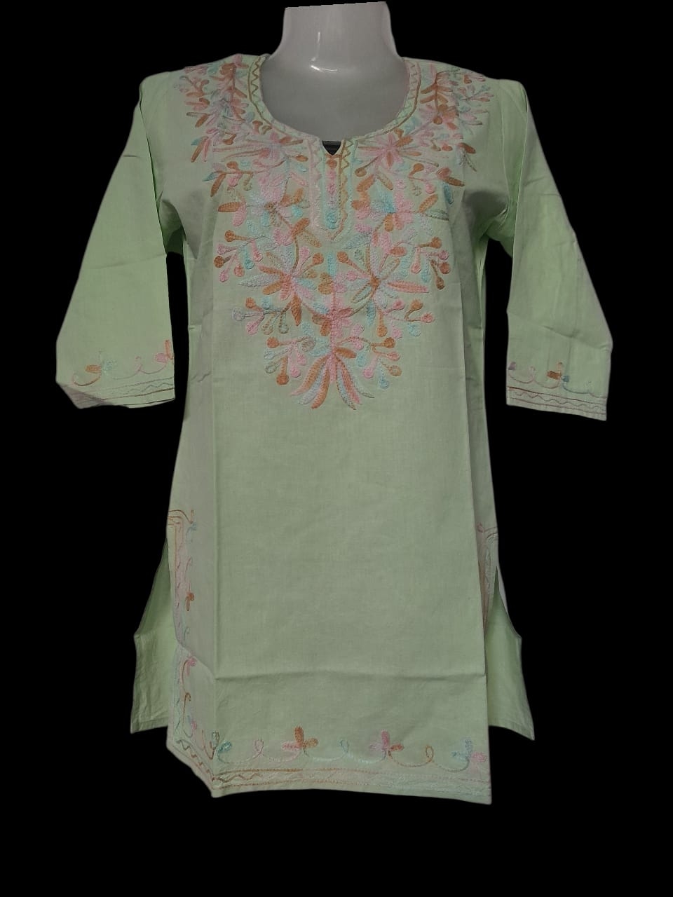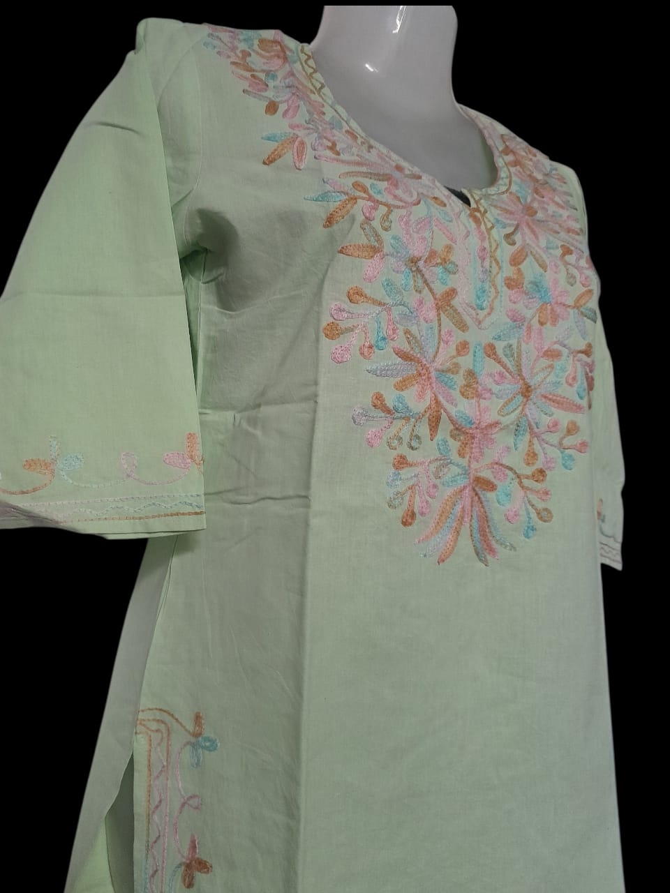 The kurti in the image is a light green Chikankari kurti with the following features:Embroidery: It features intricate, hand-embroidered Chikankari work in a floral and paisley pattern on the front, sleeves, and hem. The embroidery uses multiple thread colors, including shades of pink, peach, and light brown.Fabric: The kurti is made from a breathable fabric, likely cotton, which is common for Chikankari work and suitable for warm weather. Design: It has a round neckline with a V-slit and 3/4-length sleeves. The cut is a straight-fit style. Color: The main color of the kurti is a light green or sage green.