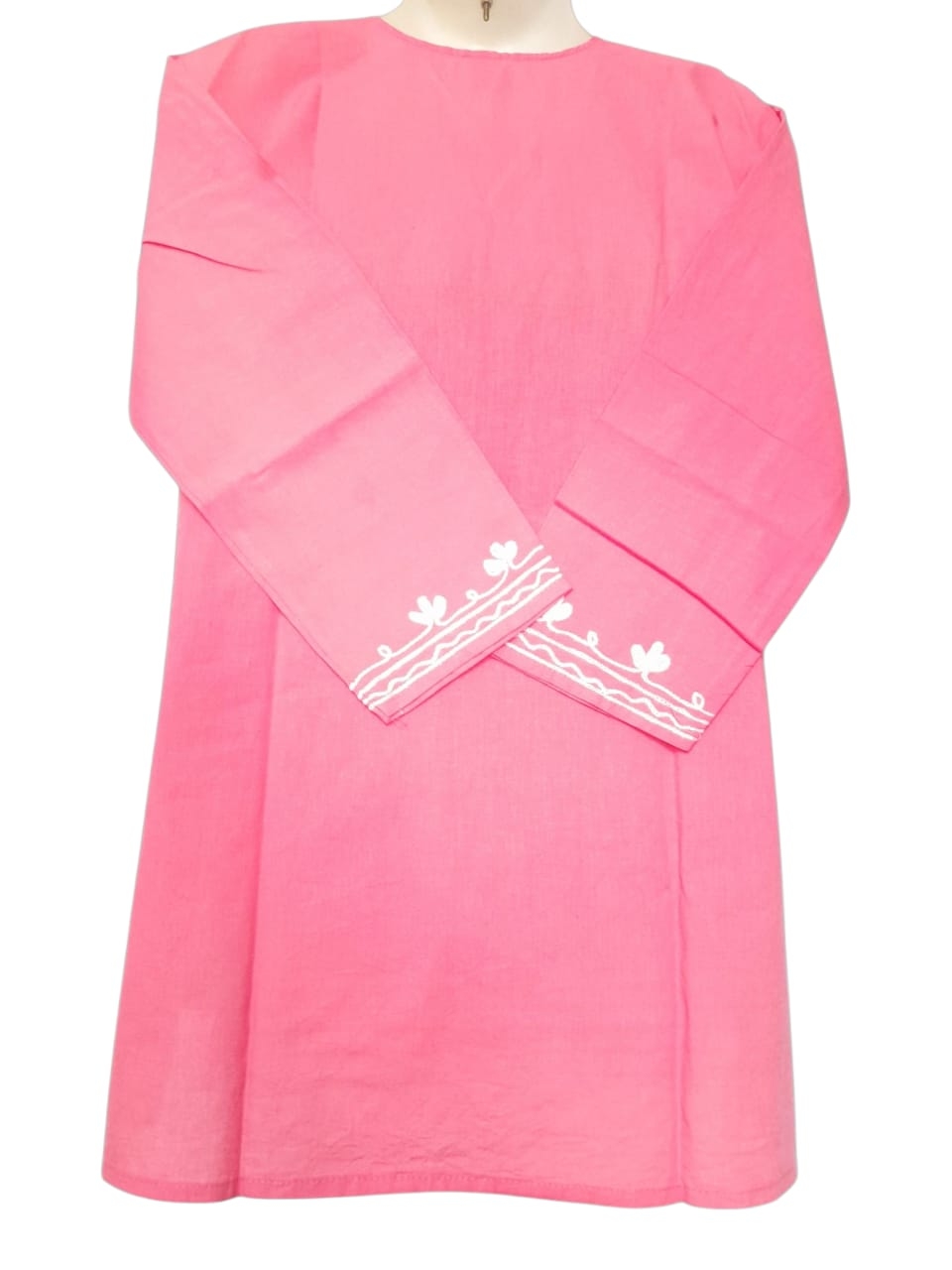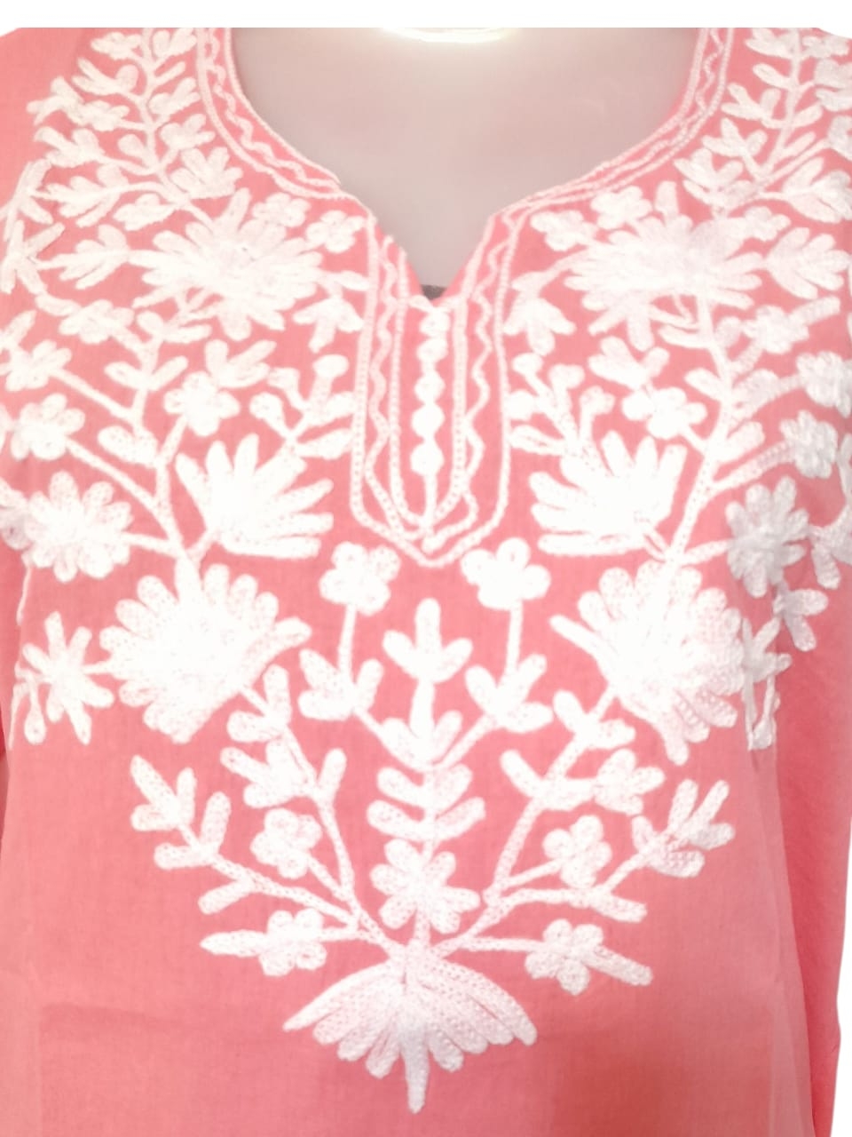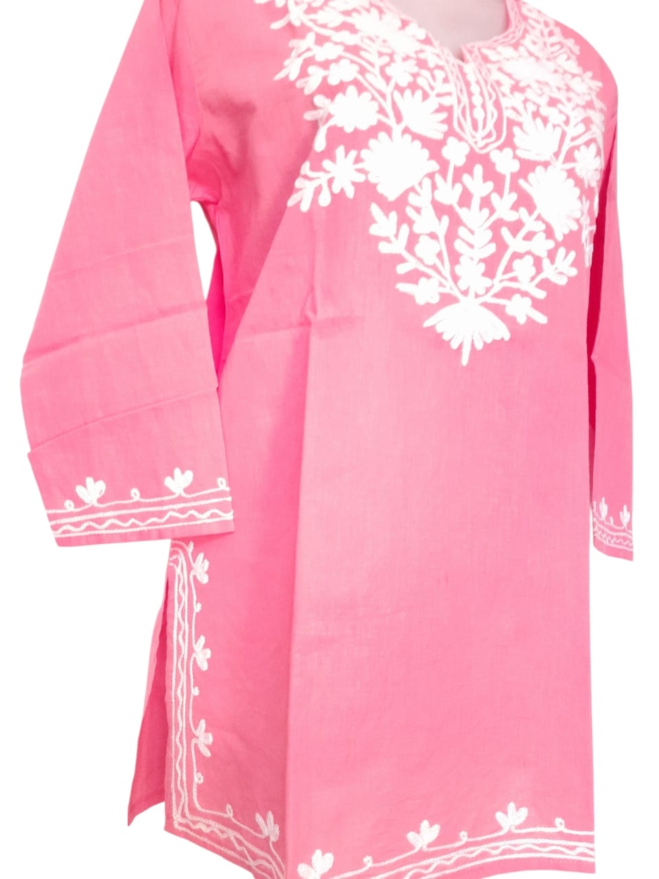 Style: It is a short, straight-cut kurti with side slits. Fabric: The garment is made from breathable cotton. Color: The color is a shade of pink, described as rosy or peach. Embroidery: It is adorned with intricate white Chikankari (Lucknowi) embroidery, which is a traditional hand-embroidery style. The embroidery is prominent on the yoke, sleeves, and hemline. Neckline & Sleeves: It has a round or V-neck and three-quarter sleeves.
