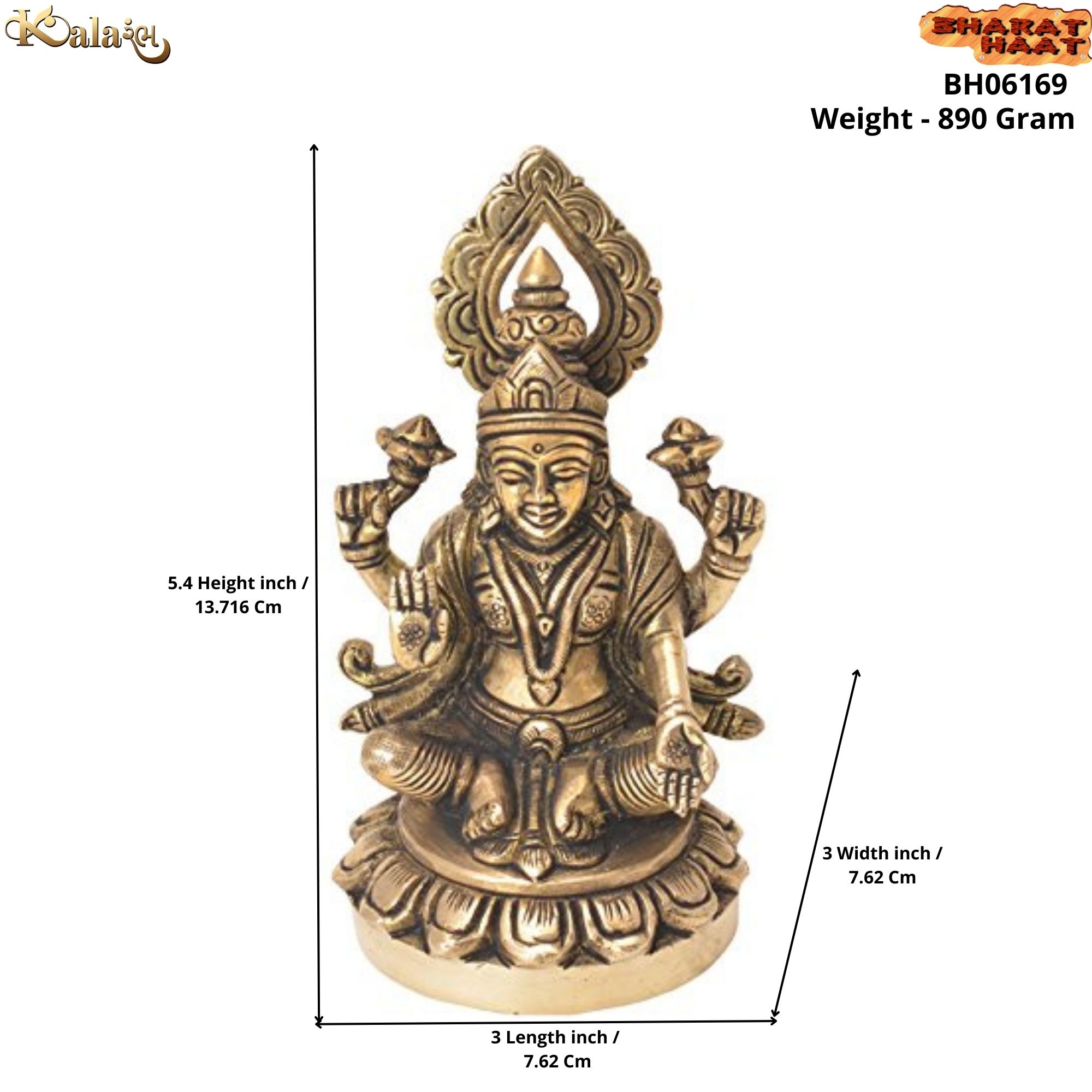 Handcrafted Brass Lakshmi – Elegant and detailed idol ideal for home décor or pooja. Dimensions: 3 x 3 x 5.4 inches, Weight: 890g.