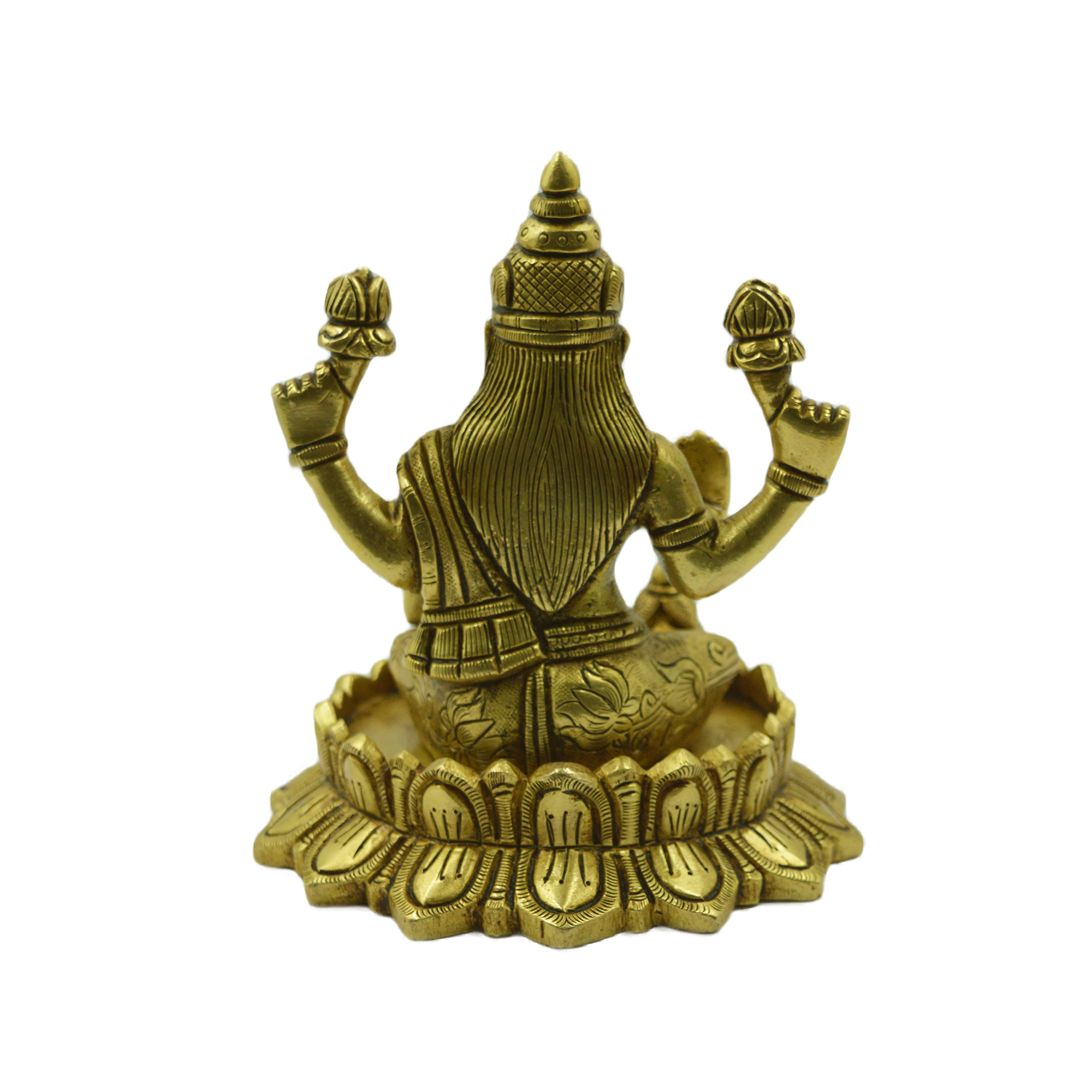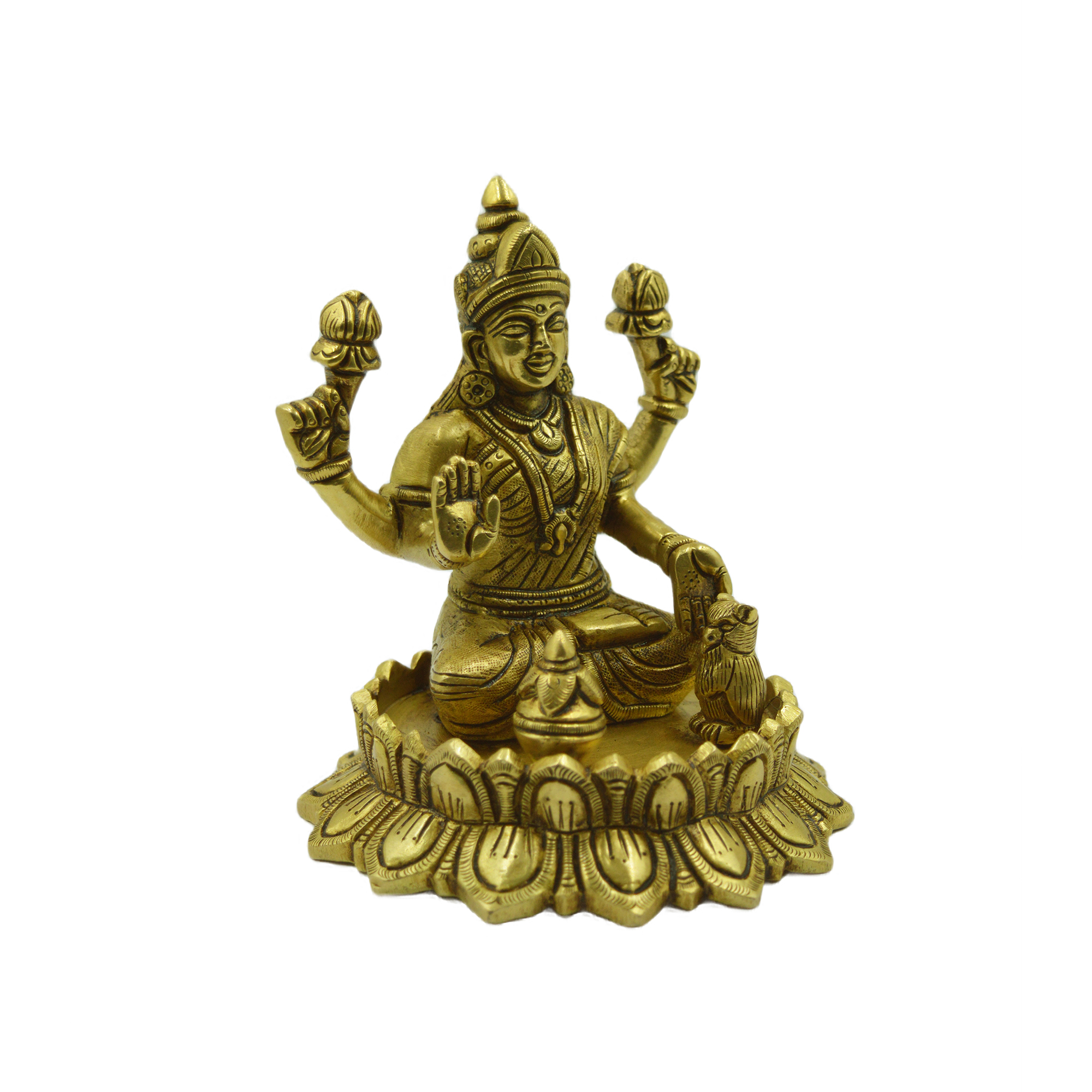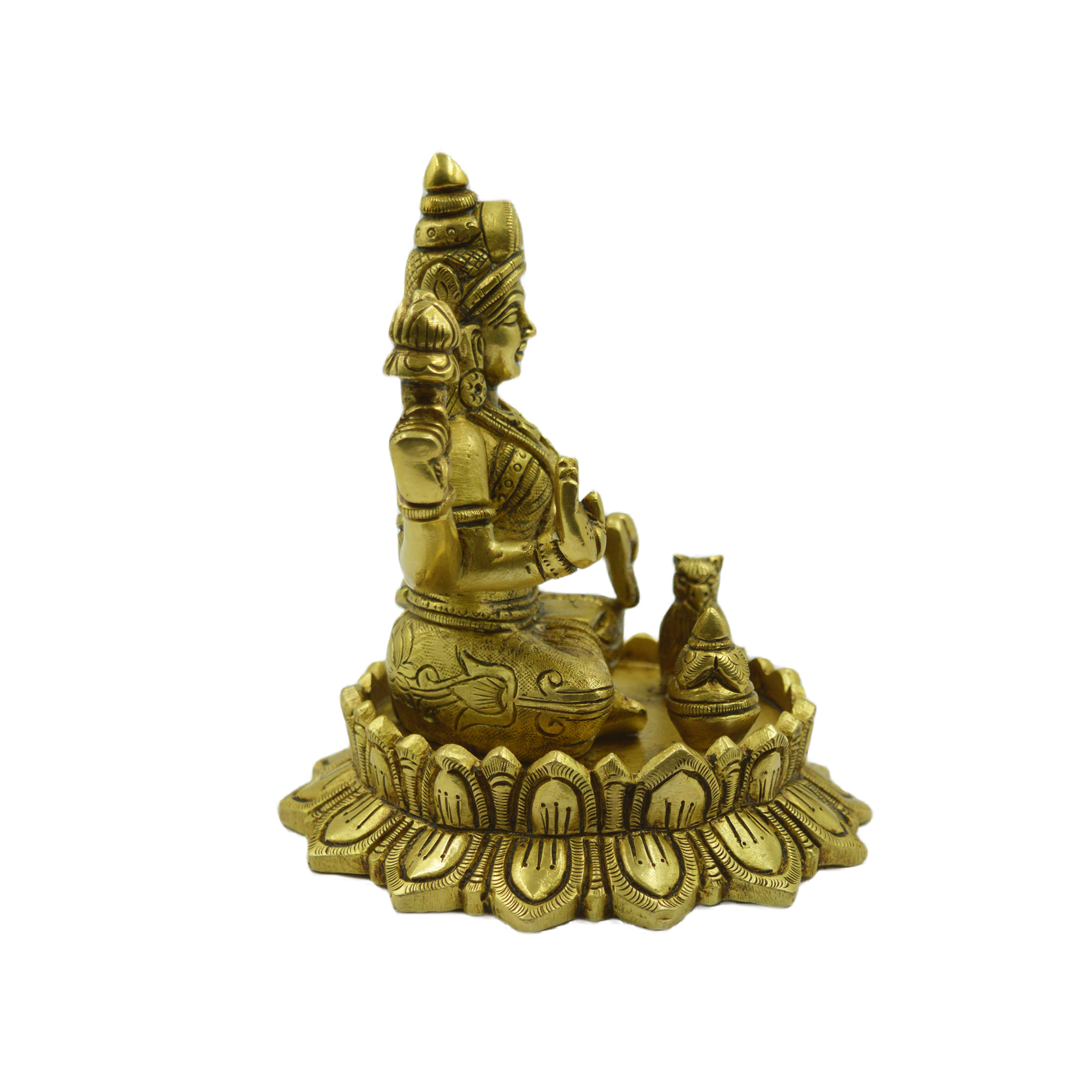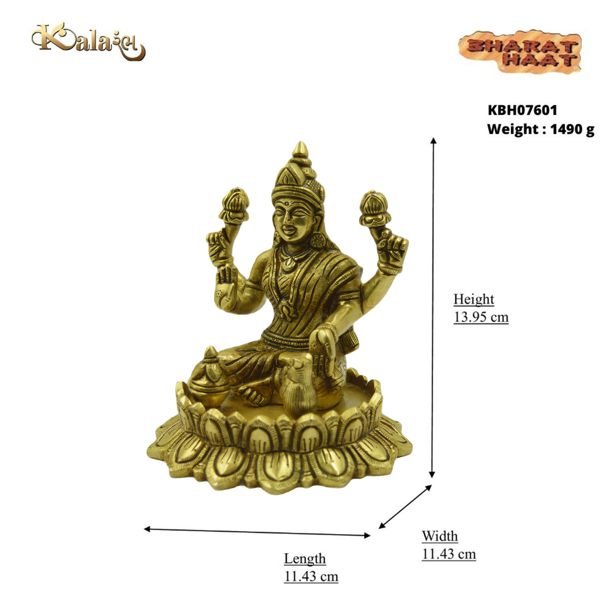 Handcrafted Brass Lotus Lakshmi – Elegant and detailed idol ideal for home décor or pooja. Dimensions: 4.5 x 4.5 x 5.1 inches, Weight: 1.49 Kg.