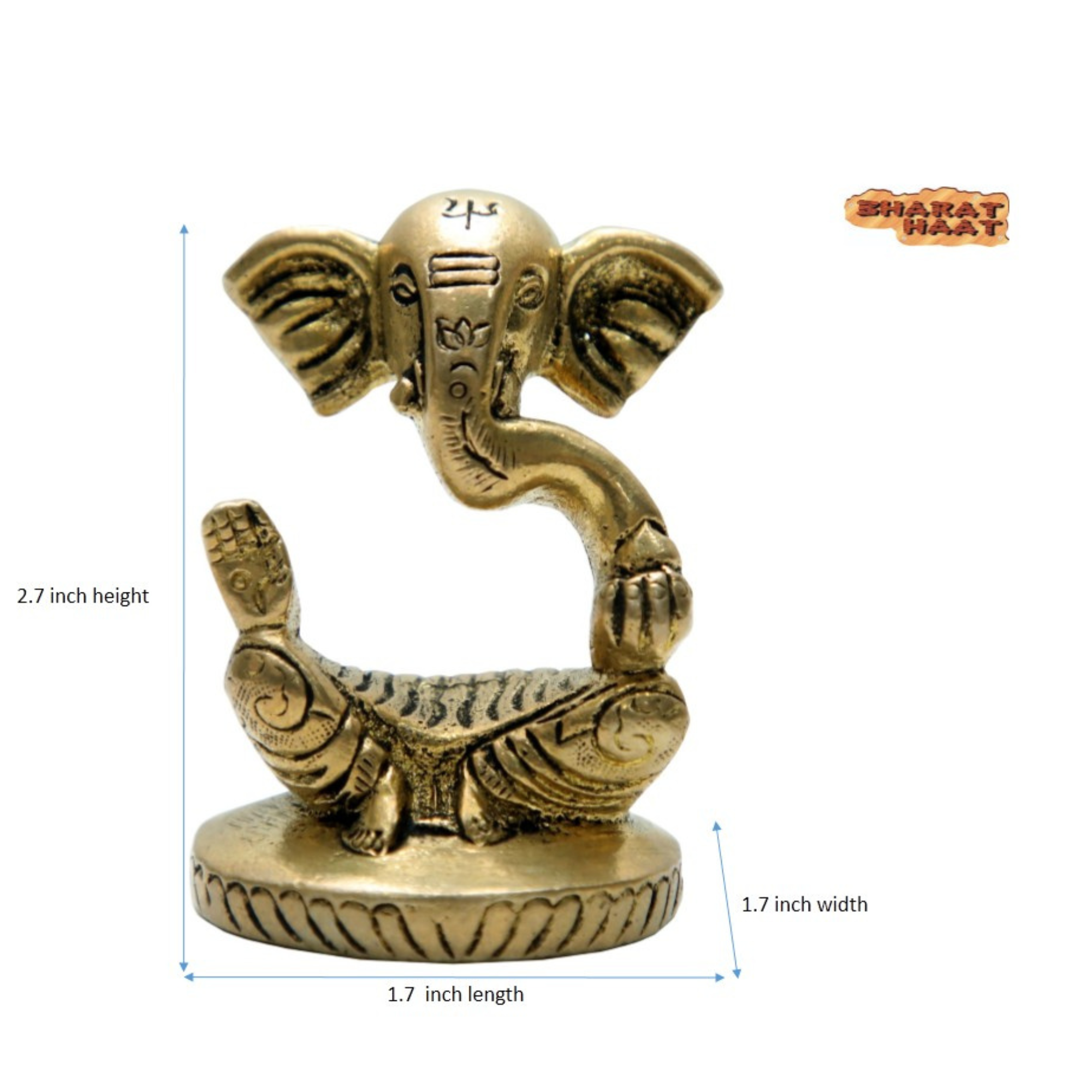 Handcrafted Brass Ganesha – Compact and detailed idol ideal for home décor or pooja. Dimensions: 1.7 x 1.7 x 2.7 inches, Weight: 245g.