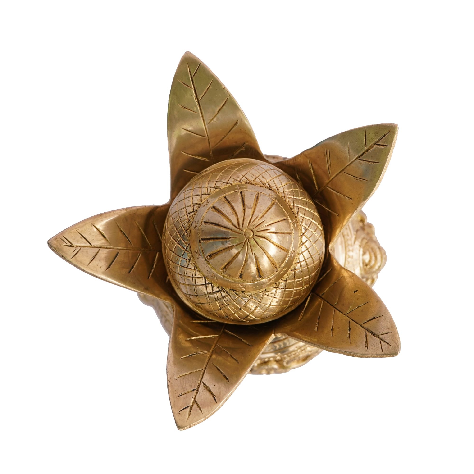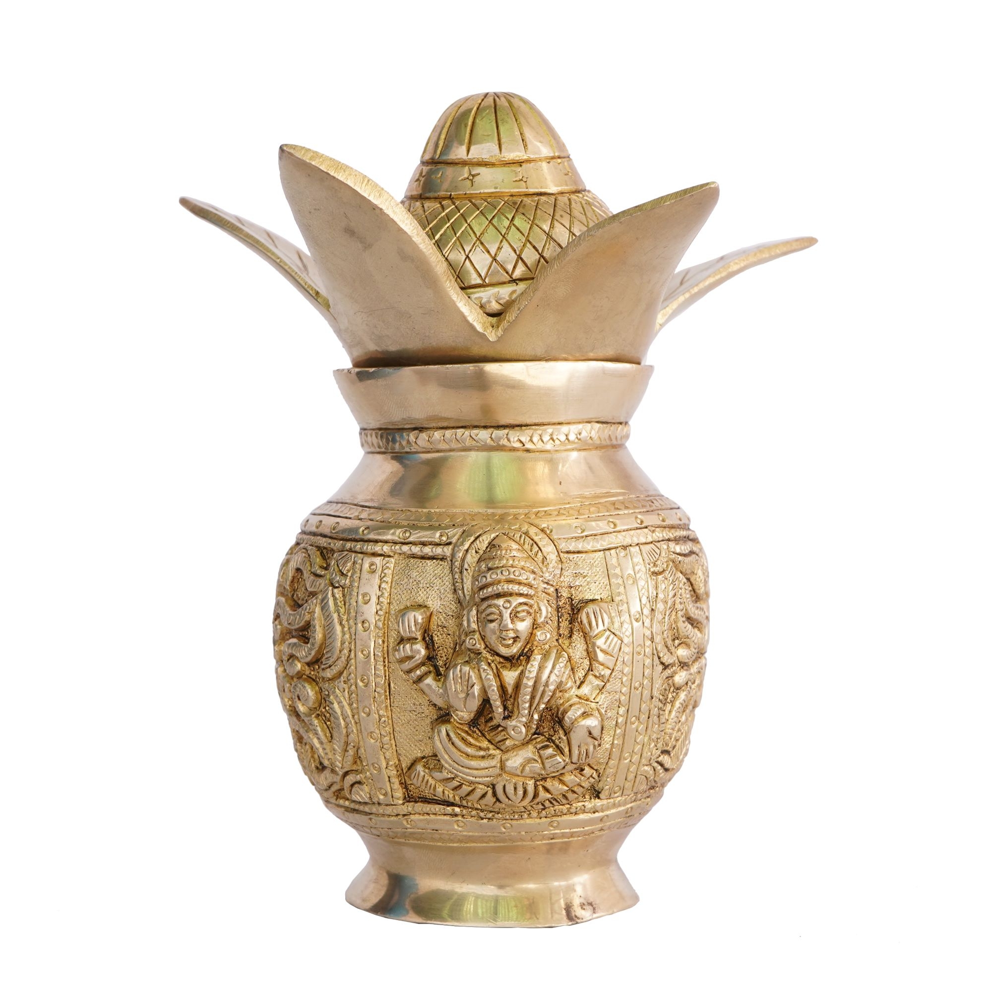 The finely crafted design reflects the artistry of skilled Indian craftsmen, with intricate patterns and a polished brass finish that radiates a golden sheen. The Kalash is traditionally filled with water, coins, or sacred items during poojas, havans, and festivals like Diwali, Navratri, and housewarming ceremonies. It is believed to attract divine blessings, prosperity, and positive energy when placed in the pooja area or home entrance.