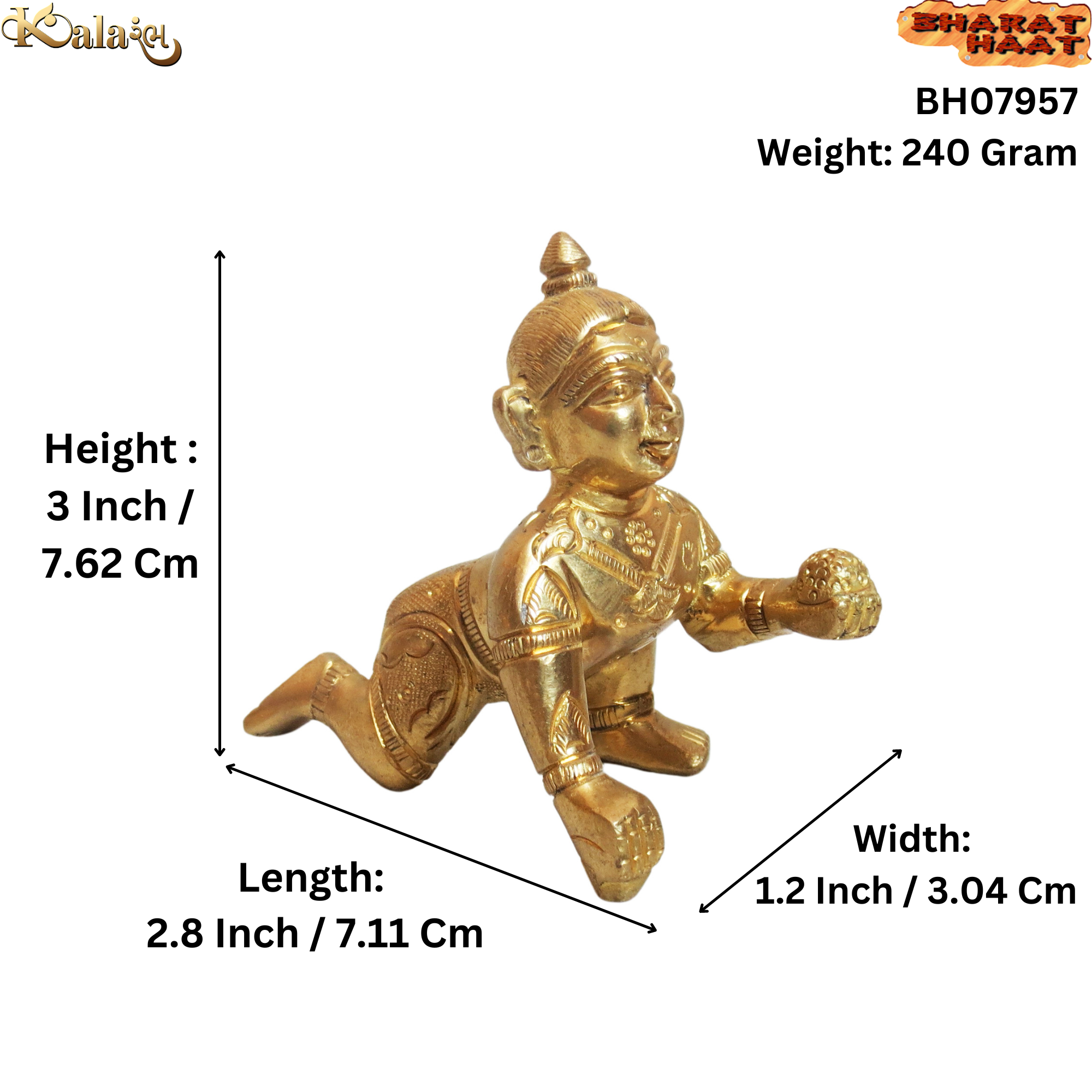 The skilled craftsmanship highlights Bal Krishna’s iconic posture, expressions, and ornaments, reflecting the finesse of traditional Indian artisans. The polished brass finish adds a warm golden glow, enhancing its visual appeal and spiritual significance. Bal Krishna is believed to bring happiness, positivity, and devotion into the home, making this statue both a decorative and spiritually inspiring piece.