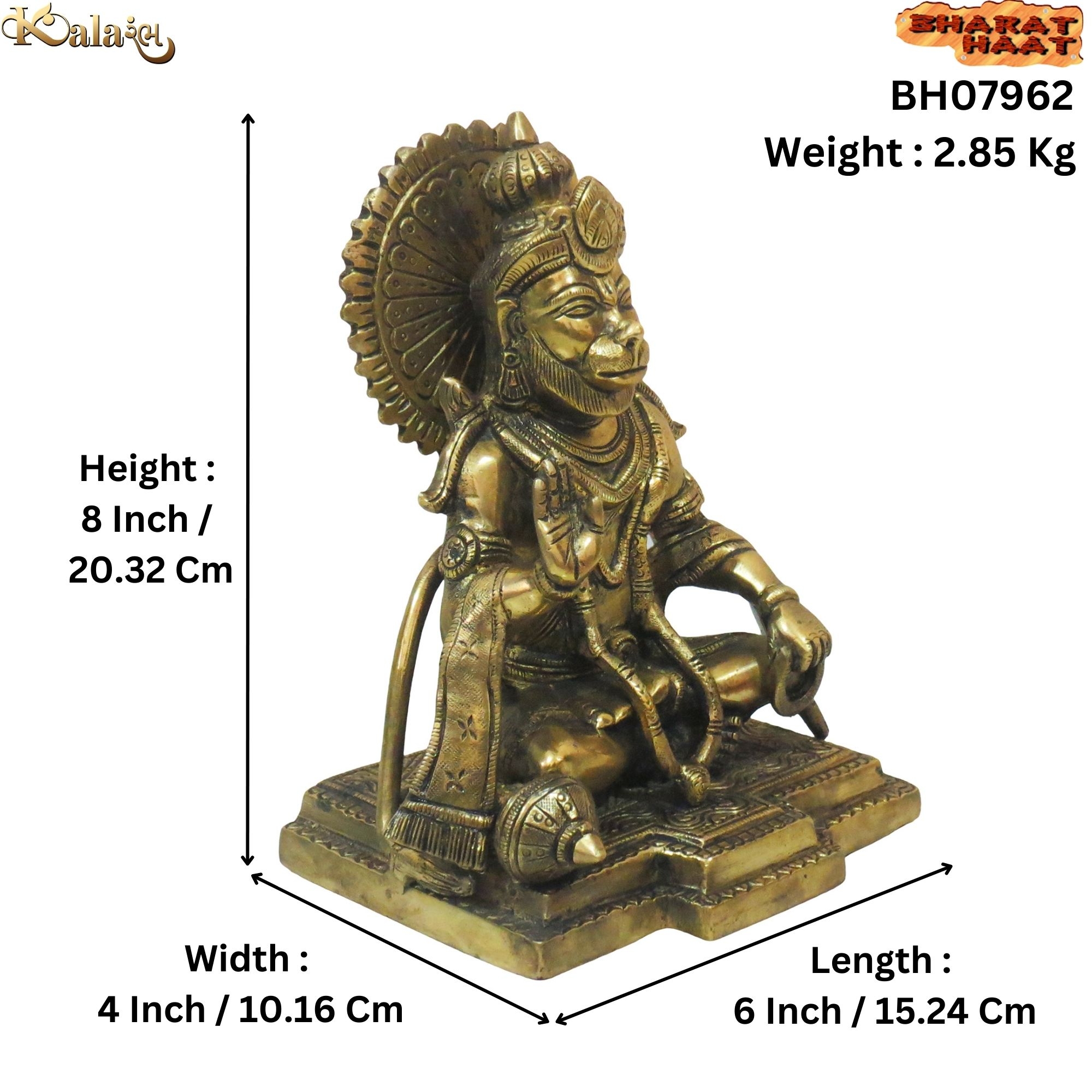 Bring home the divine blessings, strength, and protection of Lord Hanuman with this Large Handcrafted Brass Hanuman Idol. Made from pure brass, this majestic statue captures the devotion, courage, and divine energy of Lord Hanuman, a revered deity in Hinduism. Measuring 6 x 4 x 8 inches and weighing 2.85 kilograms, it commands attention and makes a significant spiritual and decorative addition to any space.