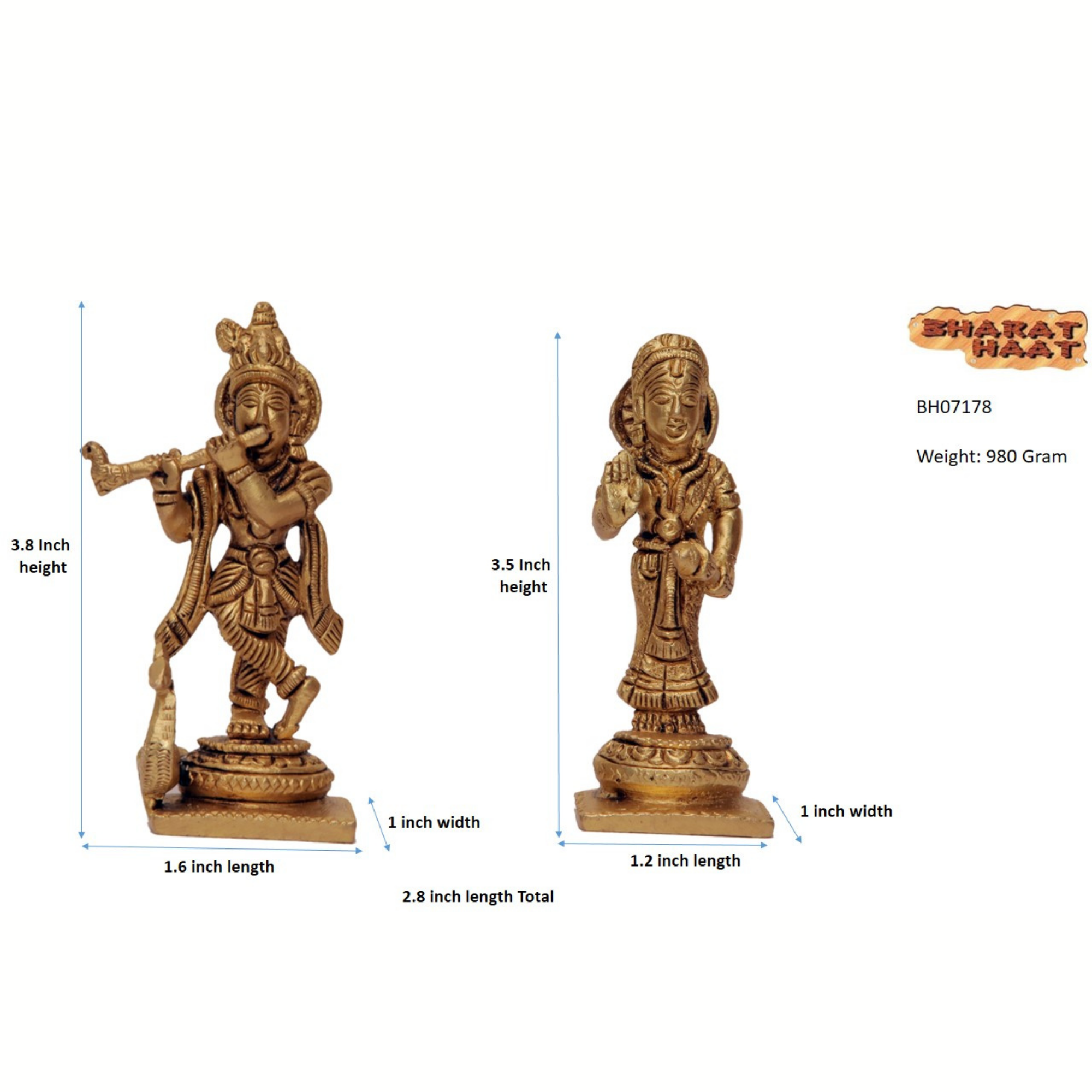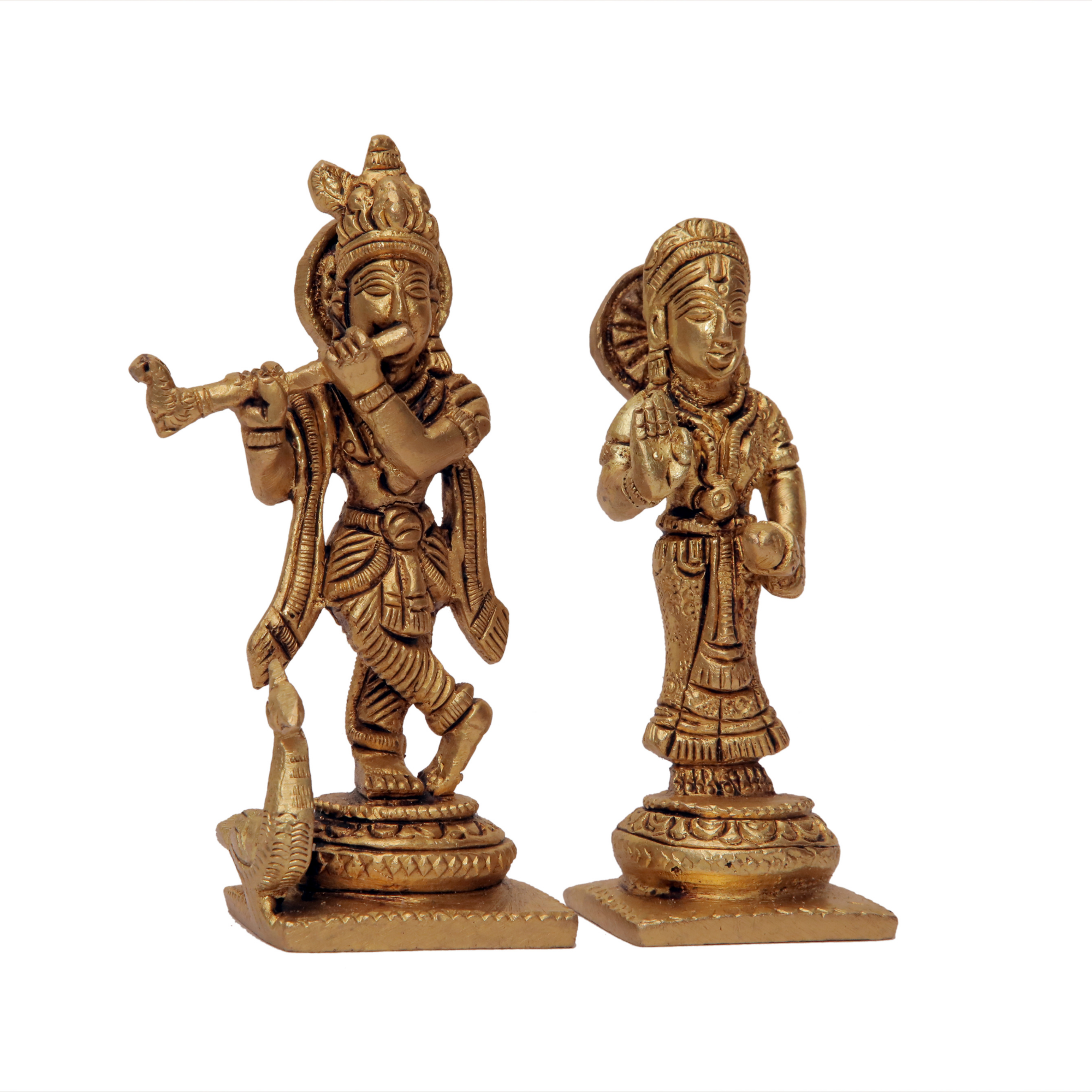 Elegant Brass Radha Krishna Set showcasing Lord Krishna and Radha in intricate detailing. This 4-inch, 980-gram idol is ideal for home décor, spiritual meditation, or gifting during festivals. A timeless symbol of love, devotion, and divine harmony.