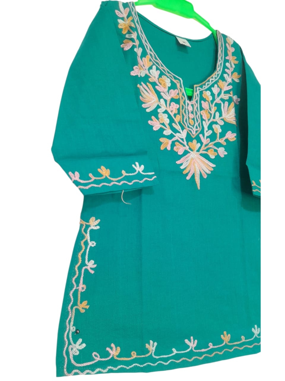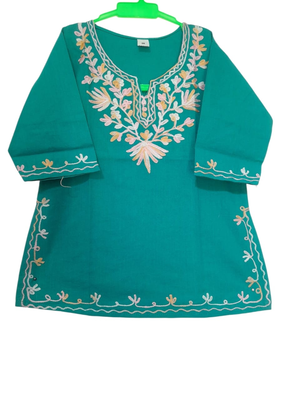 Style: It is a short, straight-cut kurti with three-quarter sleeves. Color: The primary color is a shade of green.Fabric: The fabric is likely a lightweight and comfortable material such as cotton. Design: The kurti is adorned with intricate floral and leaf-patterned embroidery, which appears to be a type of Chikankari or Kadai work. The embroidery is prominently featured on the neckline, sleeves, and the bottom hemline. The neckline is a notch-neck design.