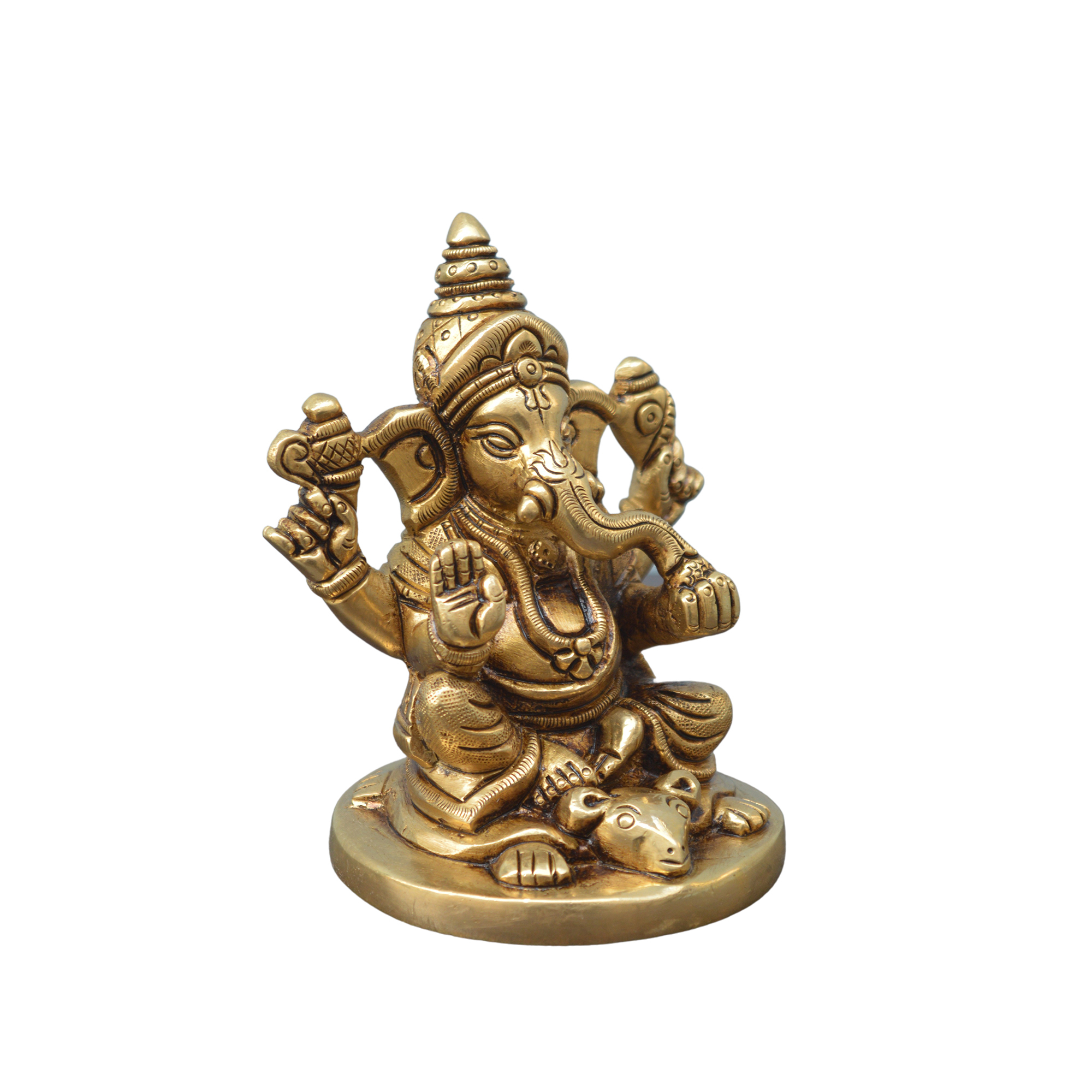Exquisite Brass Ganesh Round Base with Rat featuring Lord Ganesha in intricate detailing with his iconic mouse companion. This 4-inch, 670-gram statue is ideal for spiritual décor, meditation spaces, or gifting, symbolizing wisdom, prosperity, and positivity.