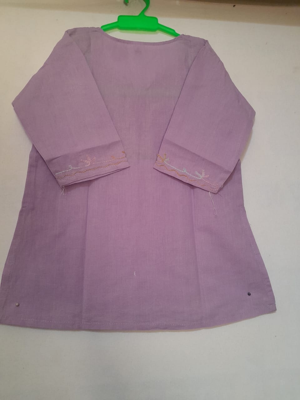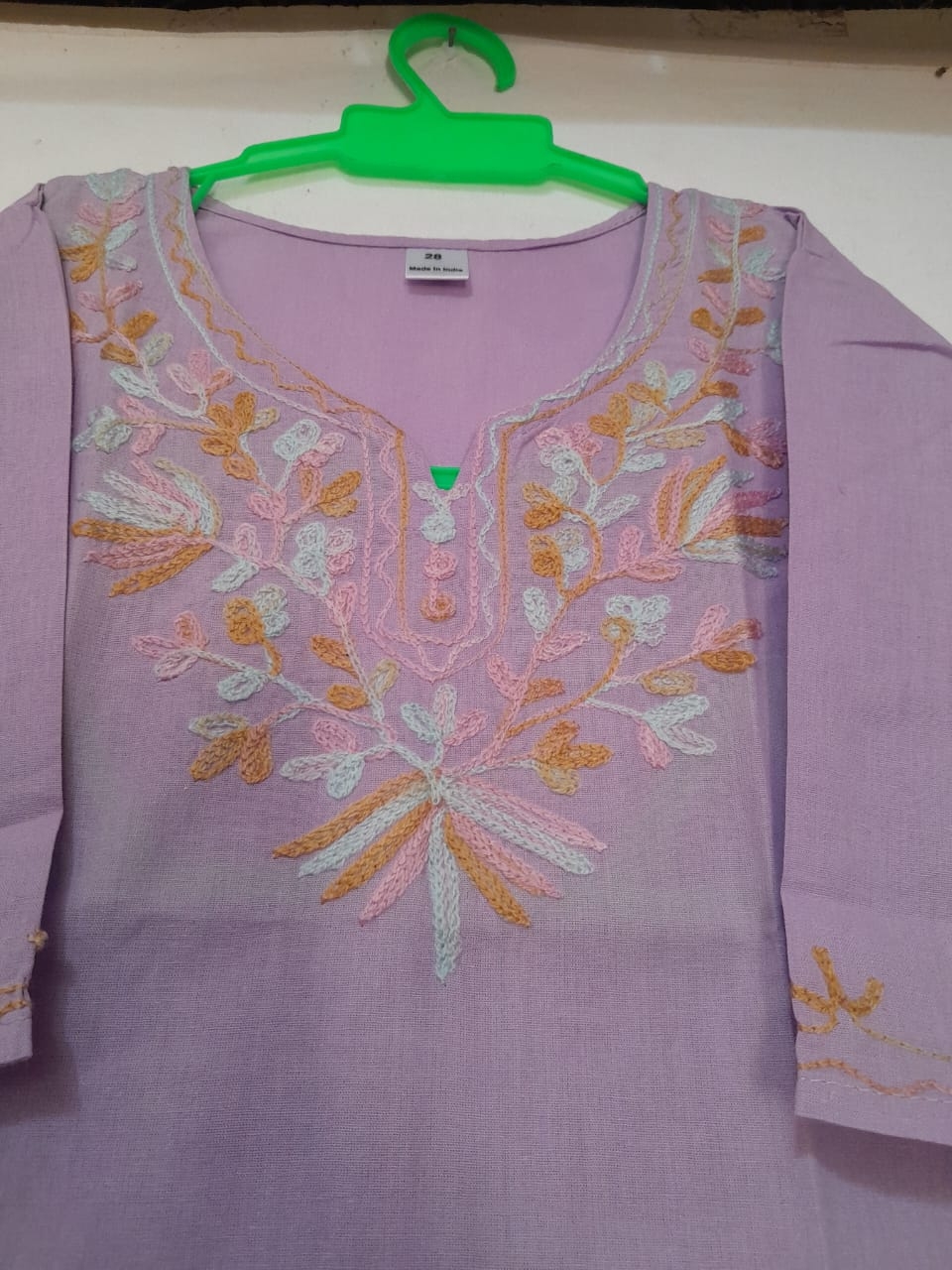 Based on the image and product descriptions, the dress is a short, embroidered kurti.Garment Type: Short Kurta or KurtiColor: Light purple/pinkMaterial: Pure CottonDesign: The kurti features intricate floral embroidery, a style often referred to as Chikankari. The embroidery is visible on the neckline, the cuffs of the 3/4-length sleeves, and along the hemline.Fit: It has a straight cut with side slits, designed for comfort and casual wear.