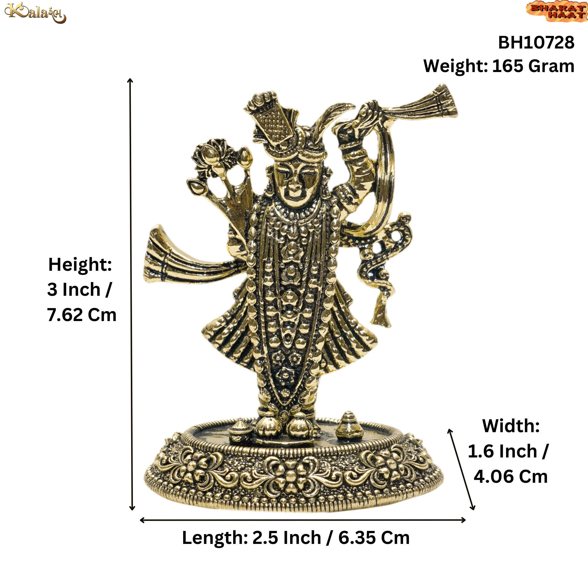 Miniature Brass Shreenathji idol – 2.5 x 1.6 x 3 inches, 165g. A delicately handcrafted depiction of Shreenathji, ideal for home altars, study areas, or as a spiritual gift.