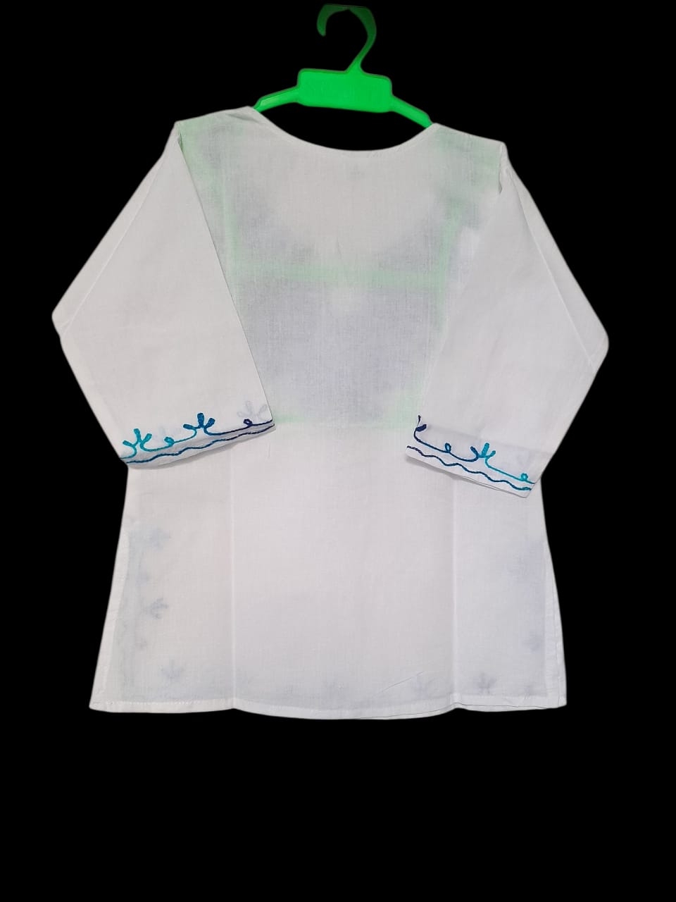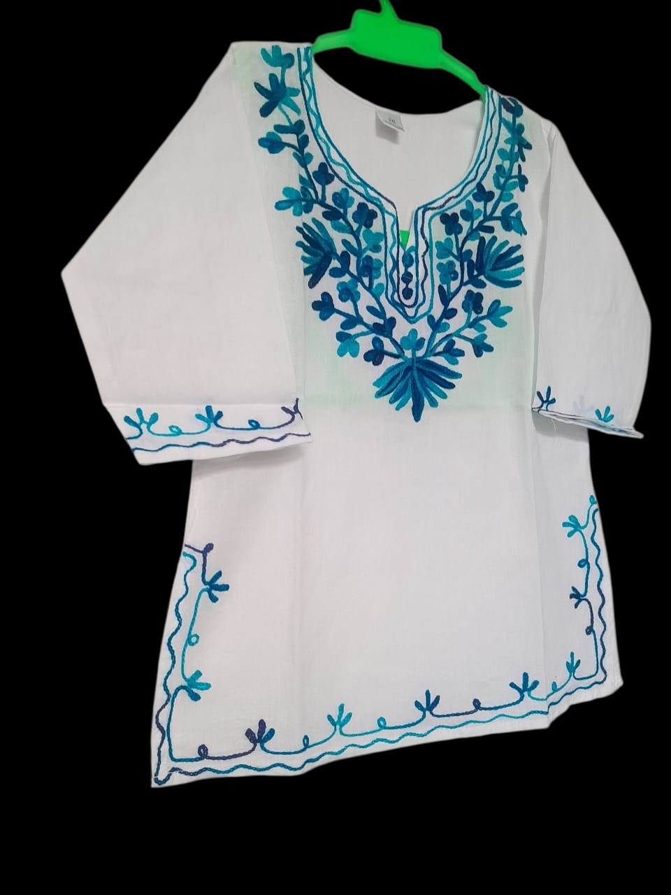 Fabric: CottonColor: White with blue and turquoise embroideryStyle: Short kurti or tunicSleeve Length: Three-quarter sleevesNeck Type: V-neckPattern: Embroidered floral and leaf patterns on the neckline, sleeves, and hemOccasion: Suitable for casual or formal wear