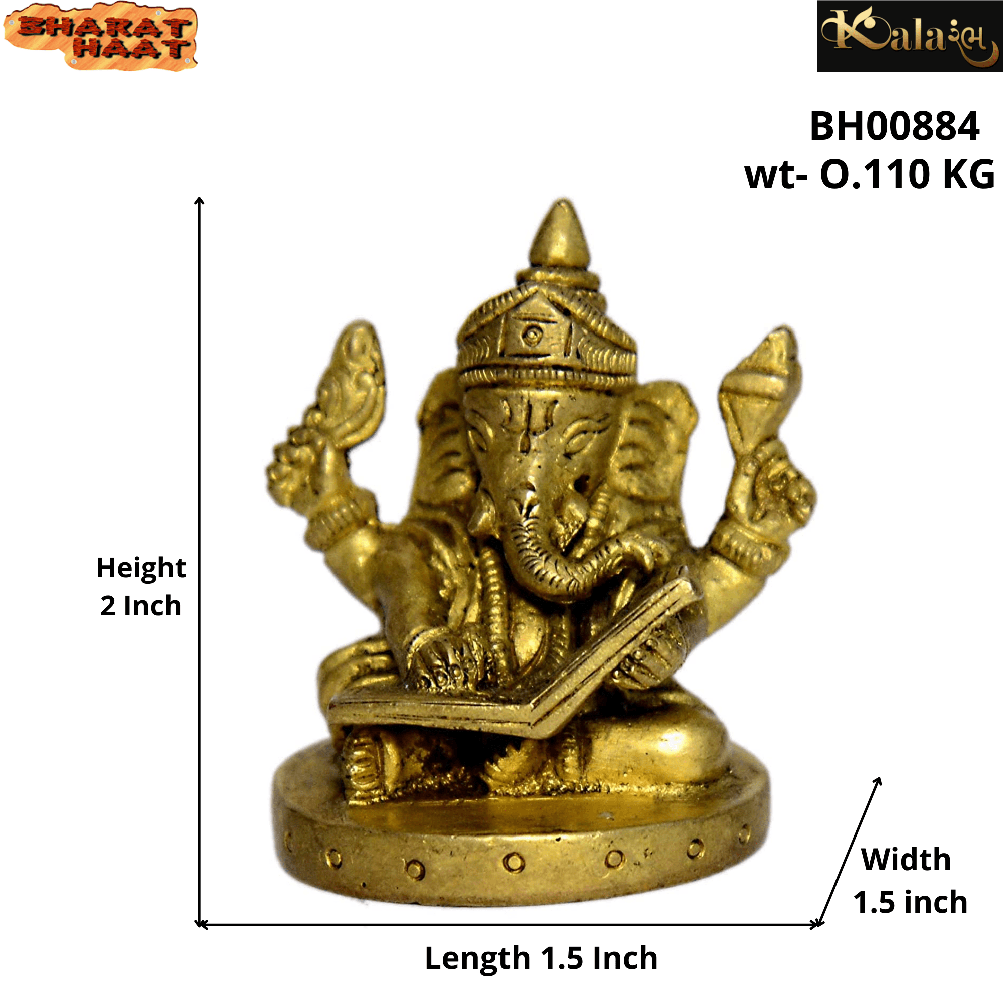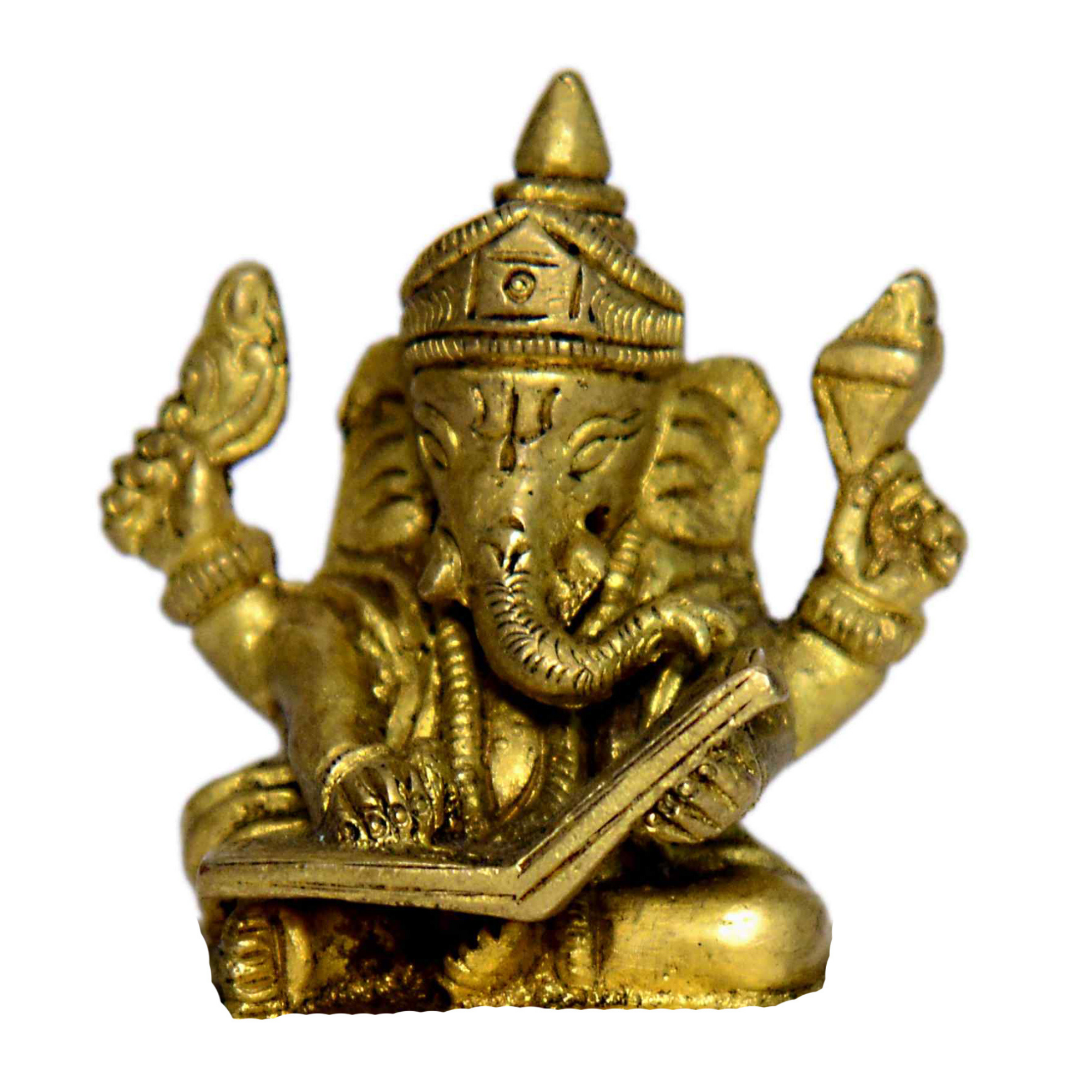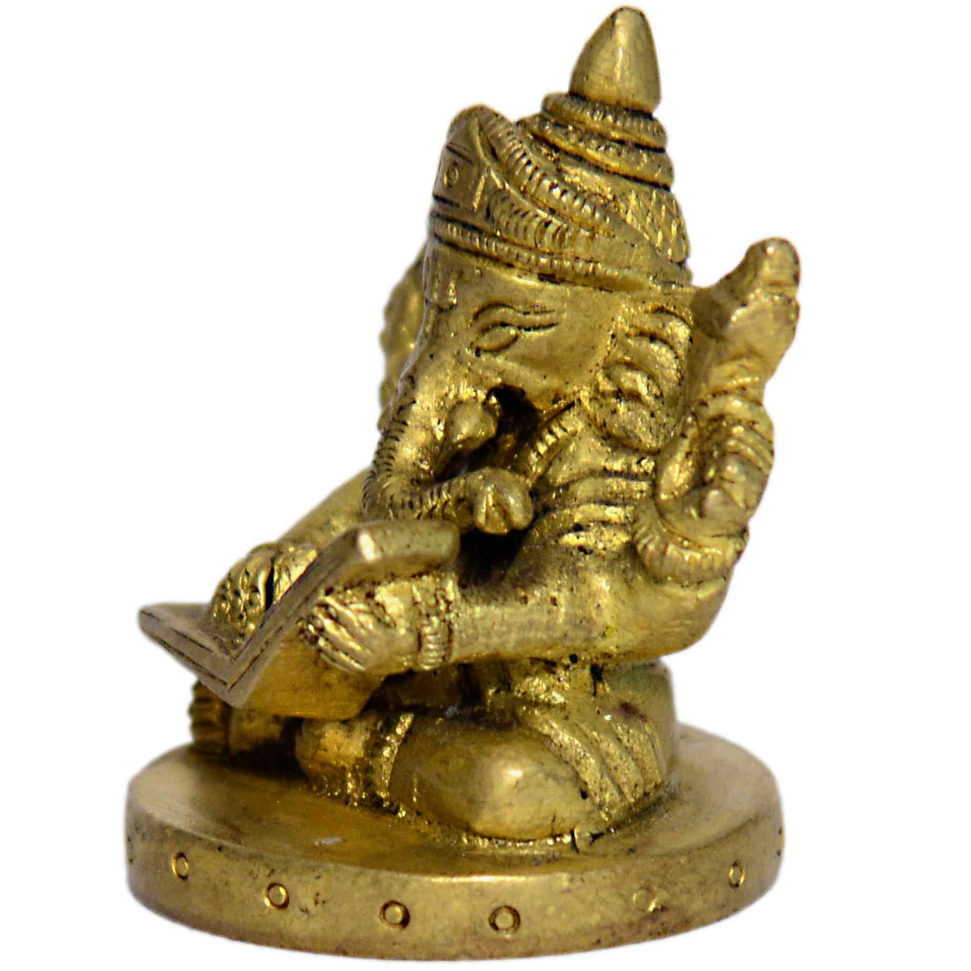 Miniature Brass Ganesha reading a book, ideal for home worship and décor. Size: 1.5 x 1.5 x 2 Inch | Weight: 110g. Adds charm to pooja rooms or as a spiritual gift.