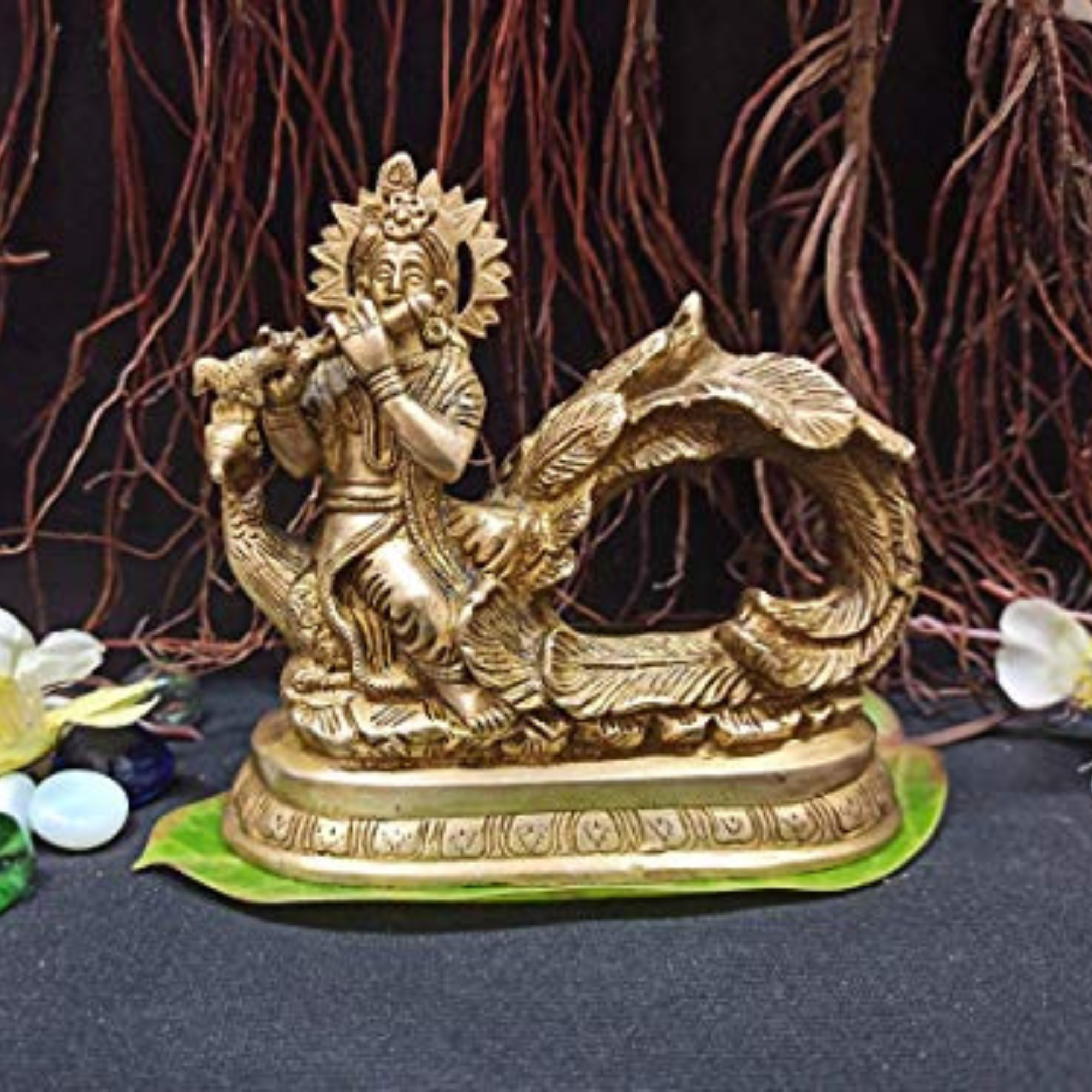 Handcrafted Brass Krishna Sitting on Peacock – 5.1-inch divine statue, ideal for pooja rooms, meditation corners, or elegant home décor.