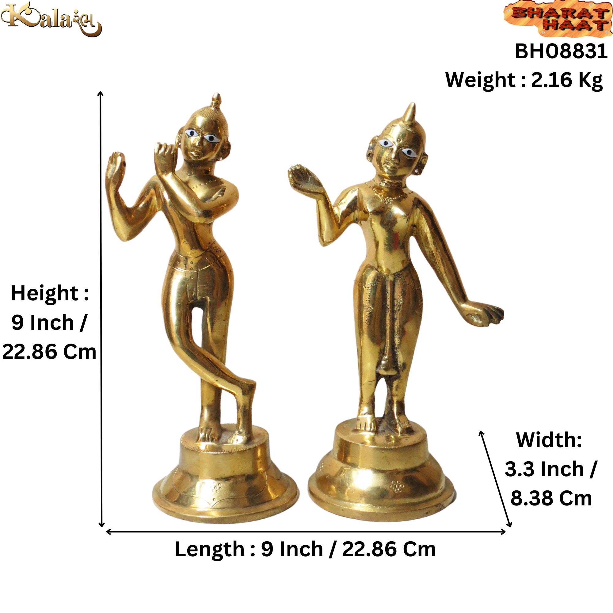 Bring divine grace and love into your home with this Handcrafted Brass Radha Krishna Idol. Made from pure solid brass, this exquisite statue beautifully portrays Lord Krishna and Radha together, symbolising eternal love, devotion, and harmony. Measuring 9 x 3.3 x 9 Inch (22.86 x 8.38 x 22.86 Cm) and weighing 2.16 Kg, this idol is an ideal decorative and spiritual piece for your home temple, living room, or office.