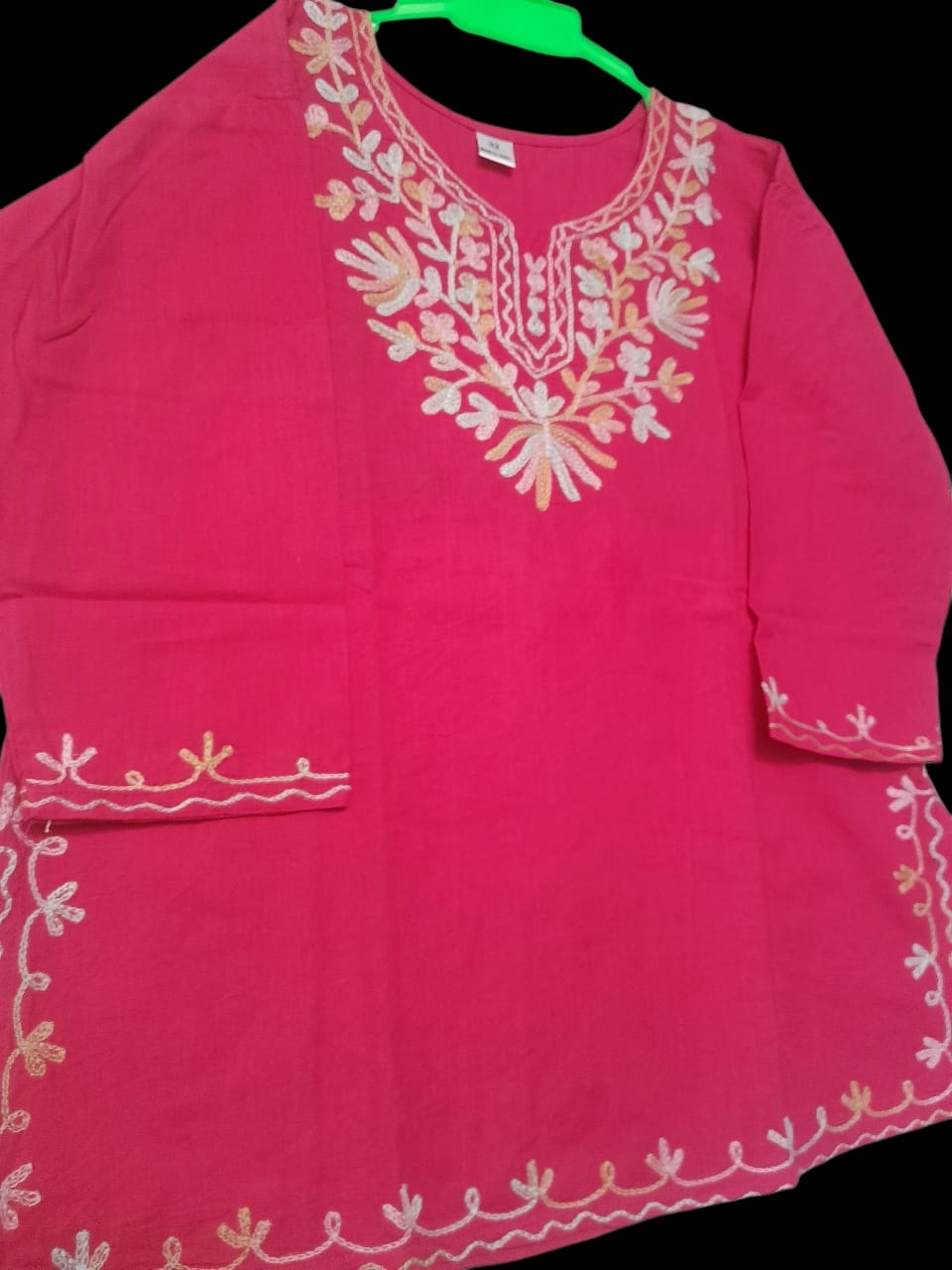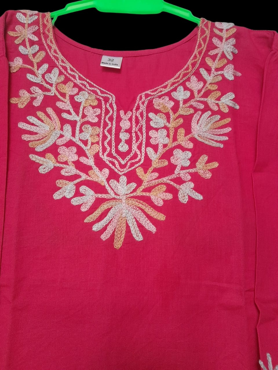 The kurti in the image is a short, straight-cut kurti with intricate floral embroidery.Based on the visual details and similar products found, the features of this kurti are:Color: The kurti is a bright pink or magenta color.Style: It is a short, straight-cut kurti, which is a versatile style that can be worn for both casual and semi-formal occasions. Embroidery: The most prominent feature is the detailed floral embroidery in white and light-colored thread, which is present around the neckline, along the hemline, and on the cuffs of the sleeves. This style of embroidery is often associated with Kashmiri craftsmanship. Neckline: It has a round neckline. Sleeves: The sleeves are three-quarter length. Fabric: Kurtis of this style are often made from rayon, a material known for being comfortable, breathable, and suitable for daily wear.