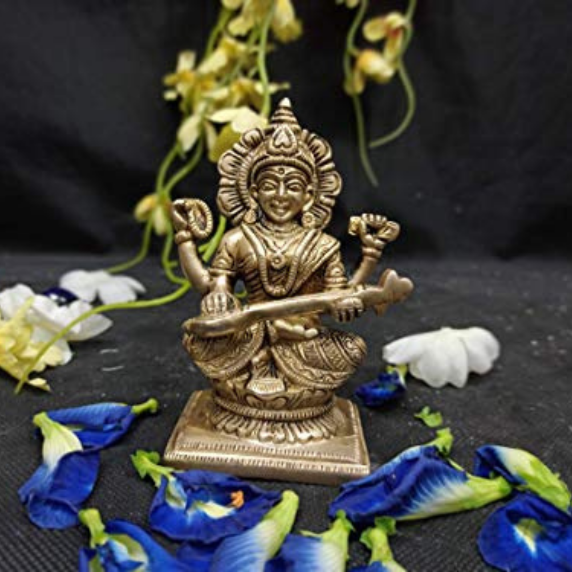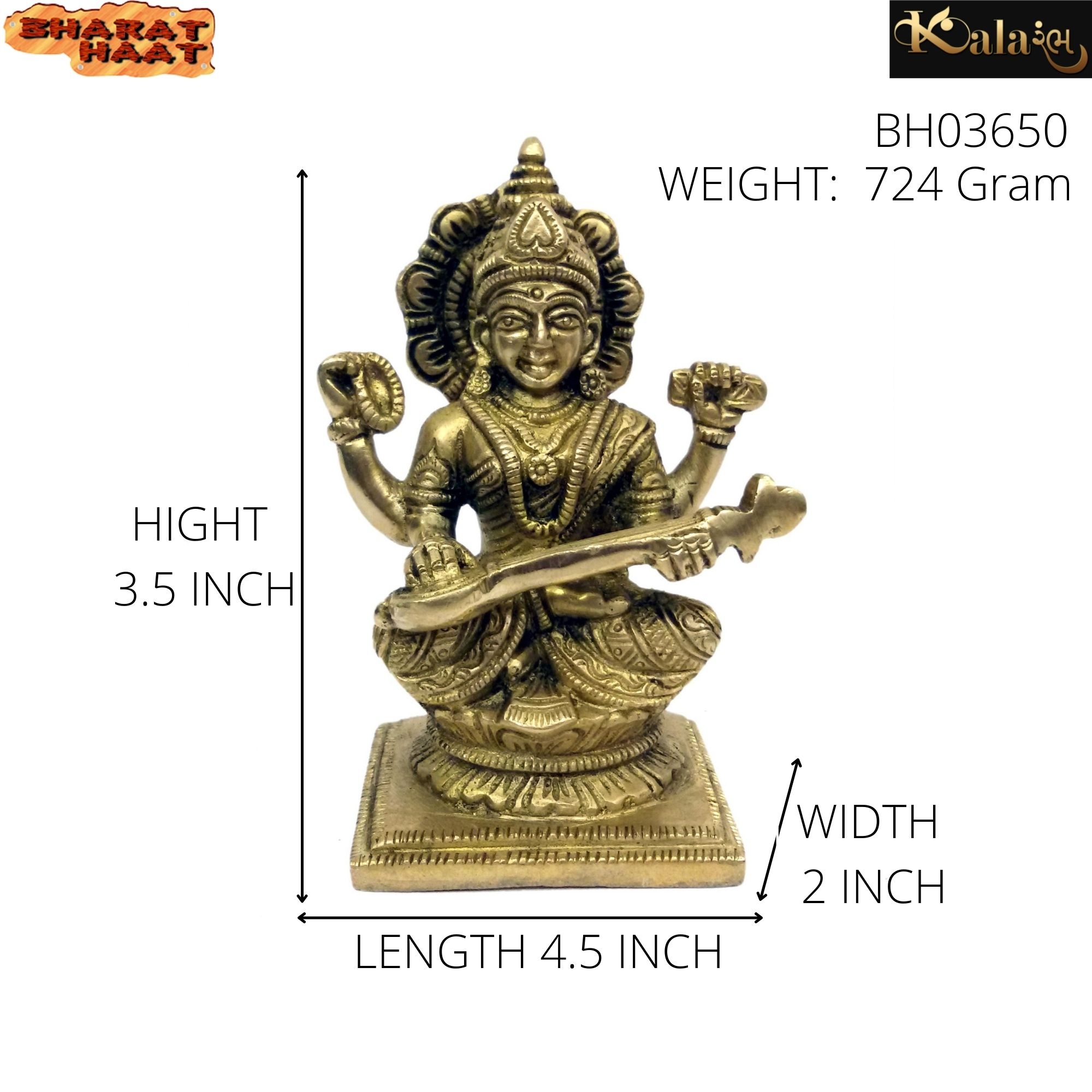 Handcrafted Brass Sarasvati Devi, 3.5 inches tall and 724 grams, ideal for pooja, study room décor, and gifting.