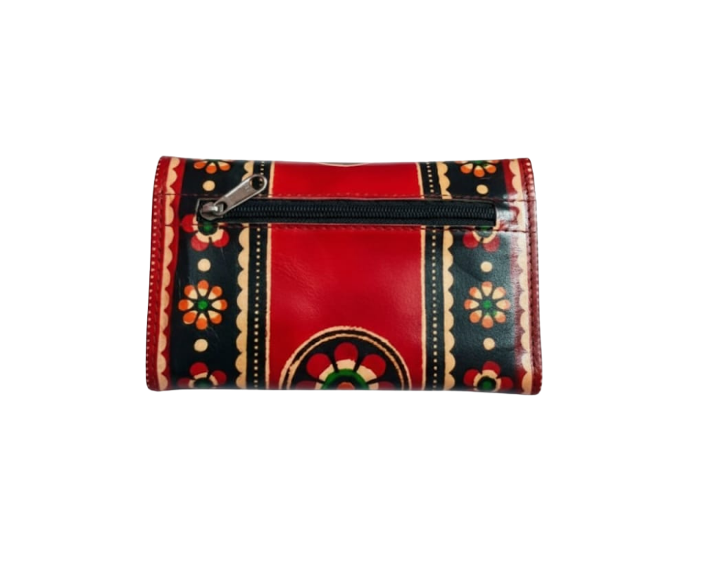 This purse is a classic example of age old Shantiniketan craft. It was introduced in West Bengal, India during the 1940s. The traditional motifs used for These Shantiniketan bags depict the rich cultural heritage of India. It derives its name from the place where it was first introduced – Shantiniketan. The Shantiniketan style evolved as a result of the Art Movement. These products have now become world famous for their applique, batik and embossed craft work. Moreover the process of burnishing the leather gives it an elegant sheen and brings out the colors. The embossing craft is an intricate process. After the final leather is made, it is then stitched into the desired product . Finally the product is coated with a lacquer finish for making the product shiny and long lasting.