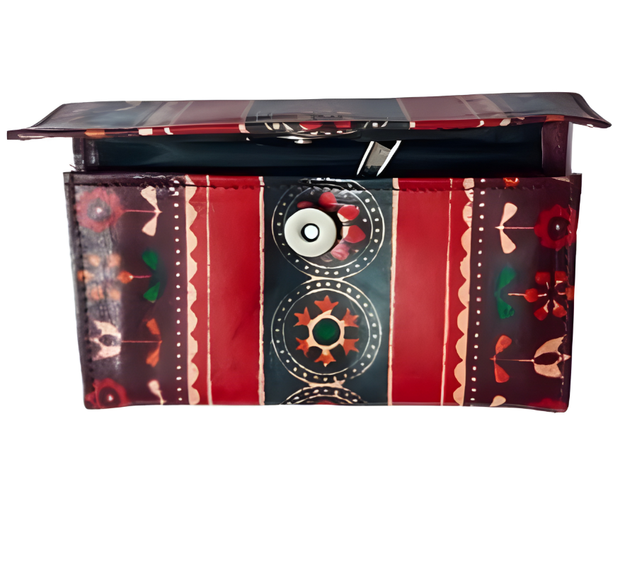 This purse is a classic example of age old Shantiniketan craft. It was introduced in West Bengal, India during the 1940s. The traditional motifs used for These Shantiniketan bags depict the rich cultural heritage of India. It derives its name from the place where it was first introduced – Shantiniketan. The Shantiniketan style evolved as a result of the Art Movement. These products have now become world famous for their applique, batik and embossed craft work. Moreover the process of burnishing the leather gives it an elegant sheen and brings out the colors. The embossing craft is an intricate process. After the final leather is made, it is then stitched into the desired product . Finally the product is coated with a lacquer finish for making the product shiny and long lasting.