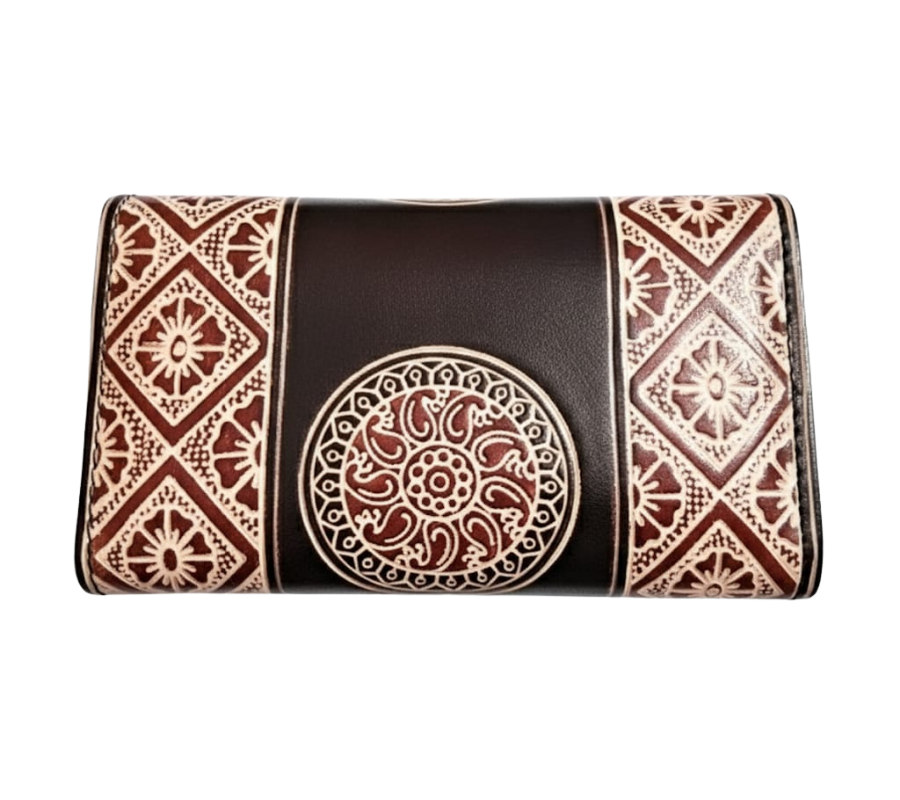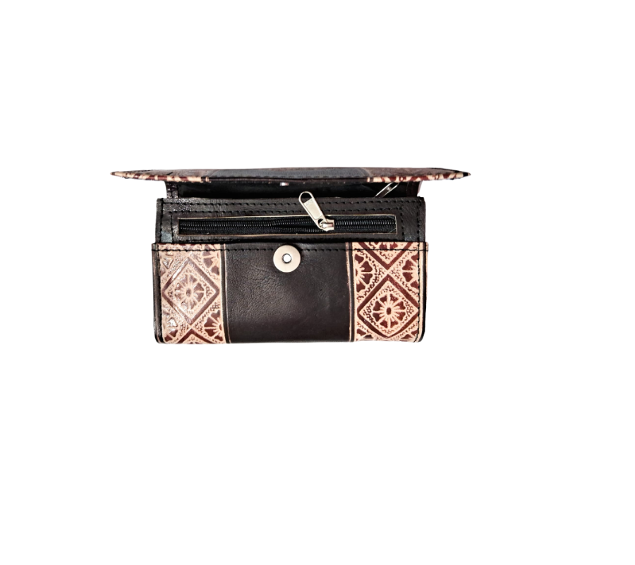 This purse is a classic example of age old Shantiniketan craft. It was introduced in West Bengal, India during the 1940s. The traditional motifs used for These Shantiniketan bags depict the rich cultural heritage of India. It derives its name from the place where it was first introduced – Shantiniketan. The Shantiniketan style evolved as a result of the Art Movement. These products have now become world famous for their applique, batik and embossed craft work. Moreover the process of burnishing the leather gives it an elegant sheen and brings out the colors. The embossing craft is an intricate process. After the final leather is made, it is then stitched into the desired product . Finally the product is coated with a lacquer finish for making the product shiny and long lasting.