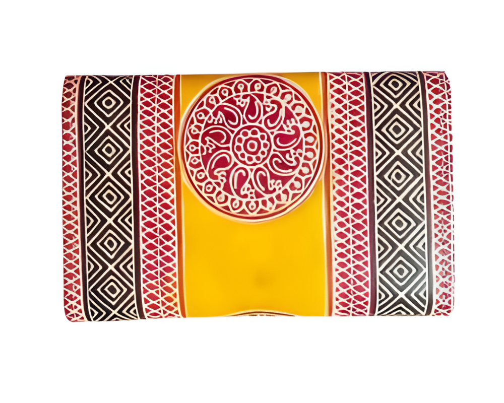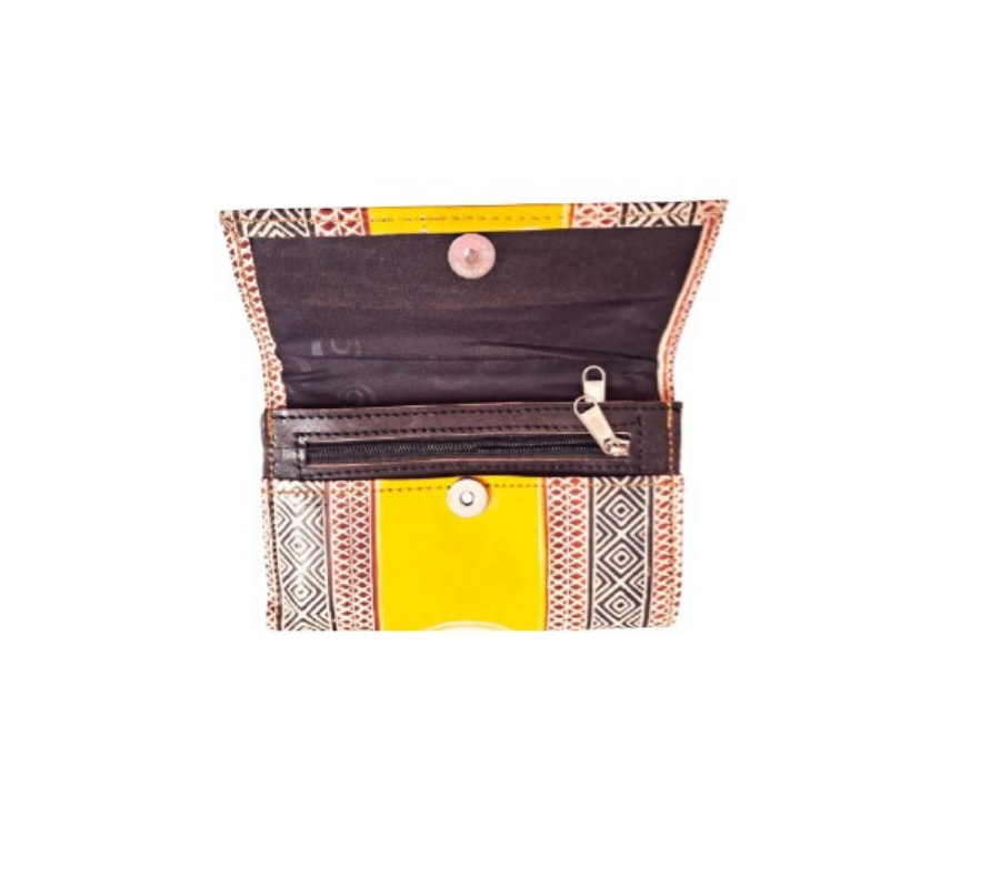 This purse is a classic example of age old Shantiniketan craft. It was introduced in West Bengal, India during the 1940s. The traditional motifs used for These Shantiniketan bags depict the rich cultural heritage of India. It derives its name from the place where it was first introduced – Shantiniketan. The Shantiniketan style evolved as a result of the Art Movement. These products have now become world famous for their applique, batik and embossed craft work. Moreover the process of burnishing the leather gives it an elegant sheen and brings out the colors. The embossing craft is an intricate process. After the final leather is made, it is then stitched into the desired product . Finally the product is coated with a lacquer finish for making the product shiny and long lasting.