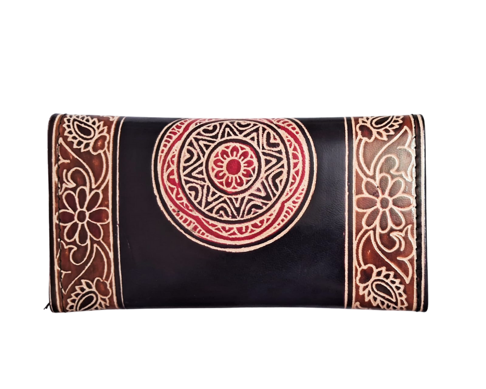 Crafted from genuine leather, this purse showcases the iconic Shantiniketan artistry with traditional embossed motifs on both sides. The leather is carefully burnished for a rich, glossy finish that enhances the intricate details. With a practical zip closure and multiple compartments, this purse combines style with functionality. A testament to the rich cultural legacy of West Bengal, it is a perfect blend of tradition and modernity.