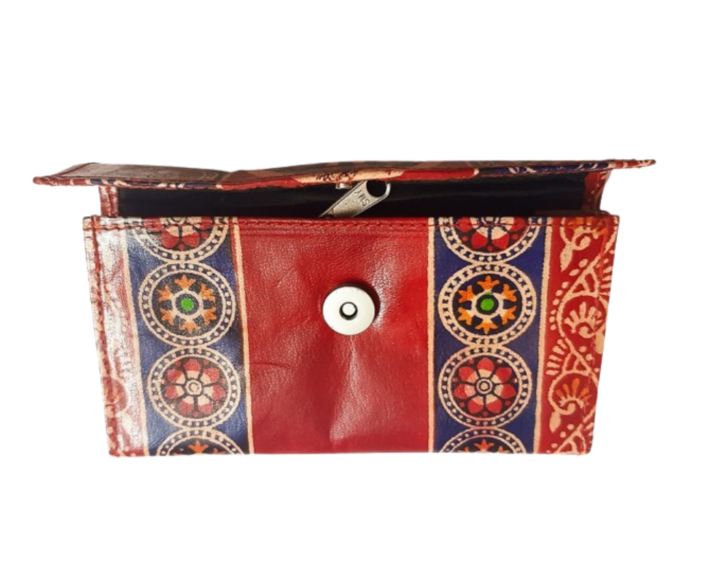 This purse is a classic example of age old Shantiniketan craft. It was introduced in West Bengal, India during the 1940s. The traditional motifs used for These Shantiniketan bags depict the rich cultural heritage of India. It derives its name from the place where it was first introduced – Shantiniketan. The Shantiniketan style evolved as a result of the Art Movement. These products have now become world famous for their applique, batik and embossed craft work. Moreover the process of burnishing the leather gives it an elegant sheen and brings out the colors. The embossing craft is an intricate process. After the final leather is made, it is then stitched into the desired product . Finally the product is coated with a lacquer finish for making the product shiny and long lasting.