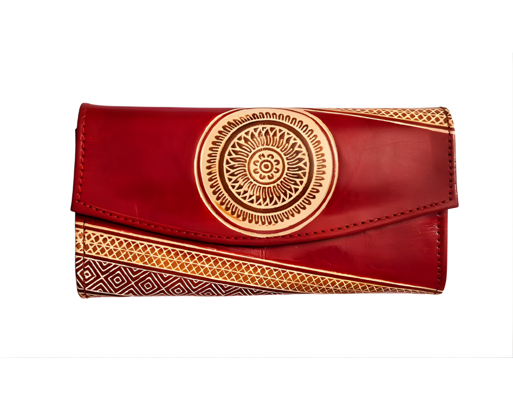 Crafted from genuine leather, this purse showcases the iconic Shantiniketan artistry with traditional embossed motifs on both sides. The leather is carefully burnished for a rich, glossy finish that enhances the intricate details. With a practical zip closure and multiple compartments, this purse combines style with functionality. A testament to the rich cultural legacy of West Bengal, it is a perfect blend of tradition and modernity.