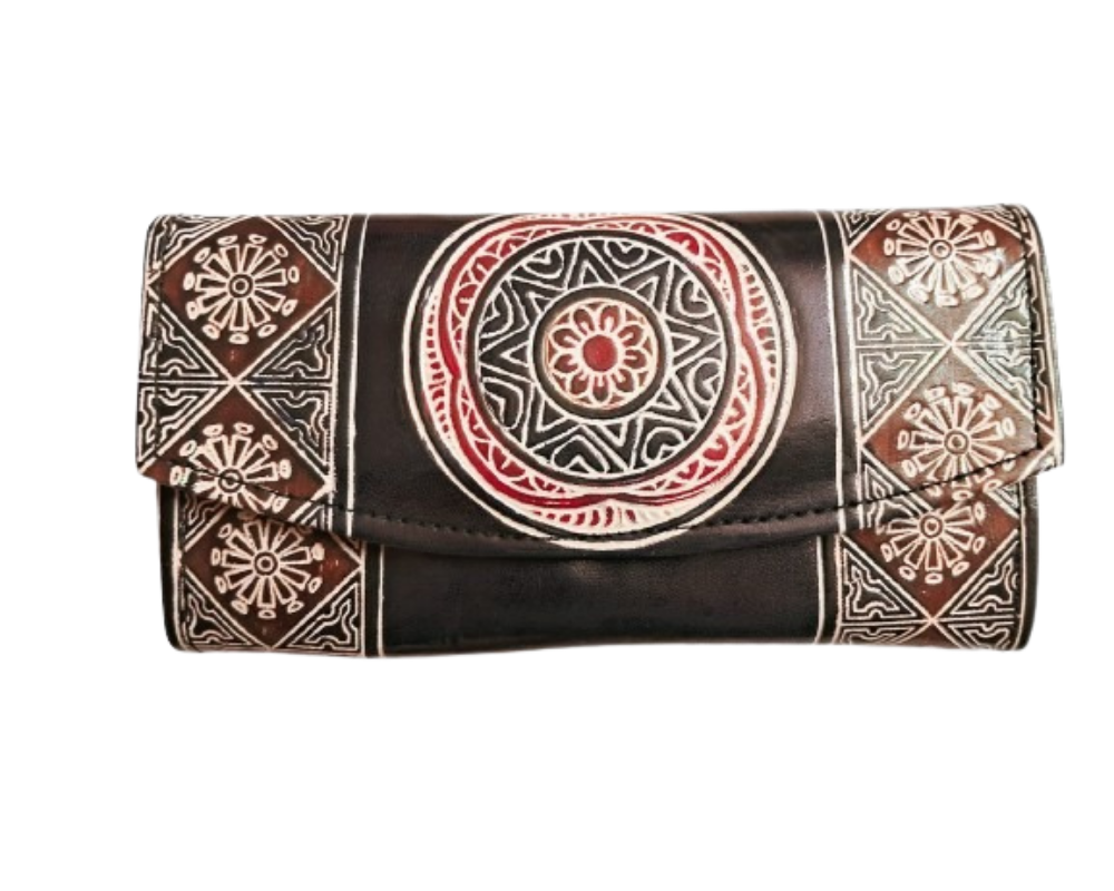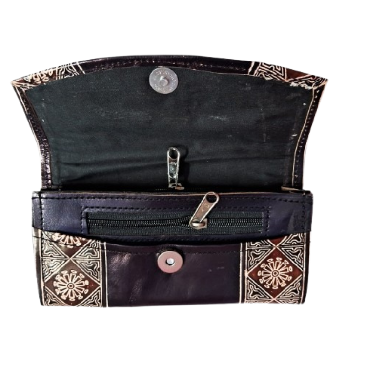 Crafted from genuine leather, this purse showcases the iconic Shantiniketan artistry with traditional embossed motifs on both sides. The leather is carefully burnished for a rich, glossy finish that enhances the intricate details. With a practical zip closure and multiple compartments, this purse combines style with functionality. A testament to the rich cultural legacy of West Bengal, it is a perfect blend of tradition and modernity.