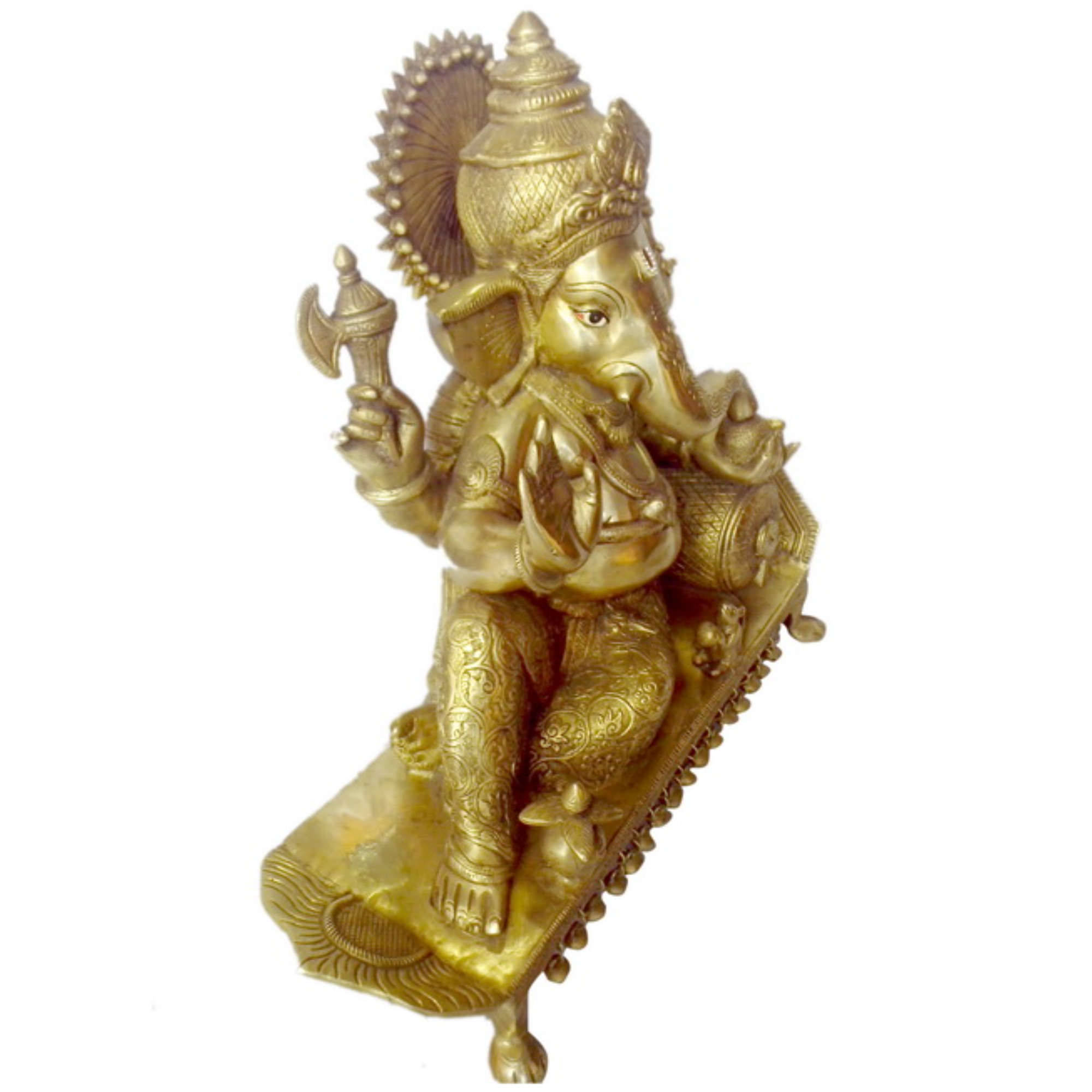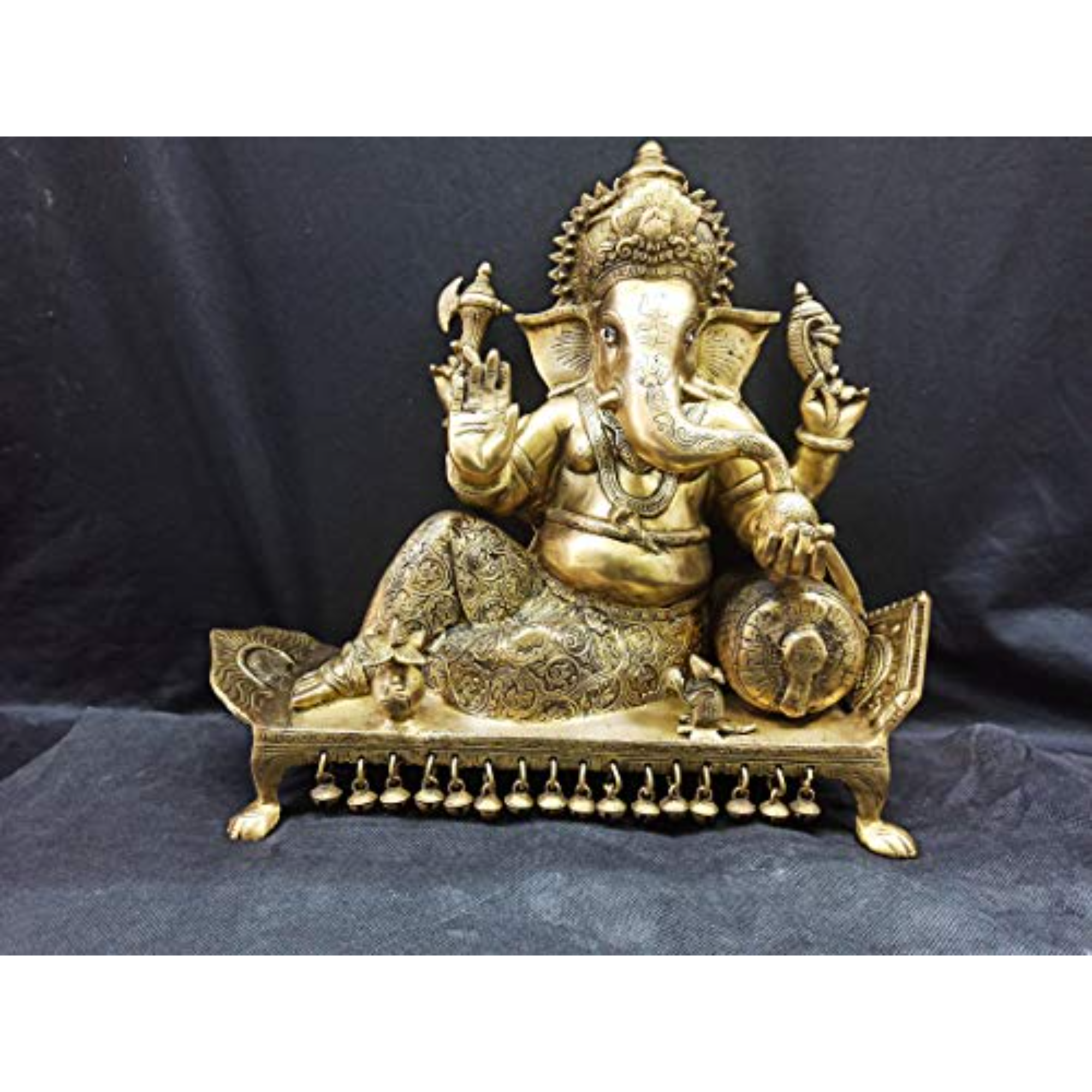 Design: Intricately sculpted large brass idol of Lord Ganesha seated on a decorative pillow, symbolizing wisdom, prosperity, and divine grace.