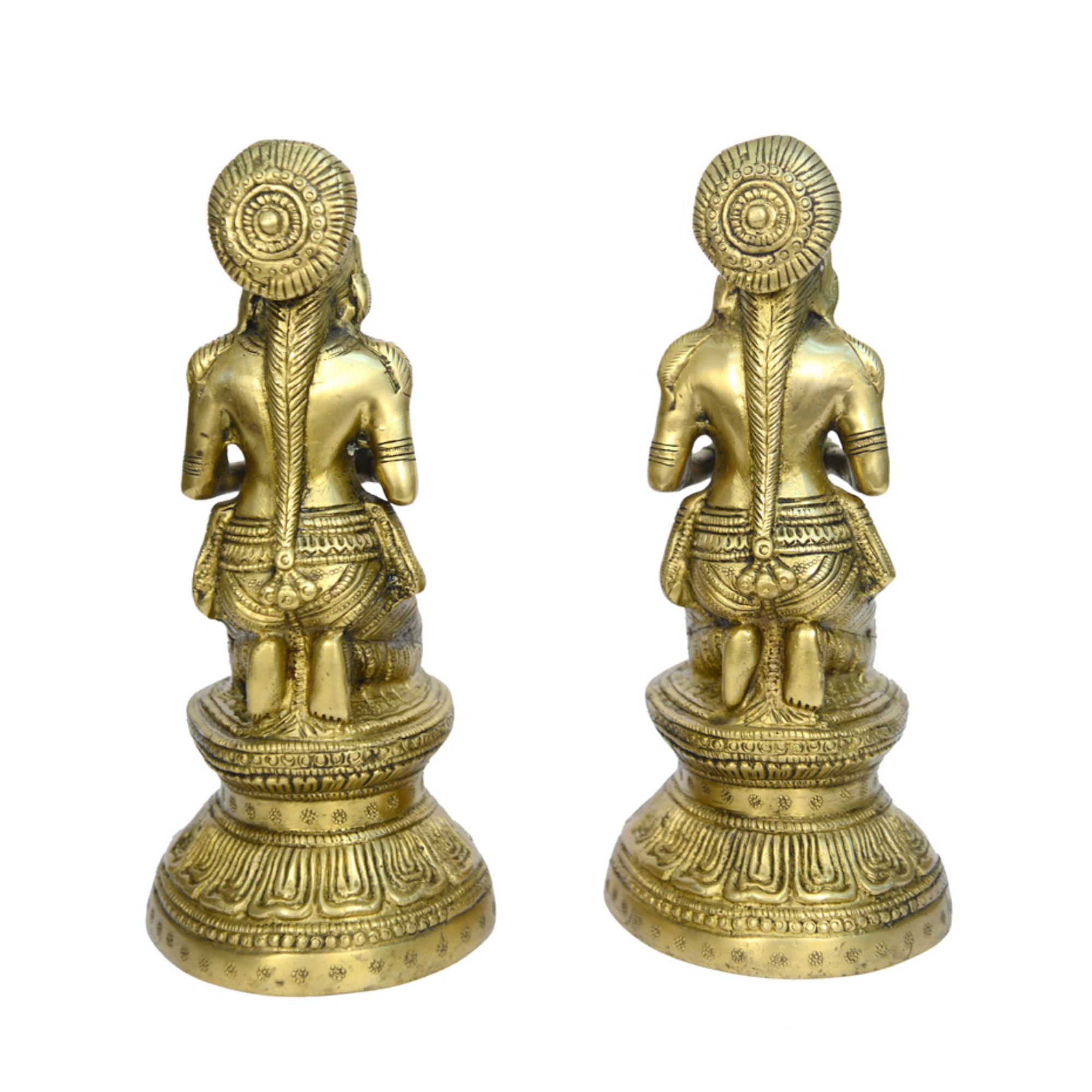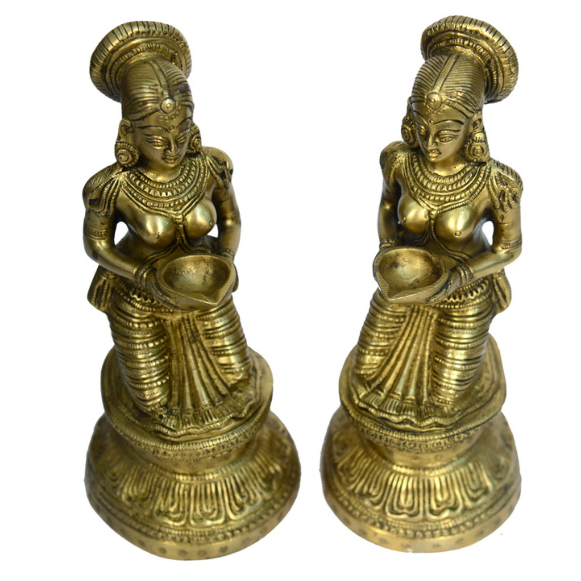 Design: Handcrafted pair of Divi Ladies holding oil lamps, beautifully adorned with detailed flower motifs in a seated posture, perfect for spiritual and decorative purposes.