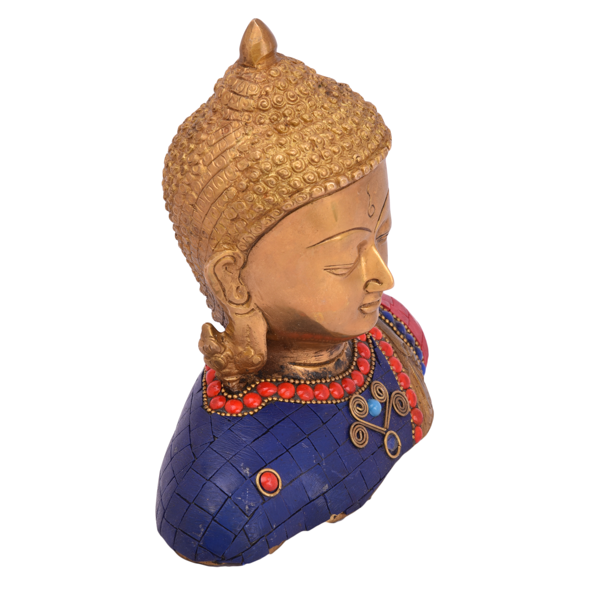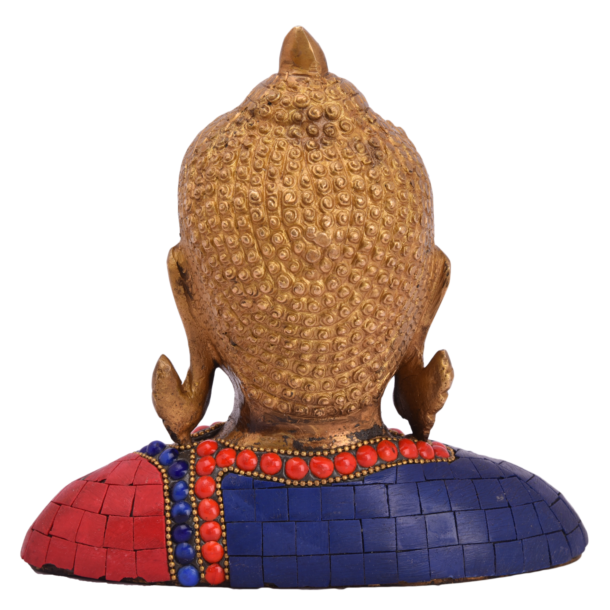 Design: Handcrafted medium-sized brass Buddha statue in half posture with intricate stone inlay, symbolizing peace, mindfulness, and spiritual balance.