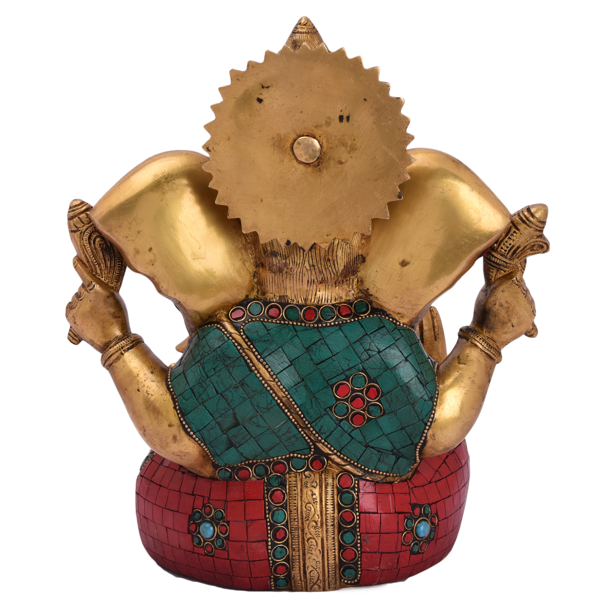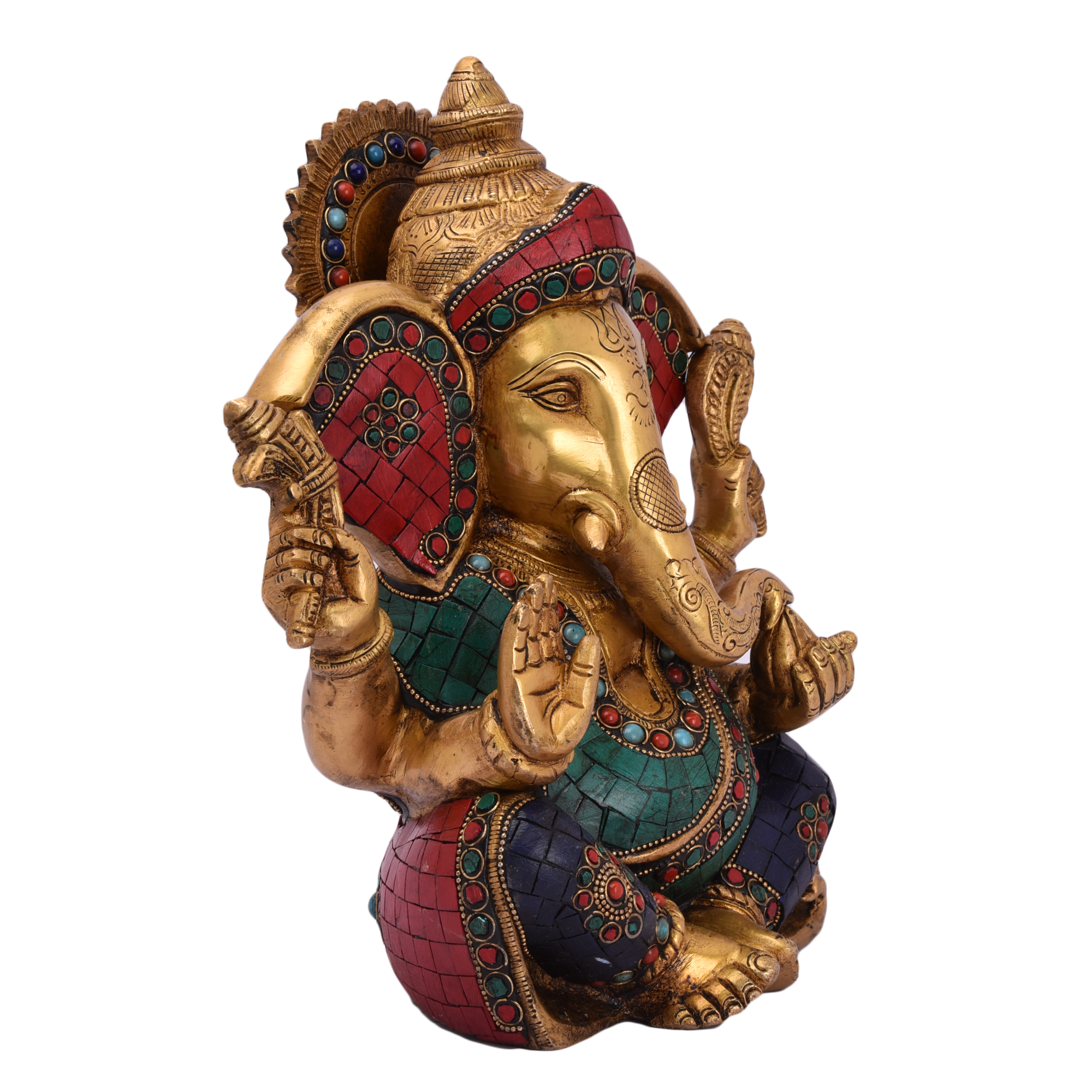Design: Handcrafted medium-sized brass Ganesh statue in a sitting posture with prominent big ears and intricate stone inlay, symbolizing wisdom, prosperity, and positivity.