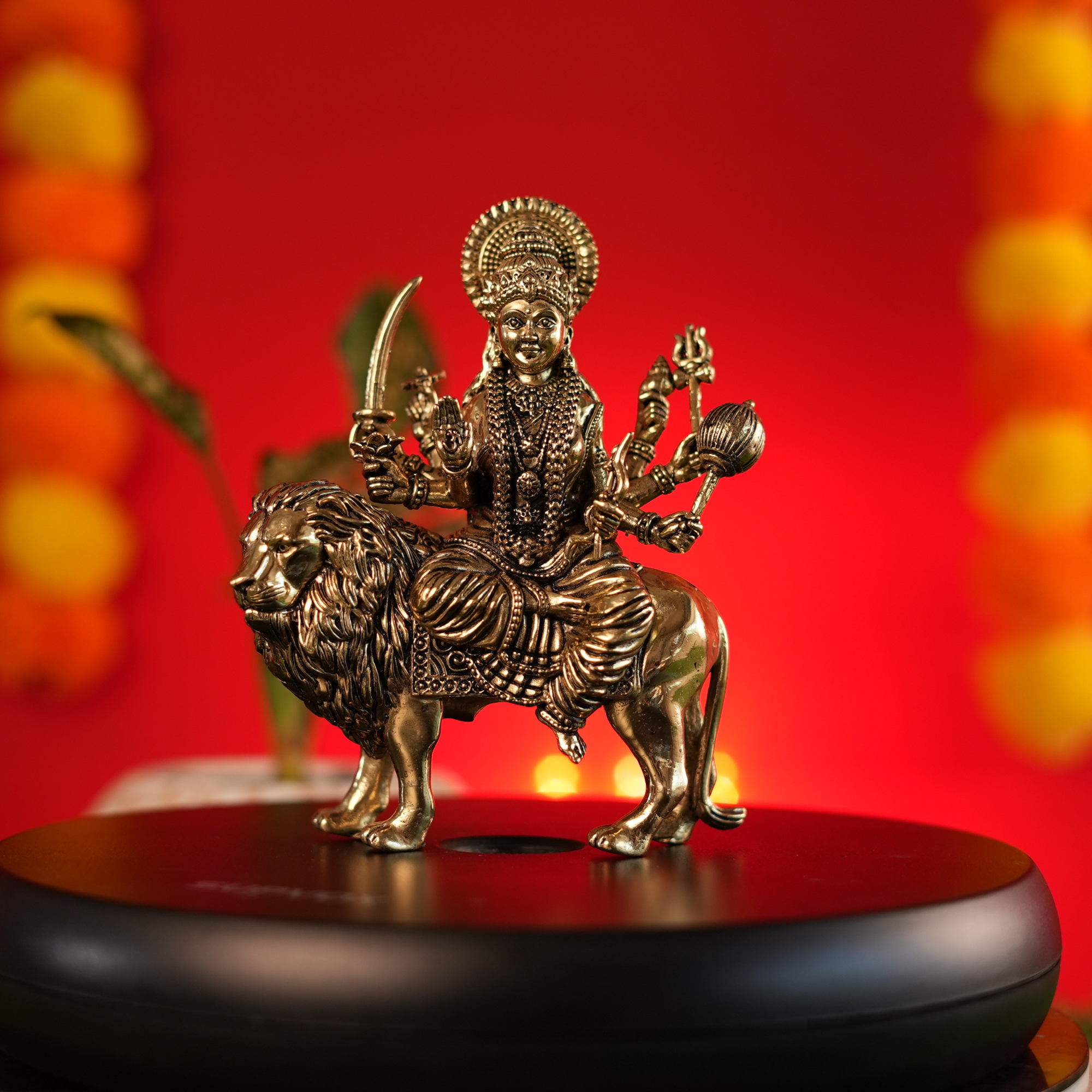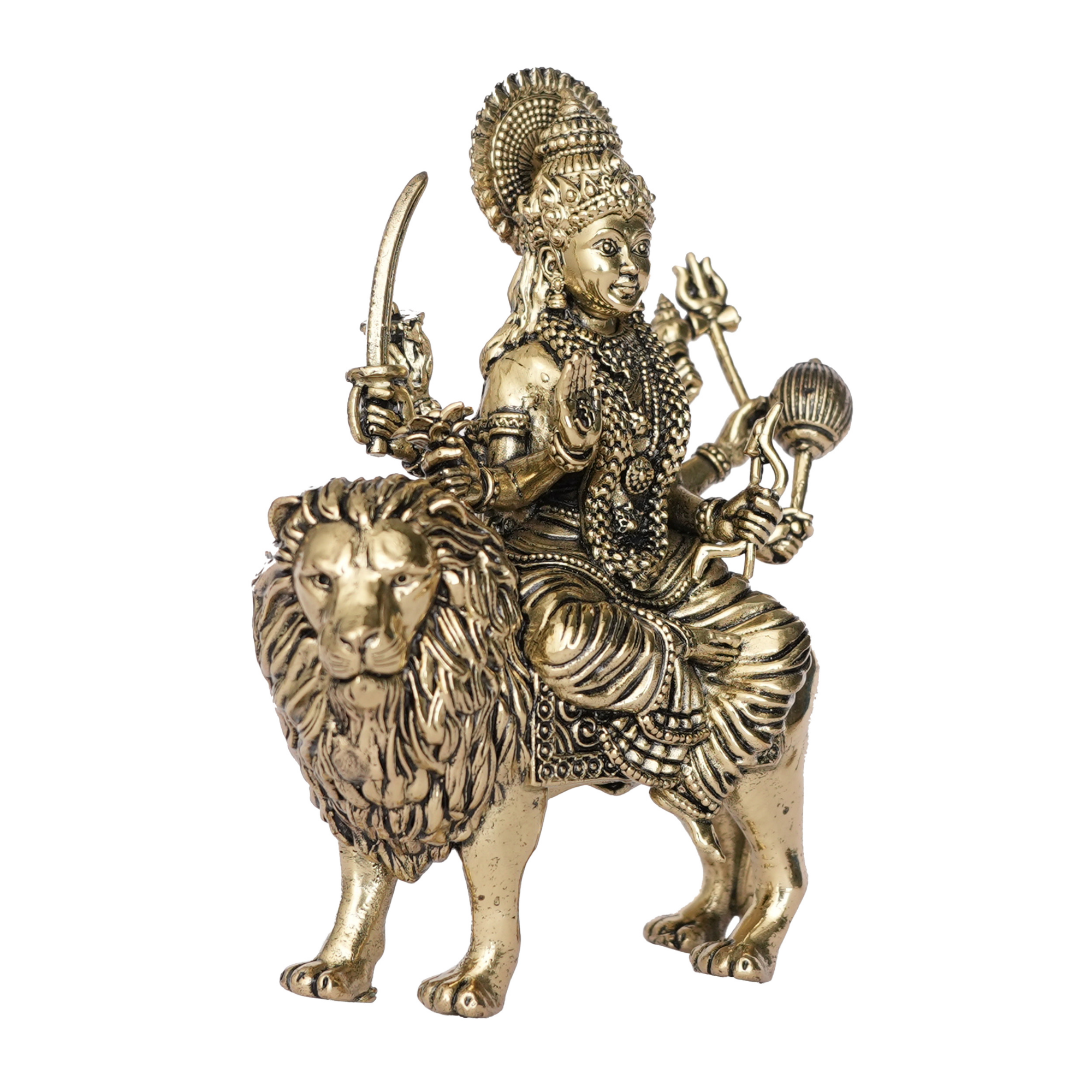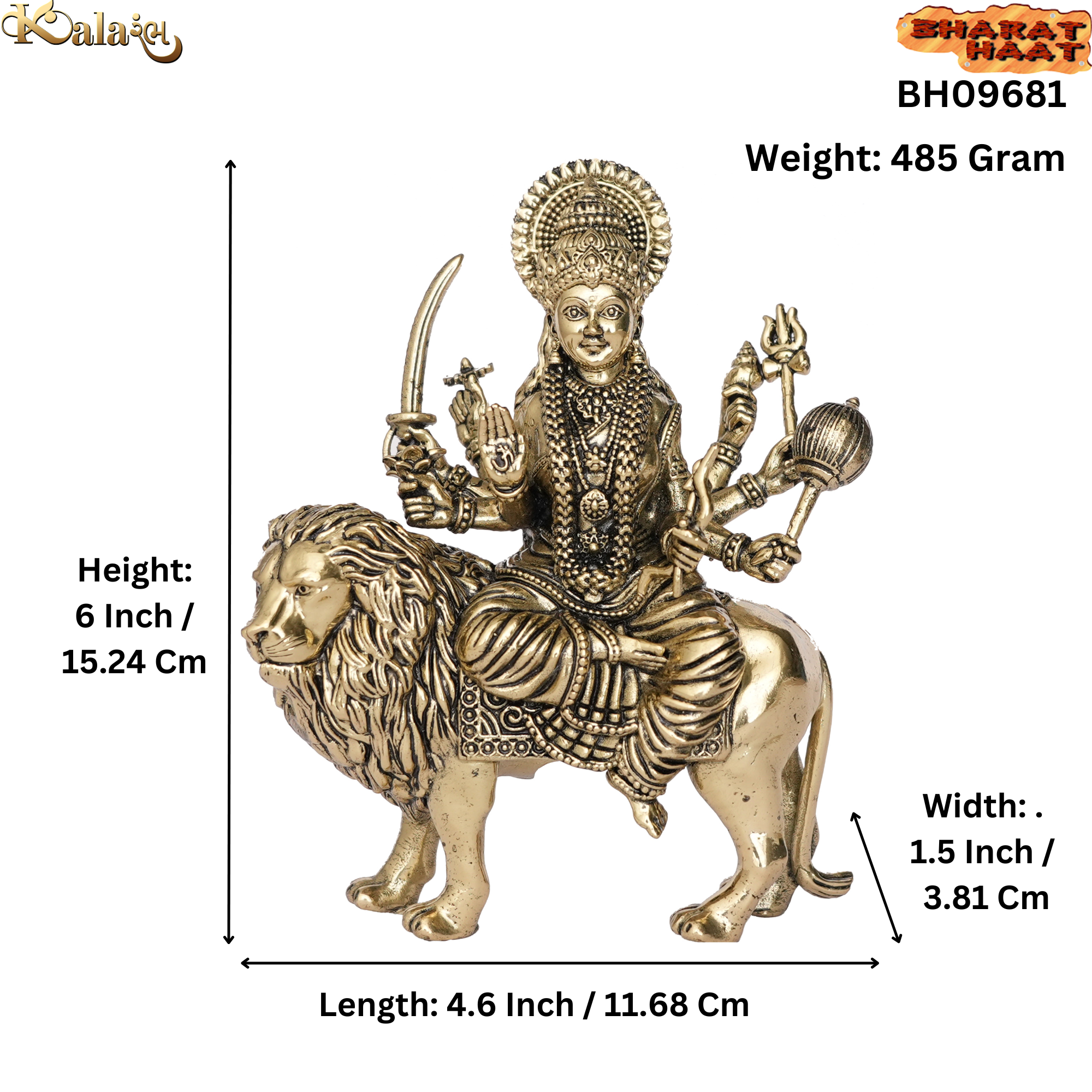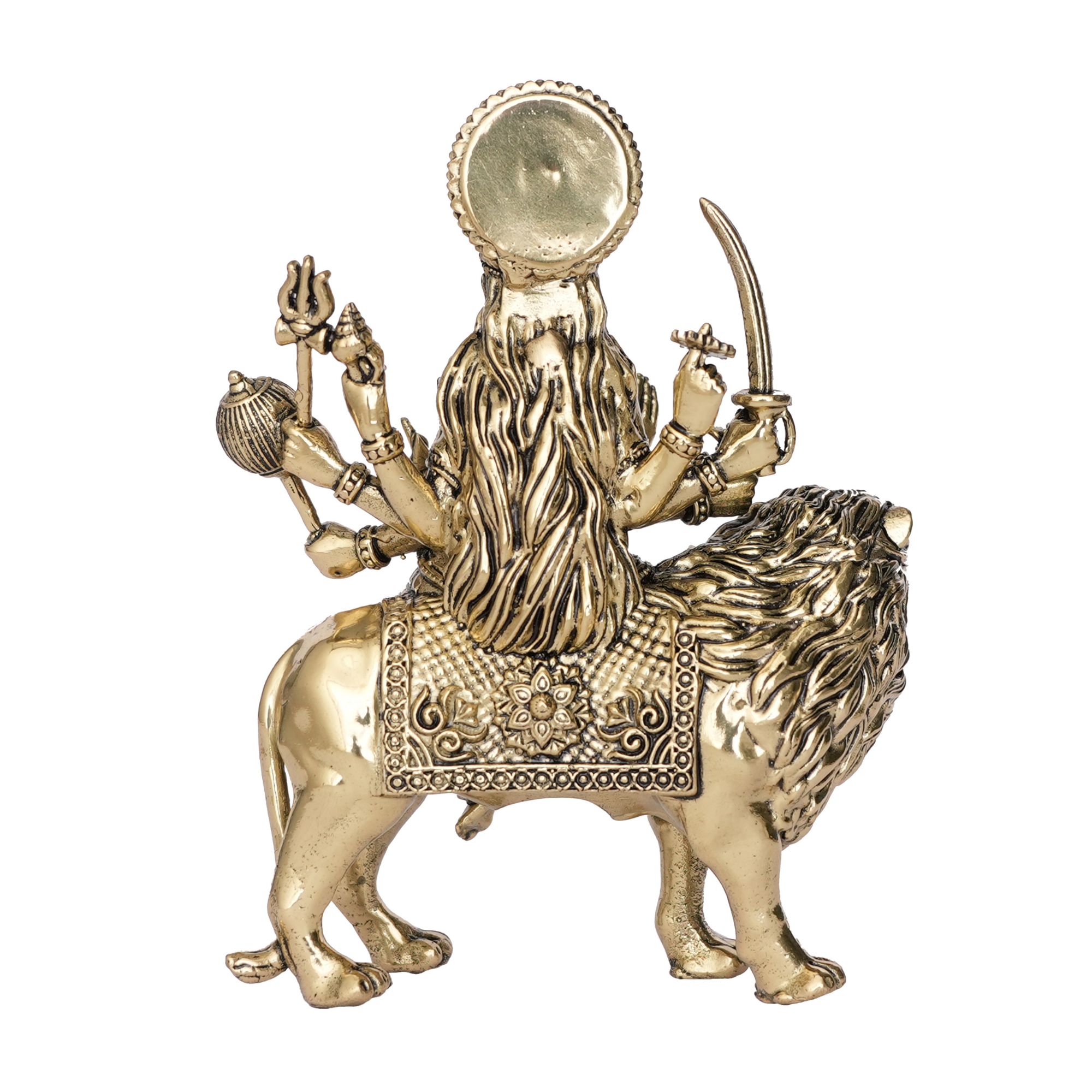 With dimensions of 4.6 x 1.5 x 6 inches (11.68 x 3.81 x 15.24 cm) and a weight of 485 grams, this idol is compact yet radiates a commanding spiritual presence. The detailed carvings, from the goddess’s expressive features to her traditional ornaments and weapons, showcase the precision and skill of Indian artisans. The antique golden finish enhances its aesthetic appeal, adding a divine glow to any sacred space.