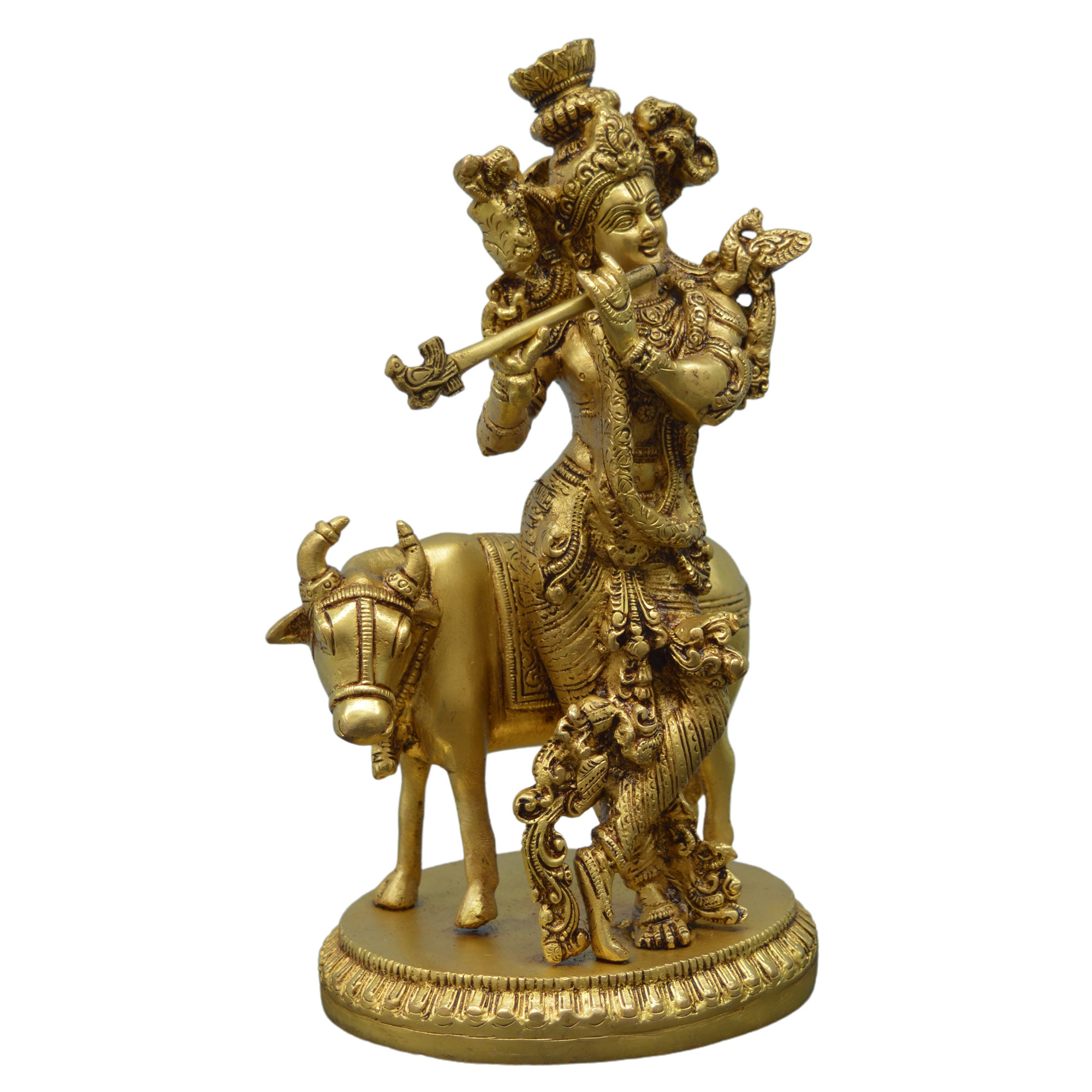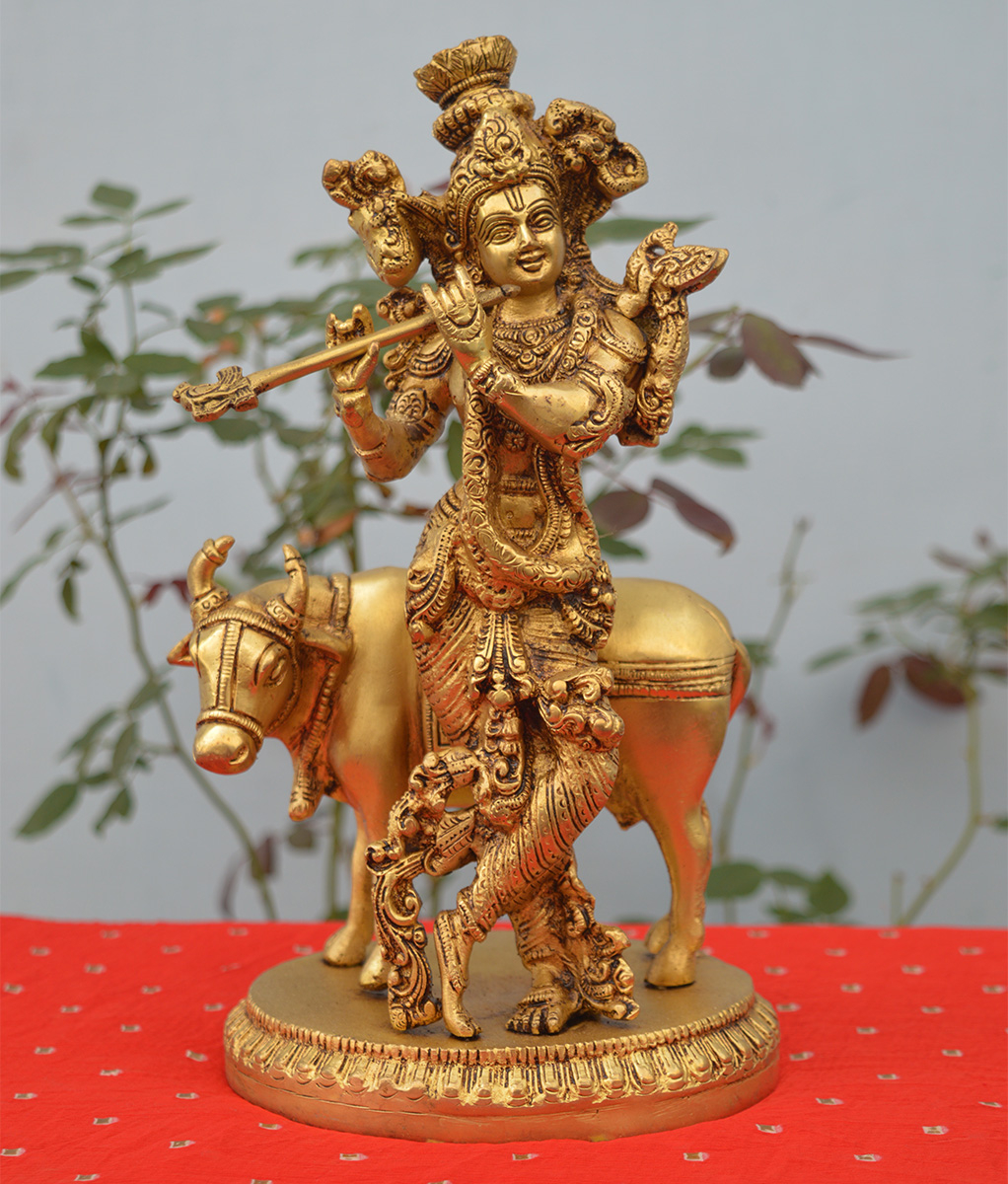 Design: The Brass Krishna with Cow sculpture captures a divine scene from Lord Krishna’s Gokul leela, where he stands gracefully beside his beloved cow.