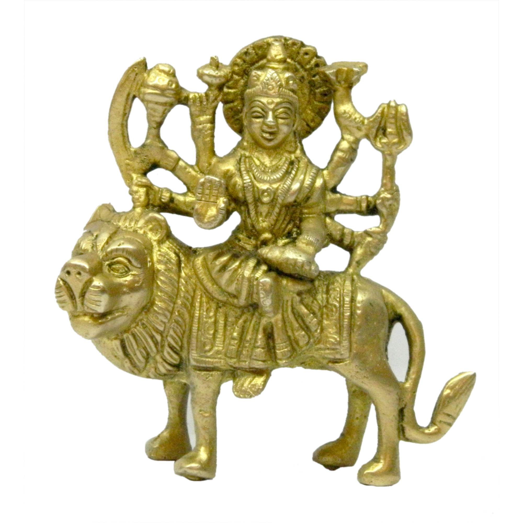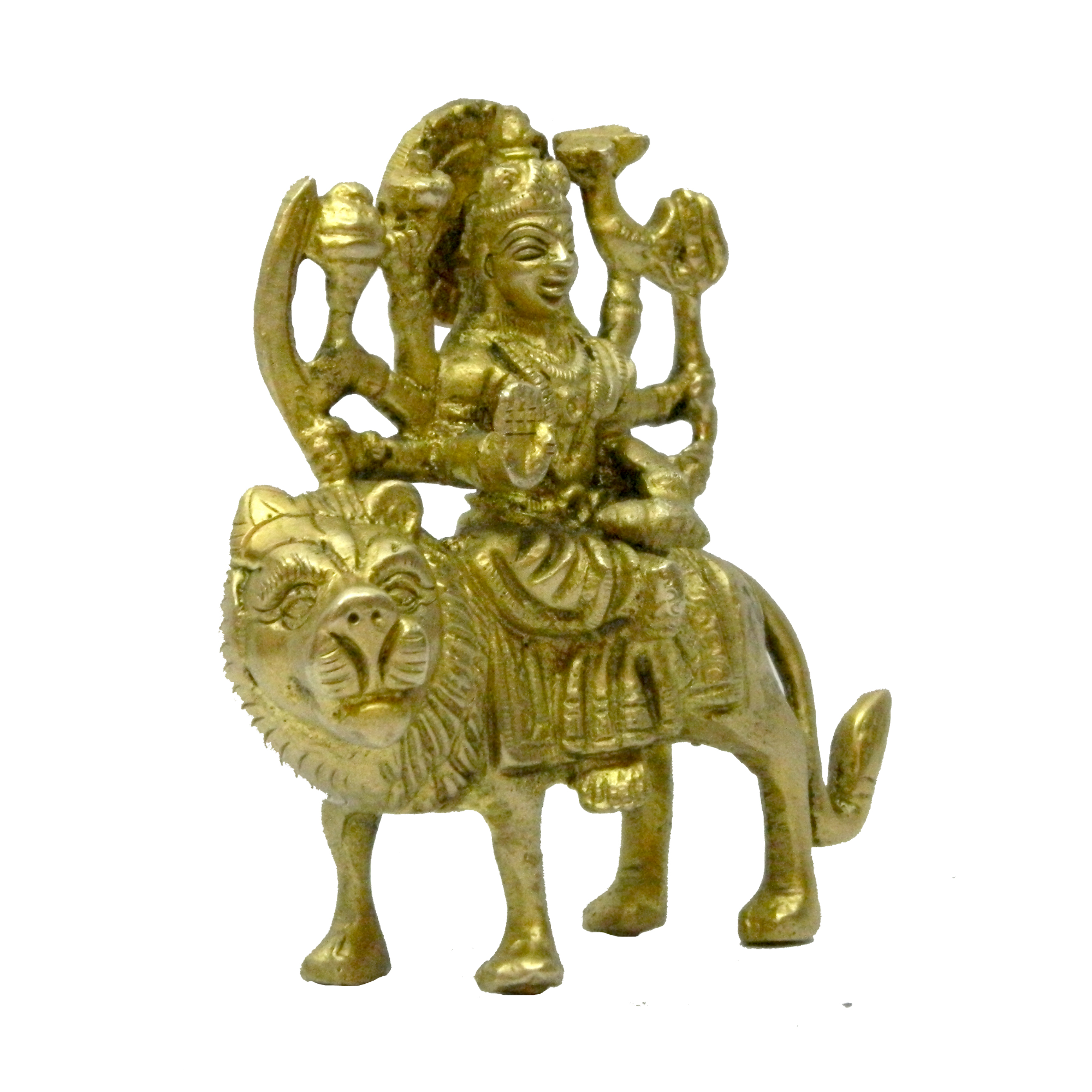 Design: This Brass Ambe Maa Idol showcases Goddess Durga seated majestically on her lion, holding divine weapons and blessing devotees with her raised hand.