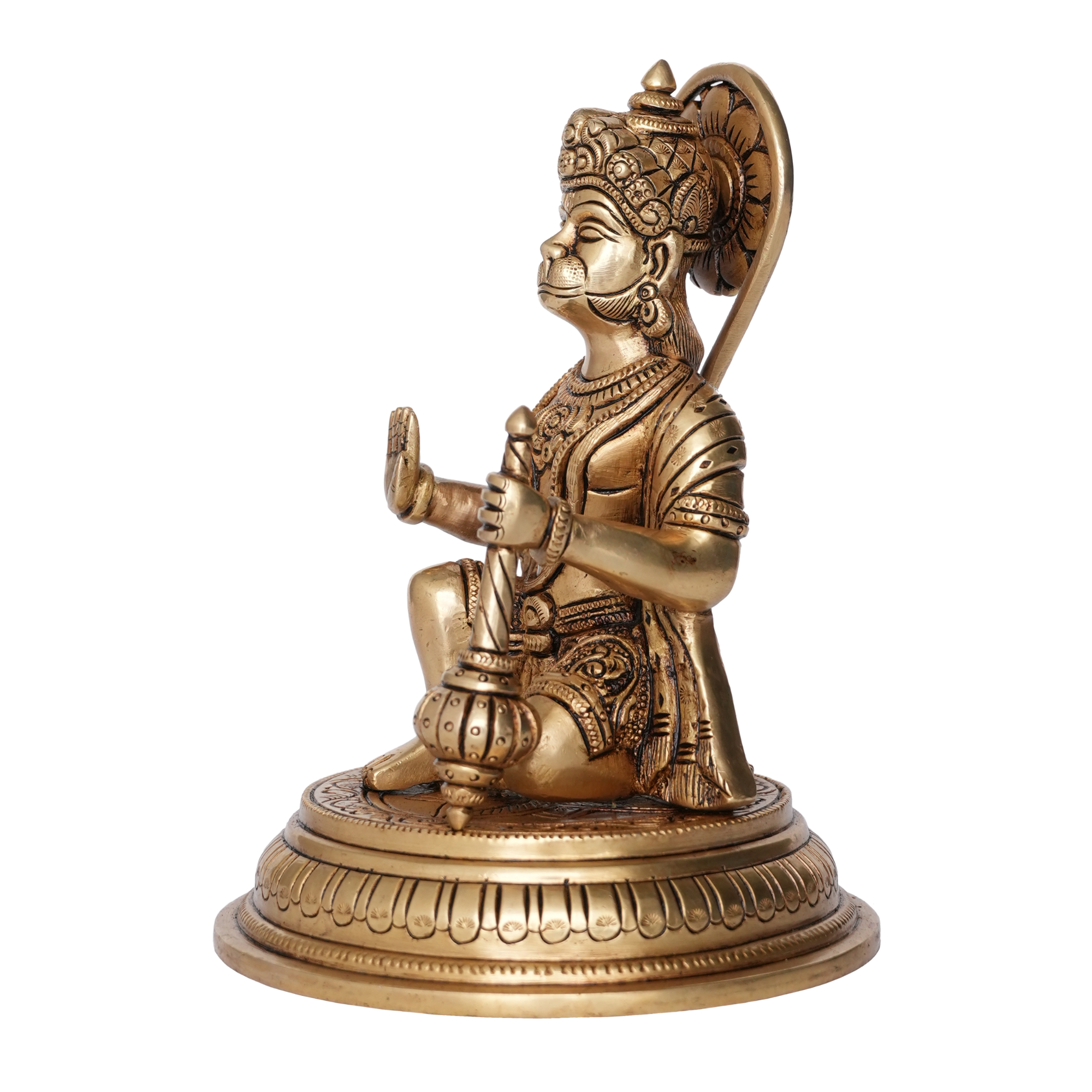 Expertly crafted from high-quality solid brass, this idol showcases intricate detailing and a radiant golden finish that reflects the brilliance of traditional Indian artistry. The powerful posture of Lord Hanuman, holding his Gada (mace), represents victory over evil and the triumph of truth and devotion.