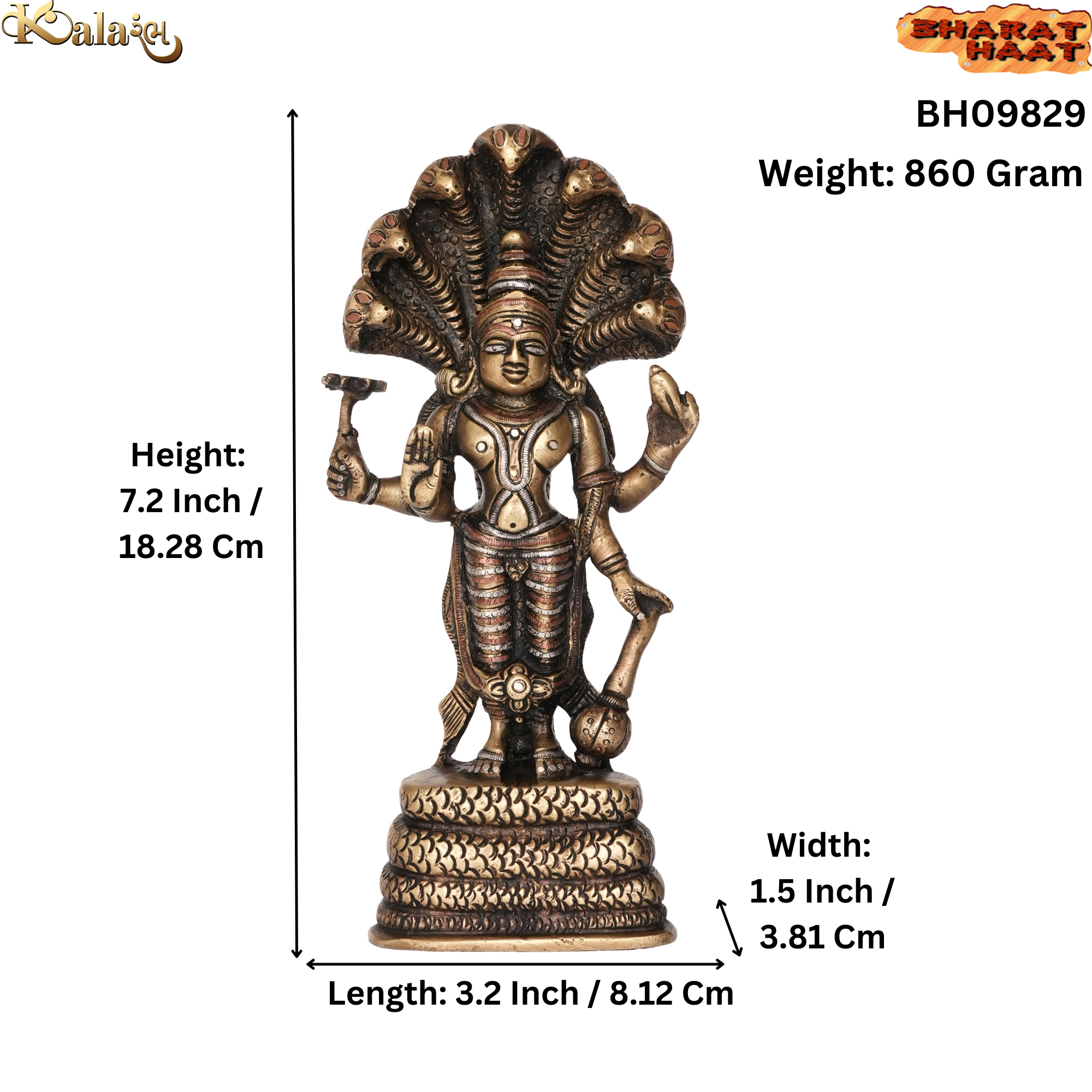 Expertly cast from 100% solid brass, this idol showcases remarkable detailing — from the divine ornaments and the sacred Shankha (conch) and Chakra (discus) to the serene expression of the Lord. The antique finish enhances its spiritual aura, making it a timeless piece of Indian artistry.