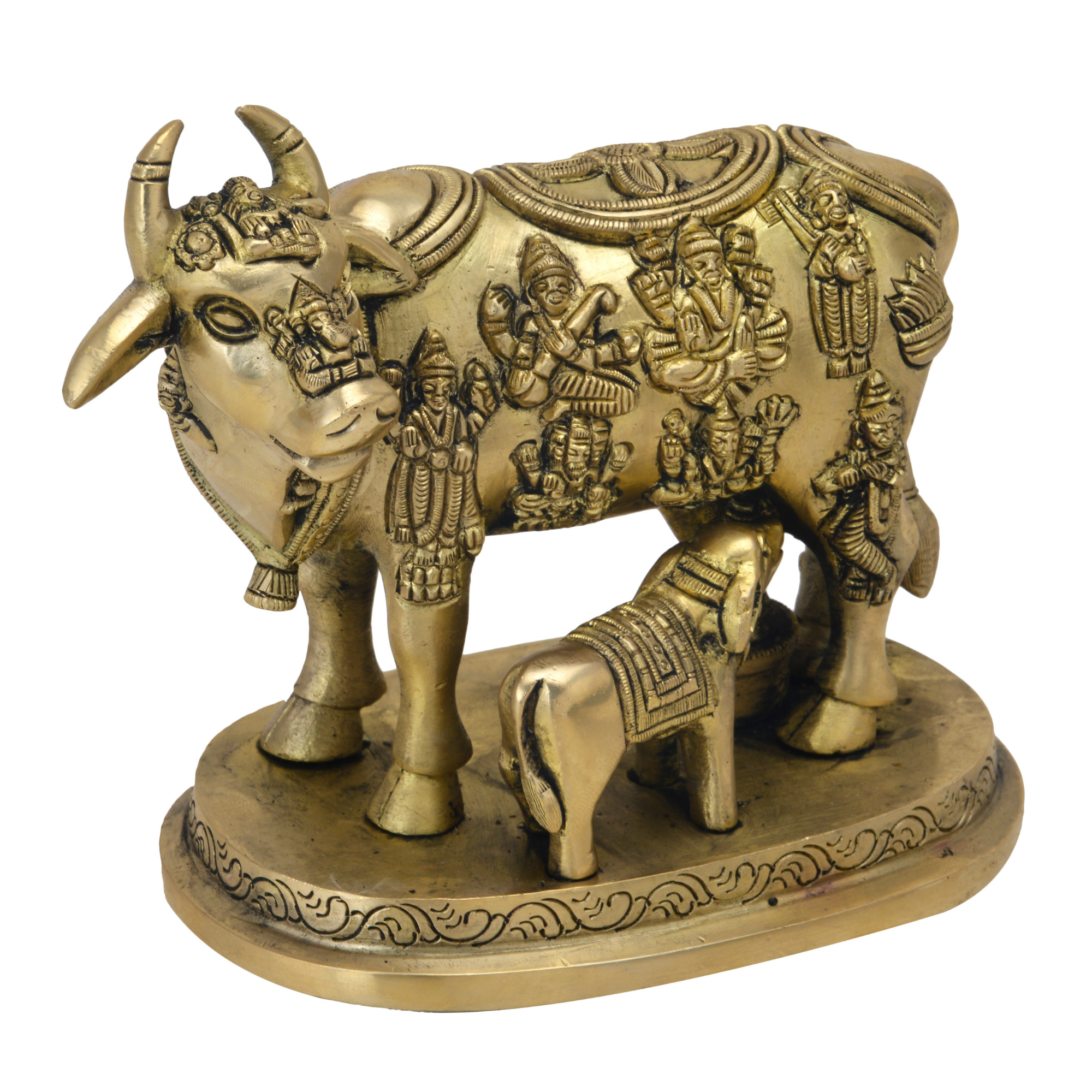 Design: Beautifully handcrafted brass statue of the divine cow Kamdhenu with her baby calf, symbolizing motherhood, purity, and prosperity.