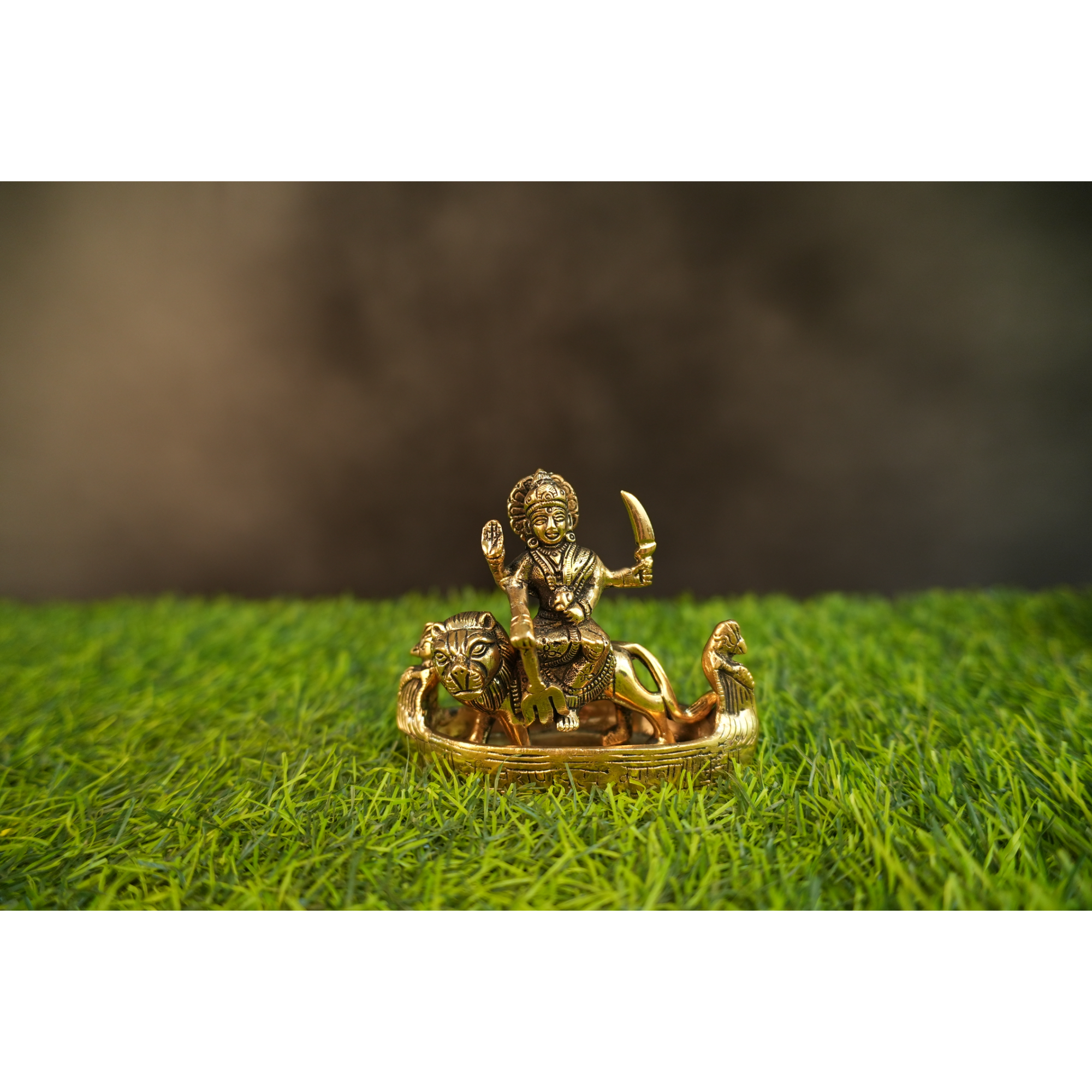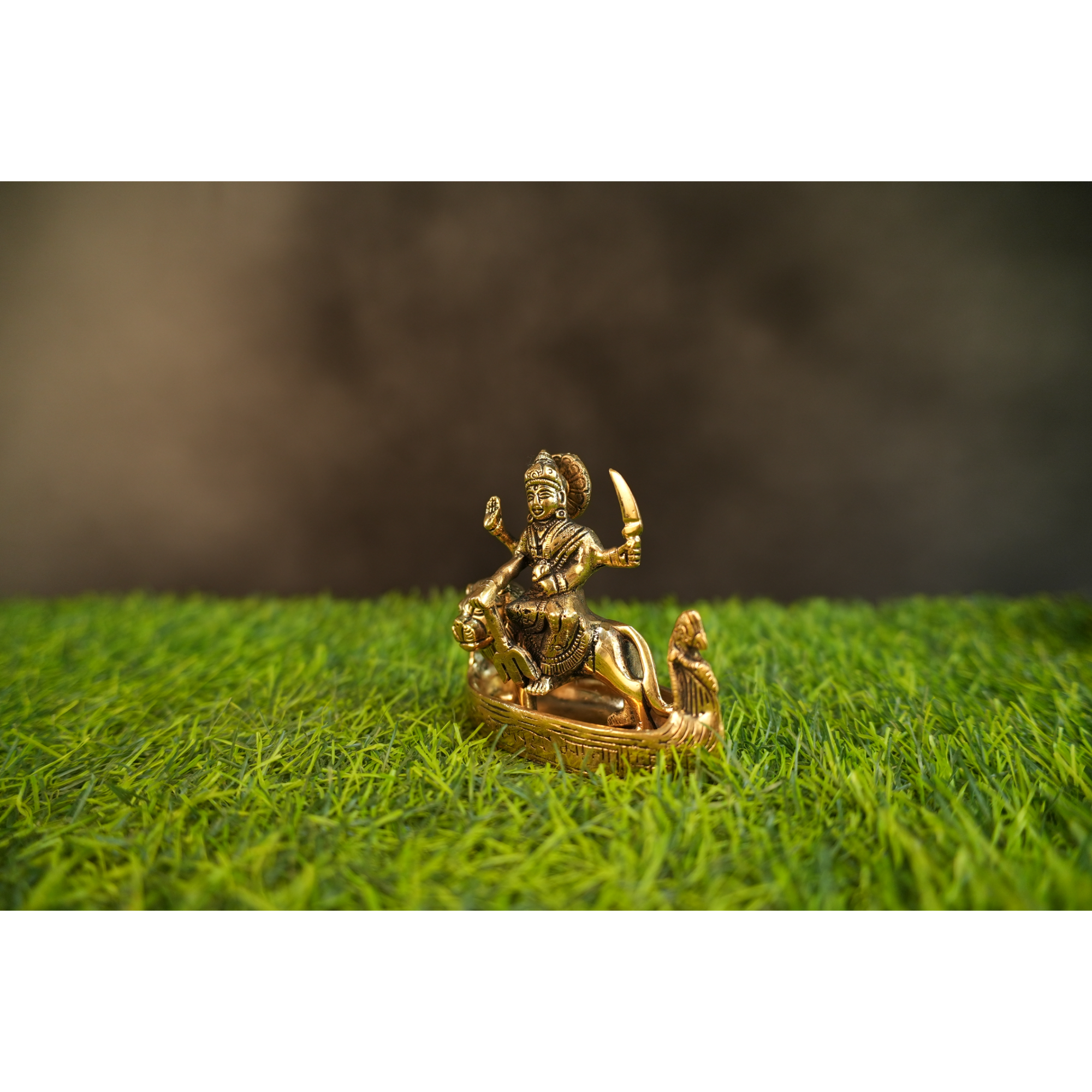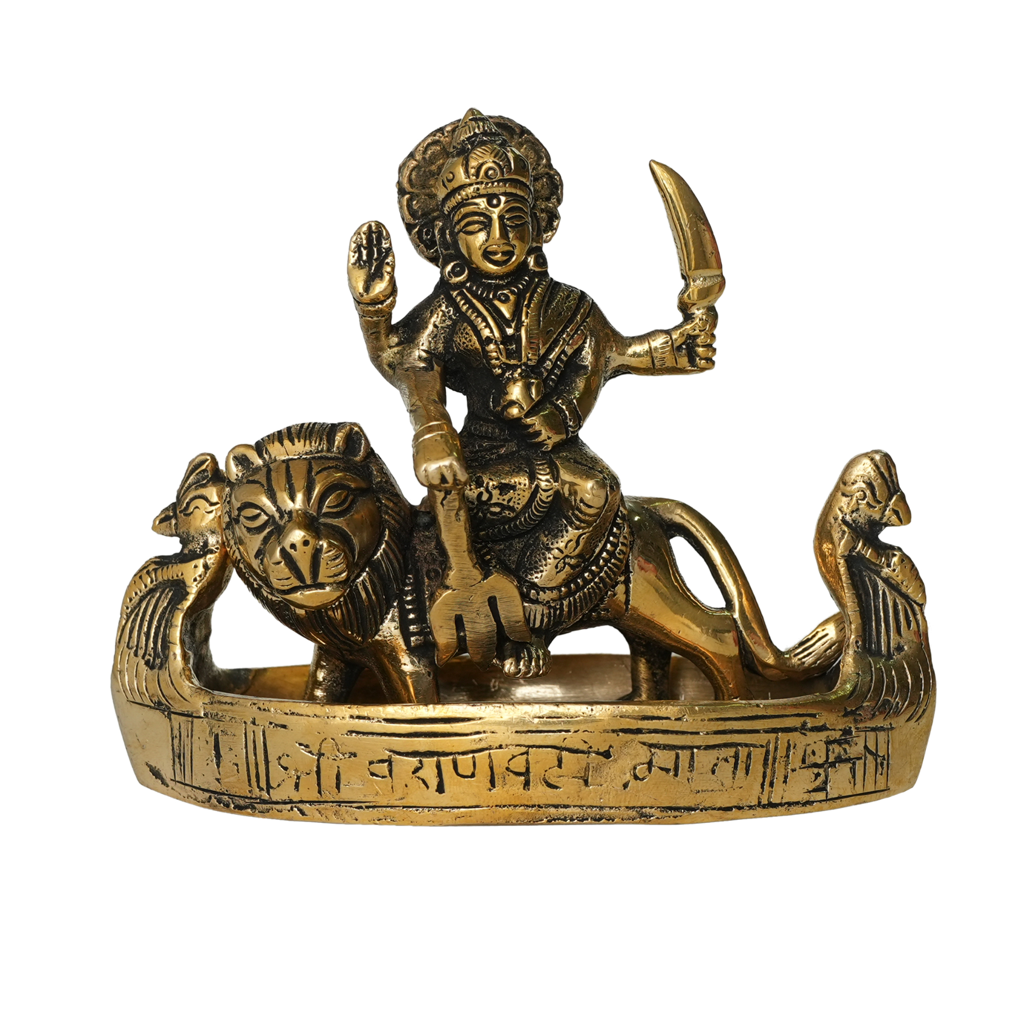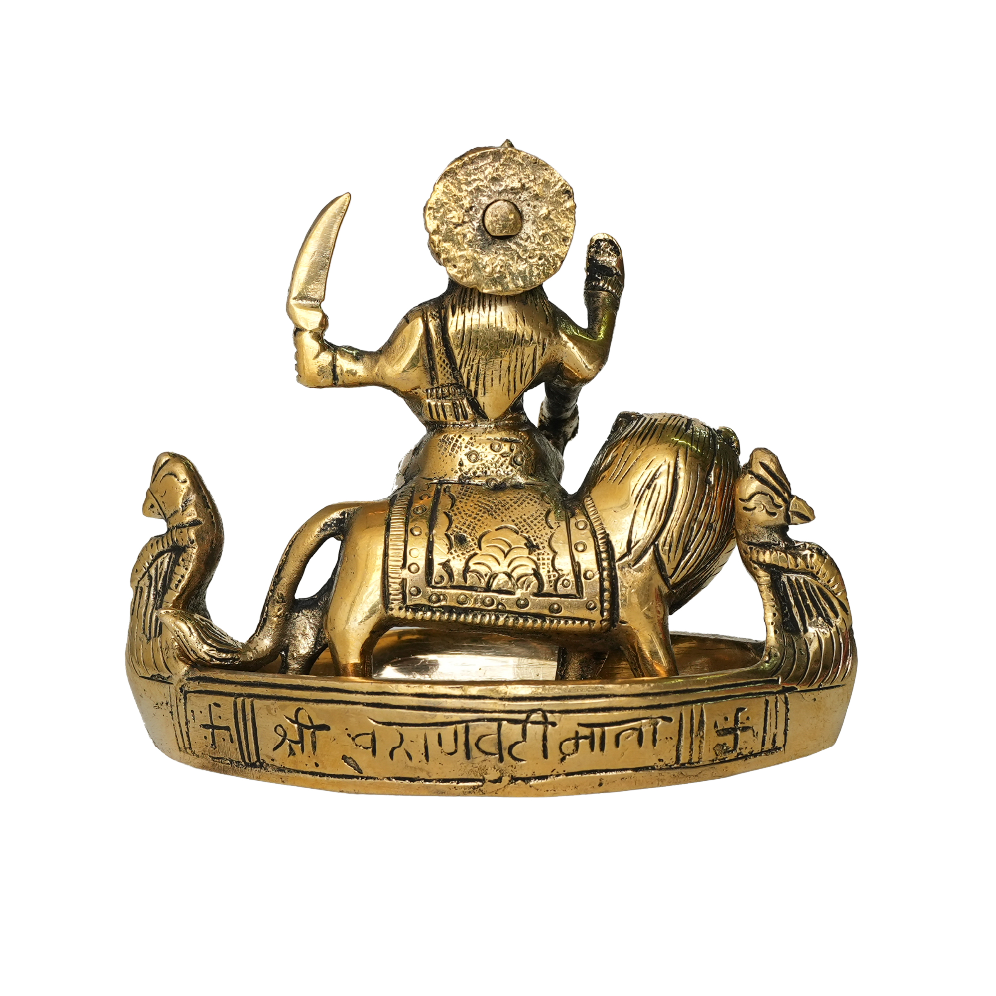 Expertly cast in pure solid brass, this beautiful idol measures 5 x 2 x 4.5 inches (12.7 x 5.08 x 11.43 cm) and weighs 950 grams, giving it a strong, durable, and premium presence. The exquisite detailing—from the goddess seated gracefully on her vahana (vehicle) to her divine ornaments and expressive features—showcases the master craftsmanship of skilled Indian artisans.