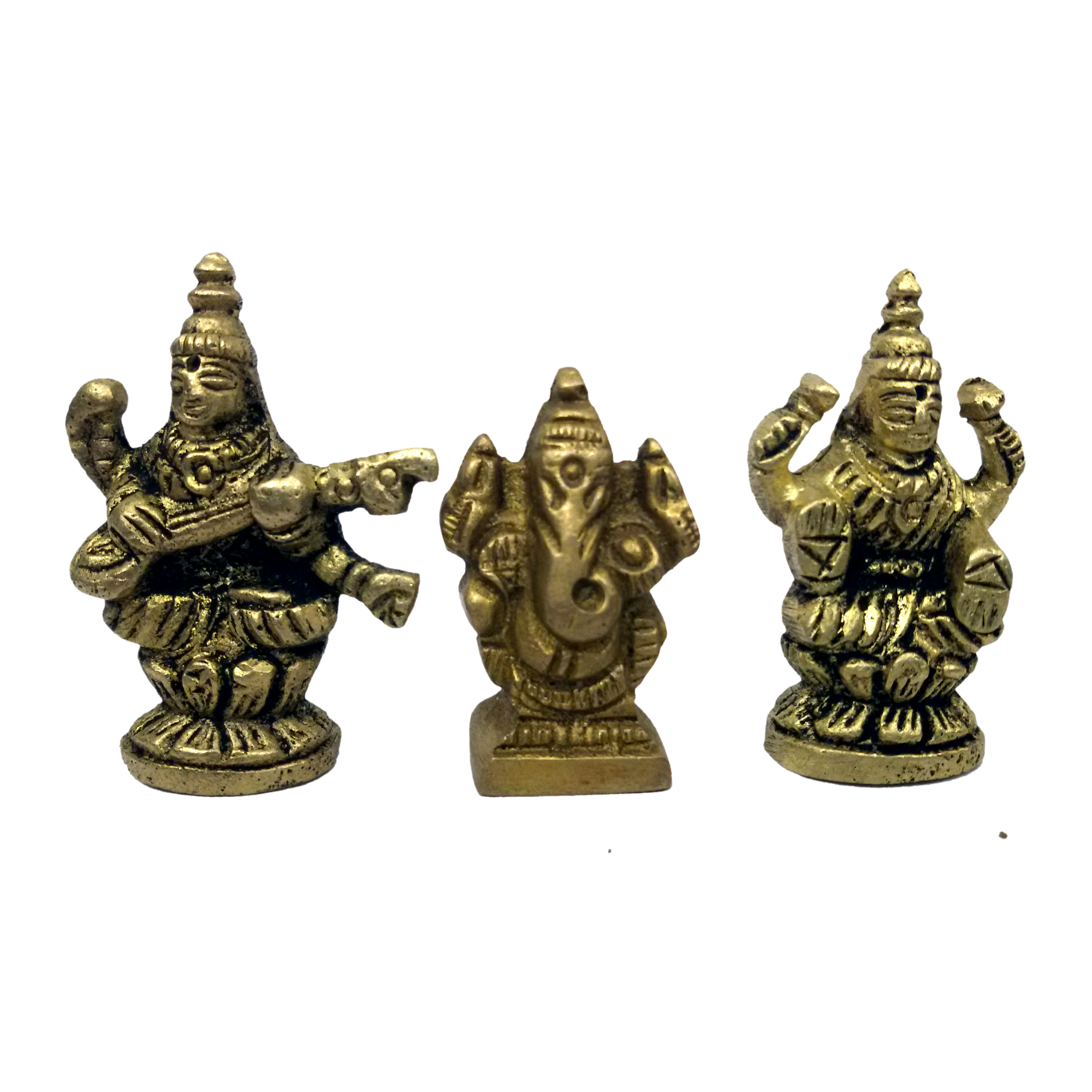 Design: Beautifully handcrafted brass idols of Lord Ganesha, Goddess Laxmi, and Goddess Saraswati symbolizing prosperity, knowledge, and good fortune.