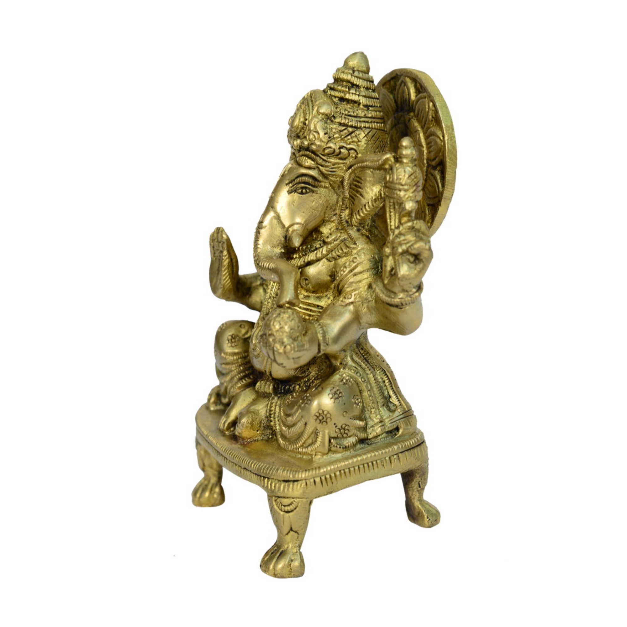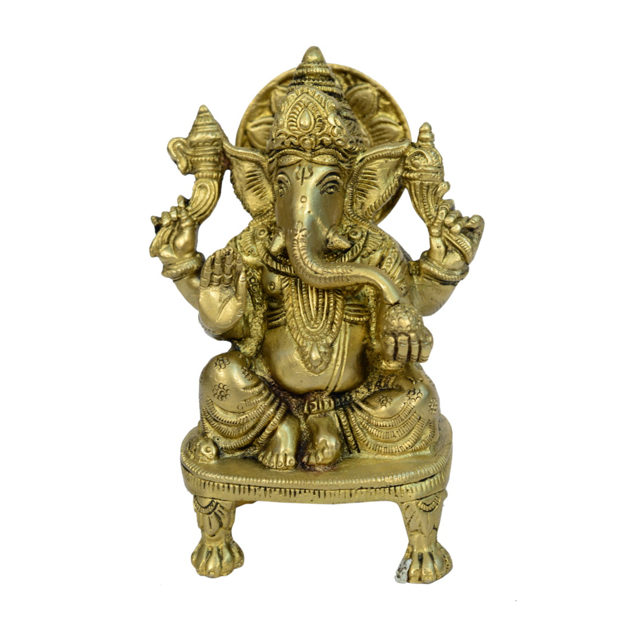 Exquisite Brass Sitting Ganesha on Bajath crafted with intricate detailing. A divine symbol of wisdom and success, ideal for home, office, or spiritual gifting.