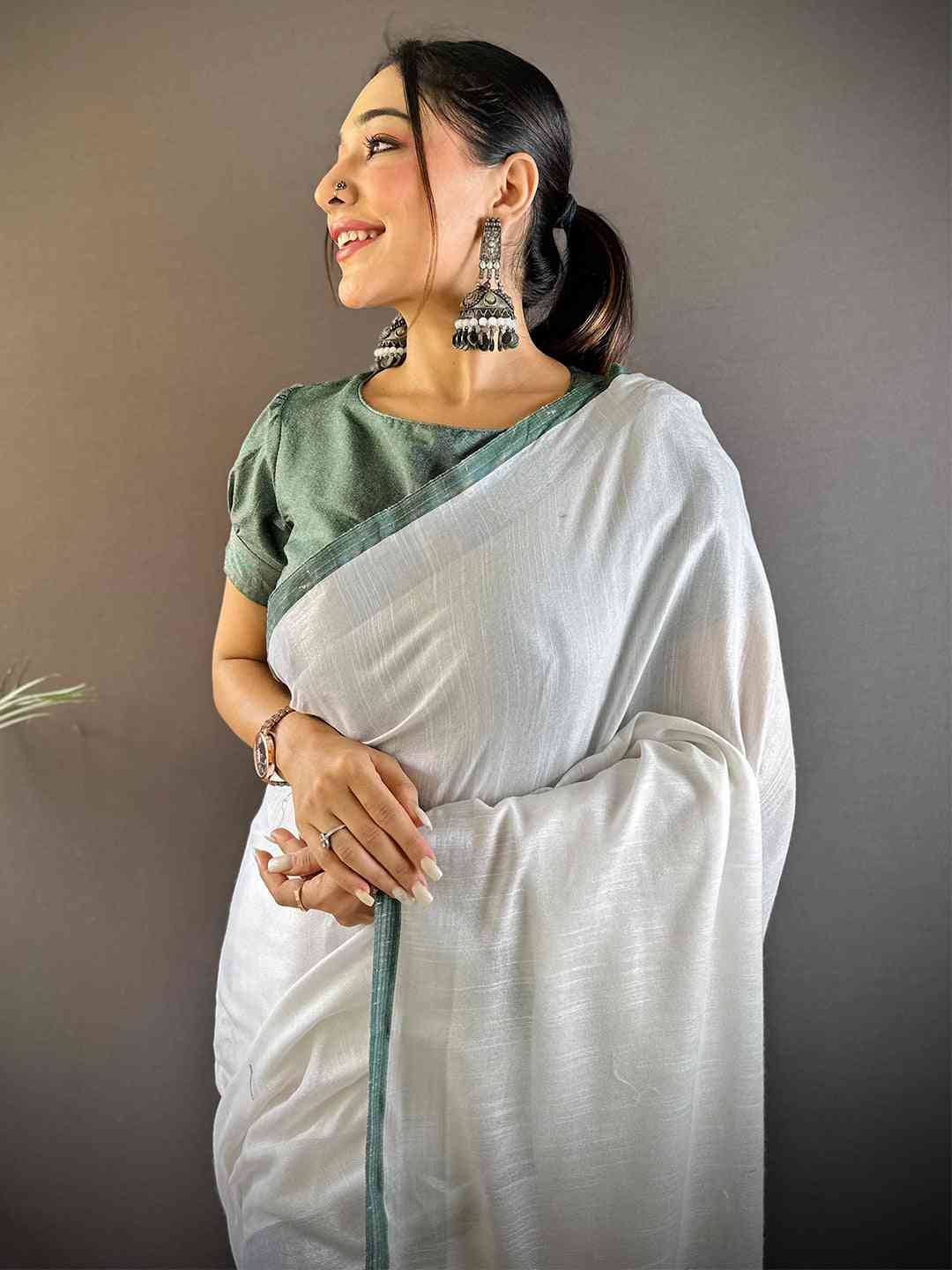 Elegant Semi Linen Saree with Silver Zari Border | White & Green